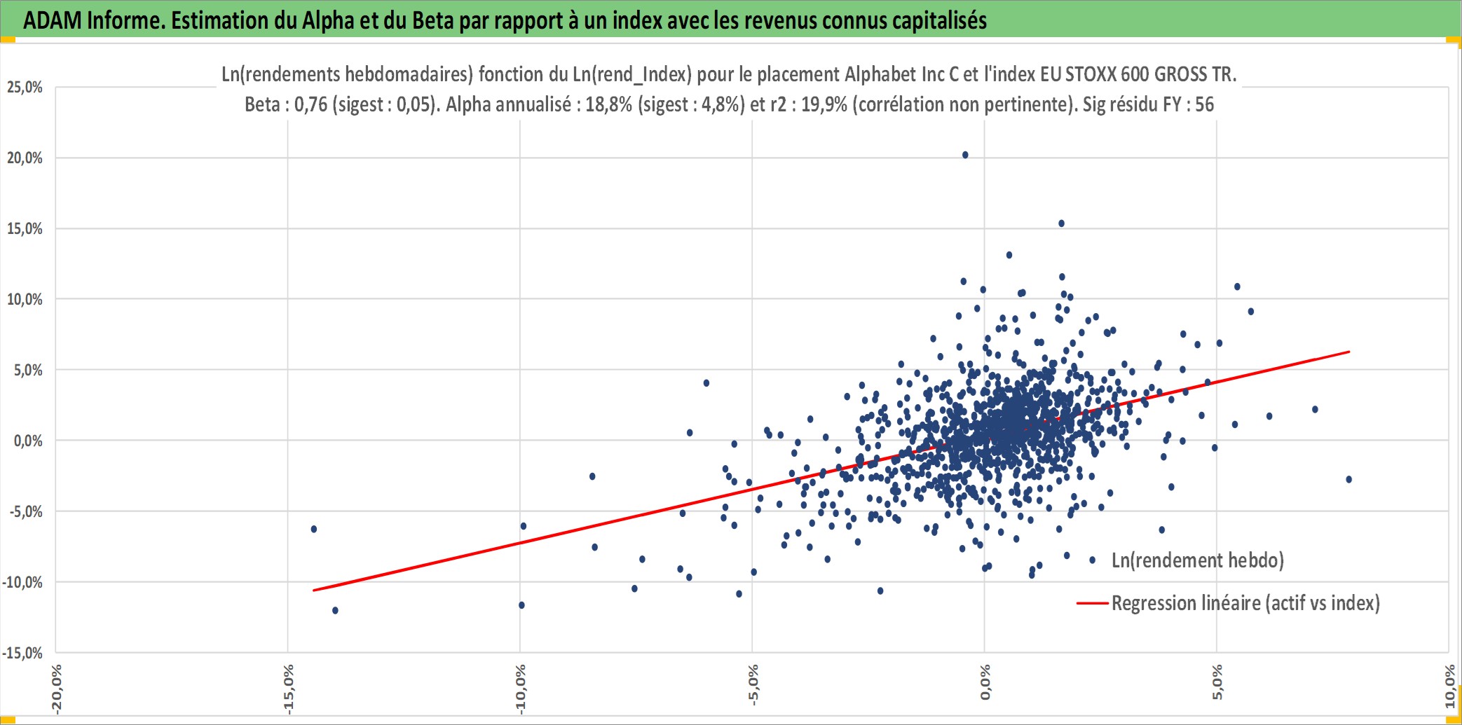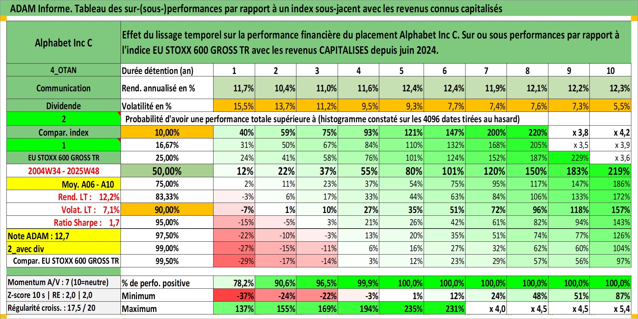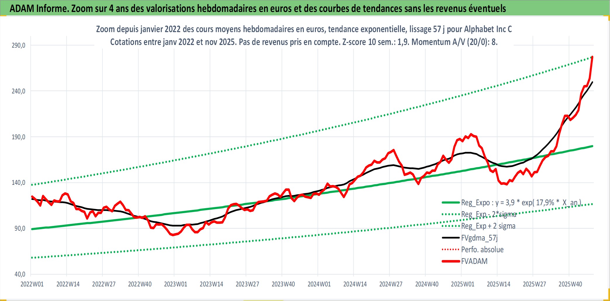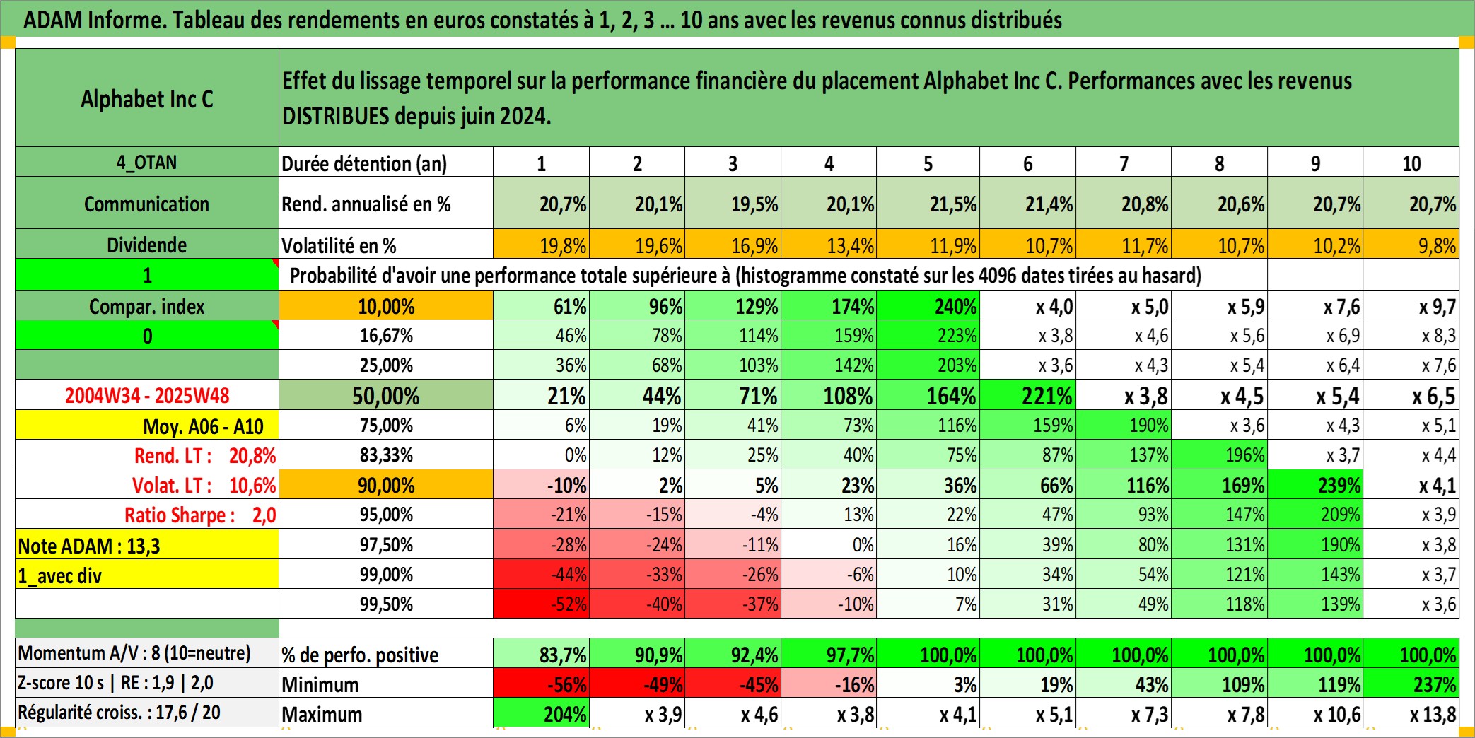 Site dédié aux investisseursPage dédiée sur site financeAnalyse des valorisations hebdomadaires de l'action Alphabet Inc C. Cet actif est cote en USD. Les valorisations sont en contrevaleur EURO et couvrent les semaines 2004W34 a 2025W48. Les revenus de cet actif financier sont pris en compte depuis la semaine 2024W24. La note ESG de cet actif n'est pas connue.