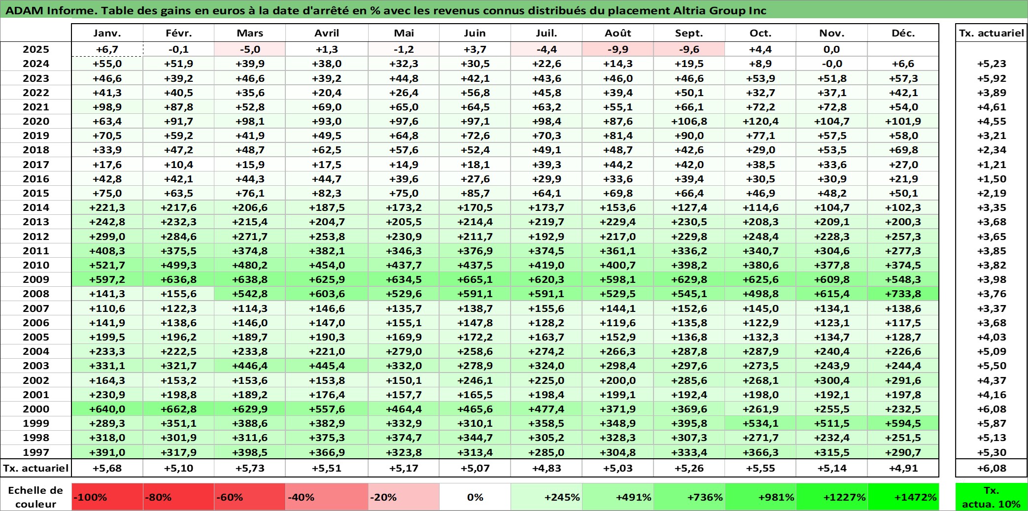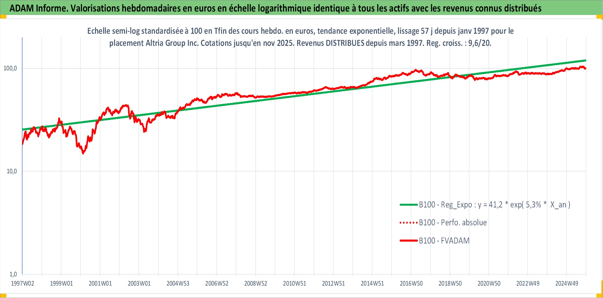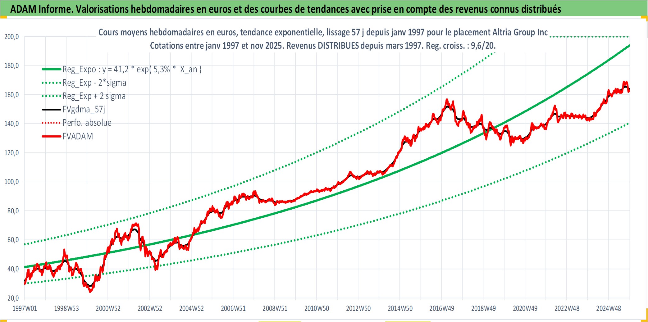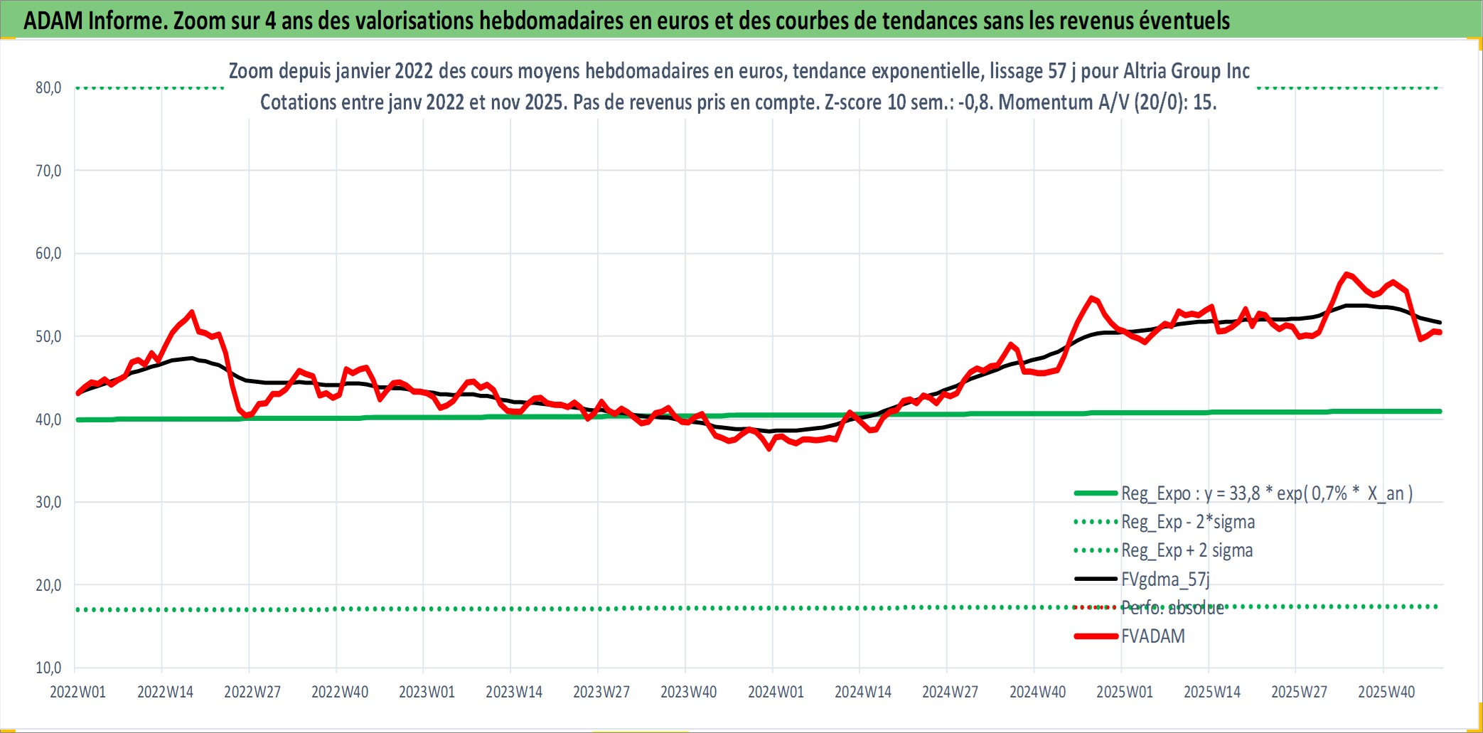 Site dédié aux investisseursPage dédiée sur site financeAnalyse des valorisations hebdomadaires de l'action Altria Group Inc. Cet actif est cote en USD. Les valorisations sont en contrevaleur EURO et couvrent les semaines 1997W01 a 2025W48. Les revenus de cet actif financier sont pris en compte depuis la semaine 1997W11. La note globale ESG de cet actif est estimee a 8.0 (apres rebasage entre 0 et 20).