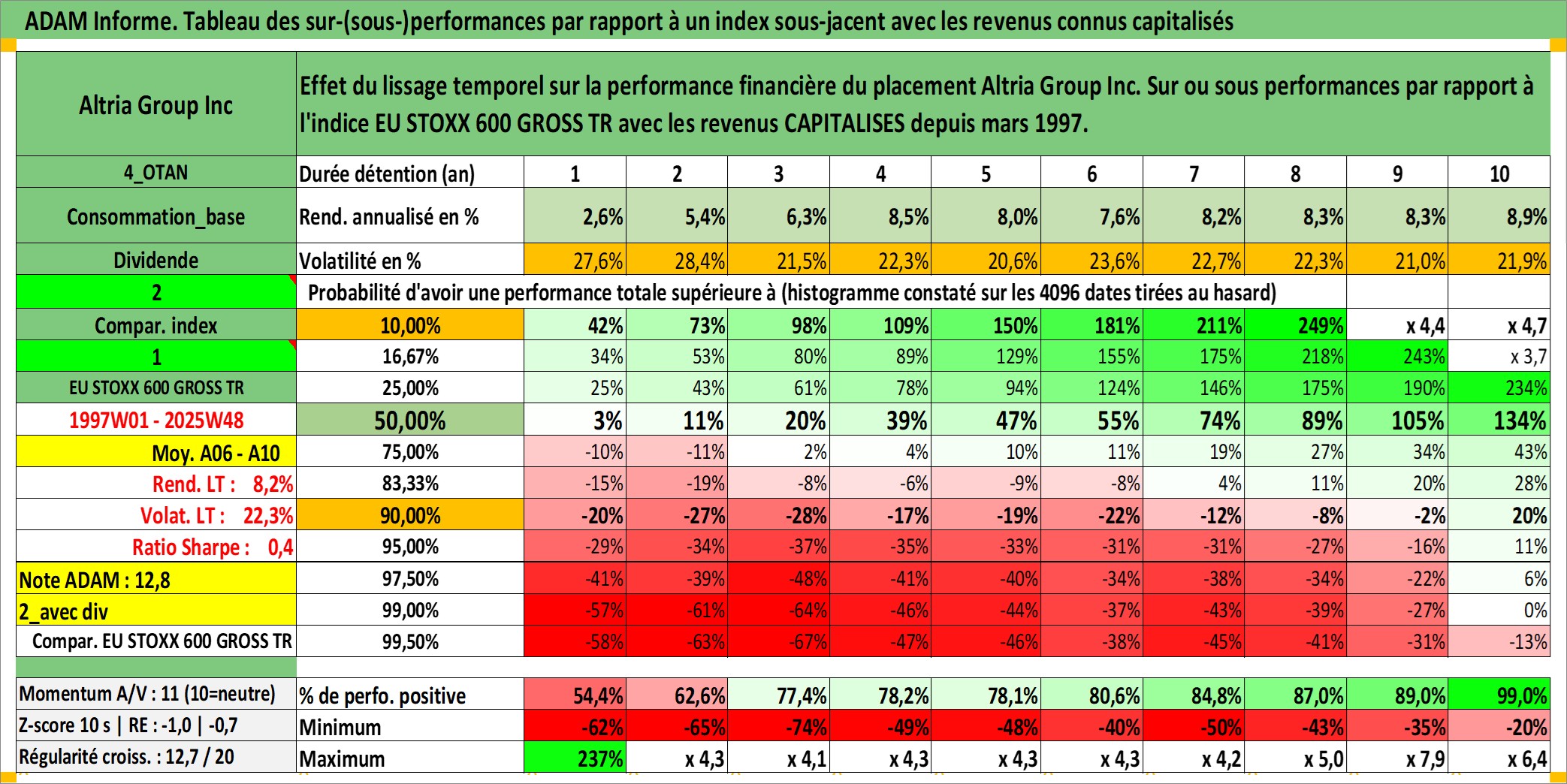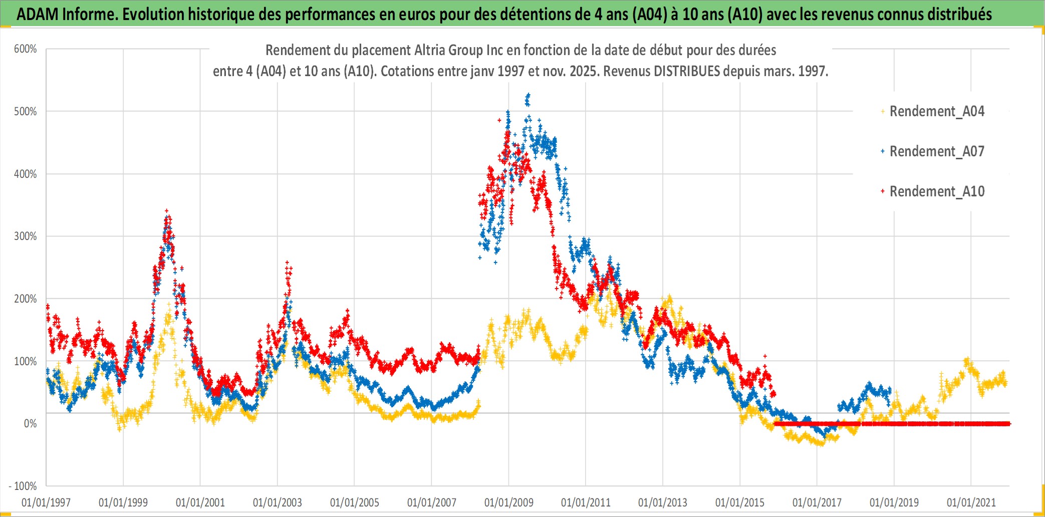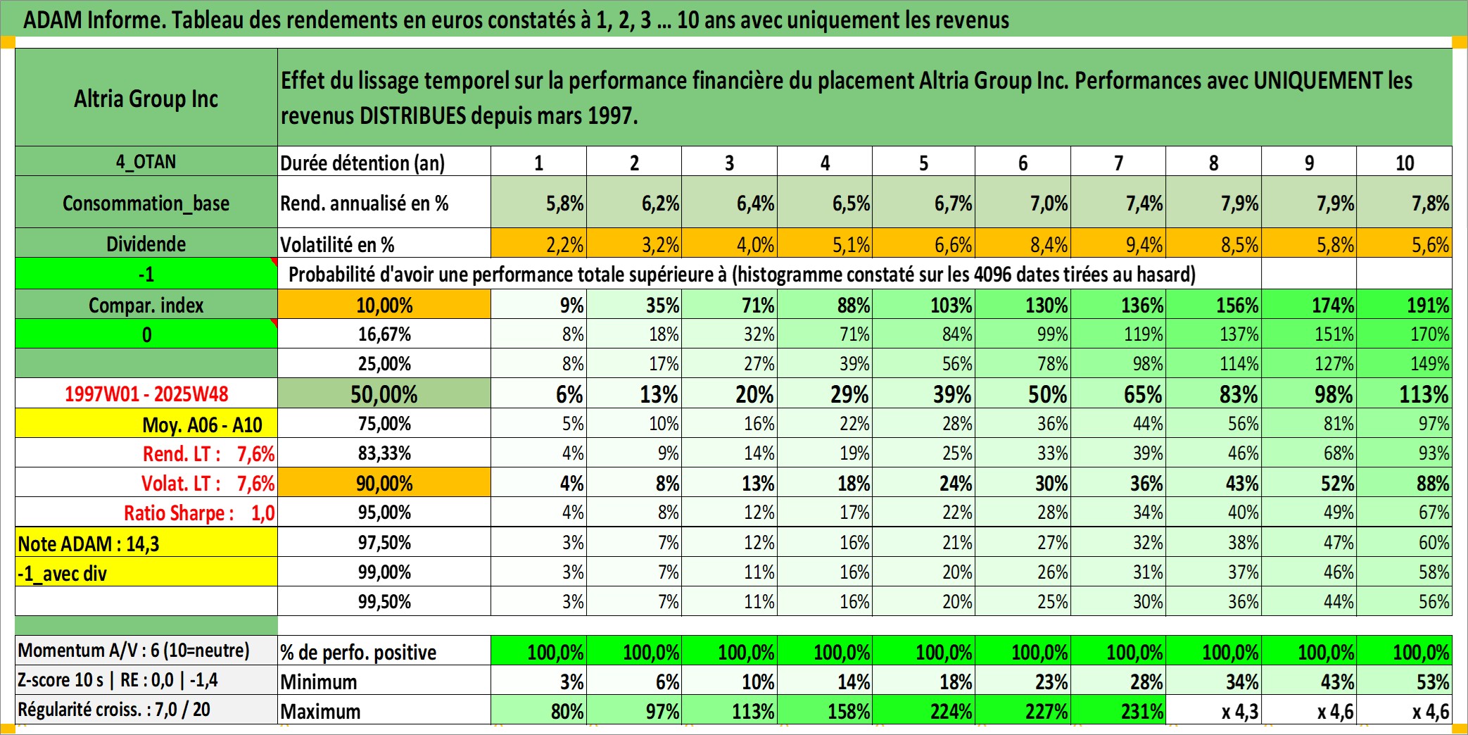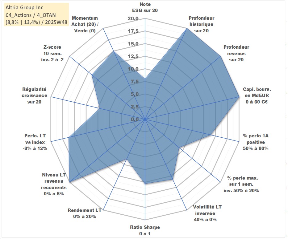 Site dédié aux investisseursPage dédiée sur site financeAnalyse des valorisations hebdomadaires de l'action Altria Group Inc. Cet actif est cote en USD. Les valorisations sont en contrevaleur EURO et couvrent les semaines 1997W01 a 2025W48. Les revenus de cet actif financier sont pris en compte depuis la semaine 1997W11. La note globale ESG de cet actif est estimee a 8.0 (apres rebasage entre 0 et 20).
