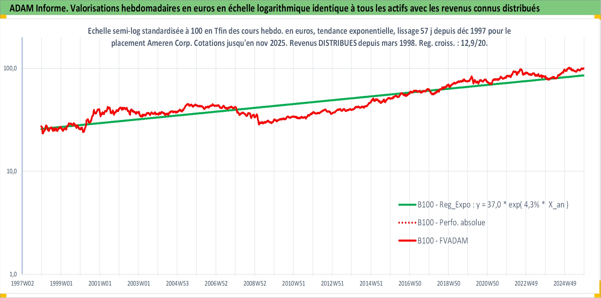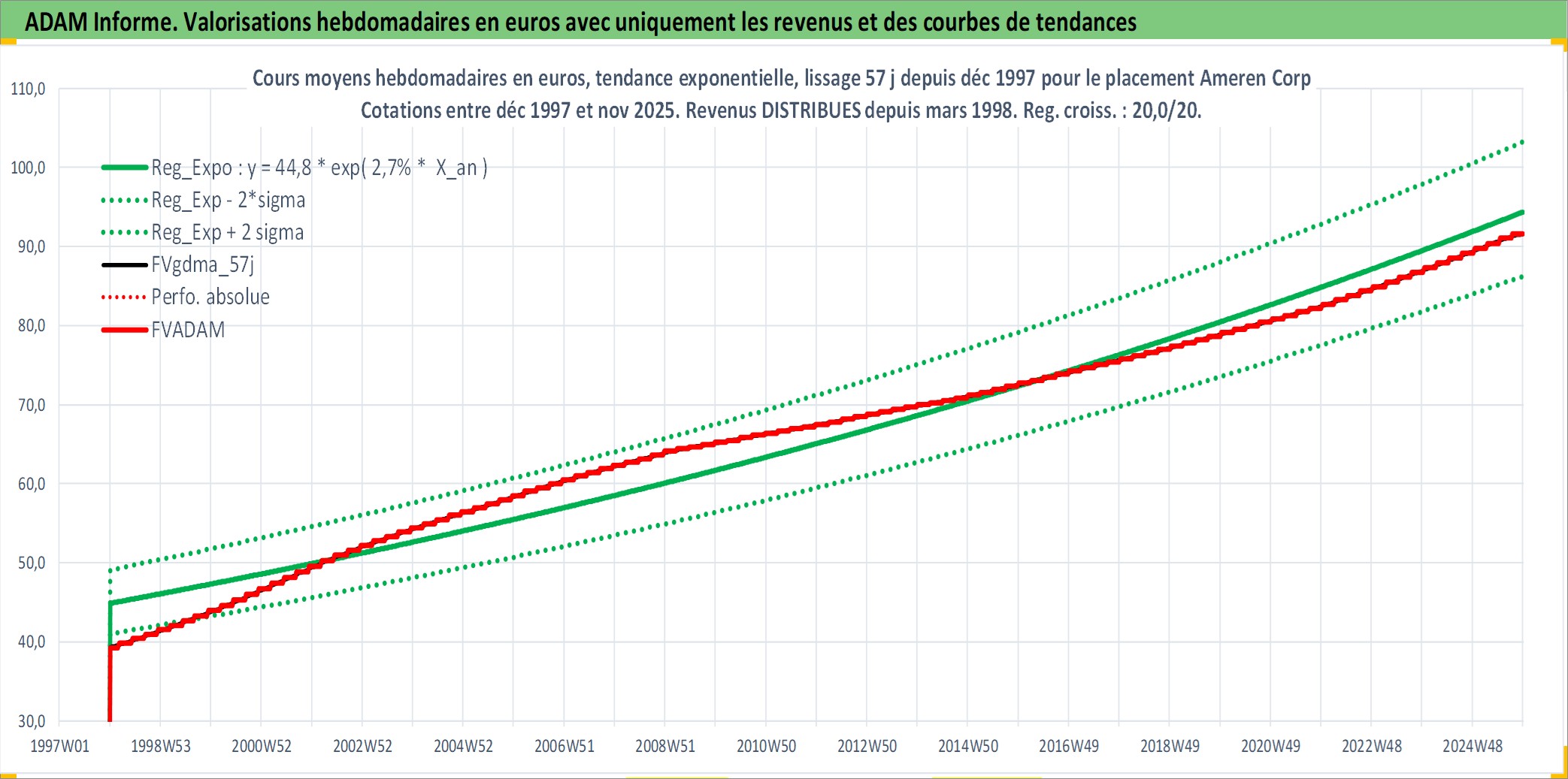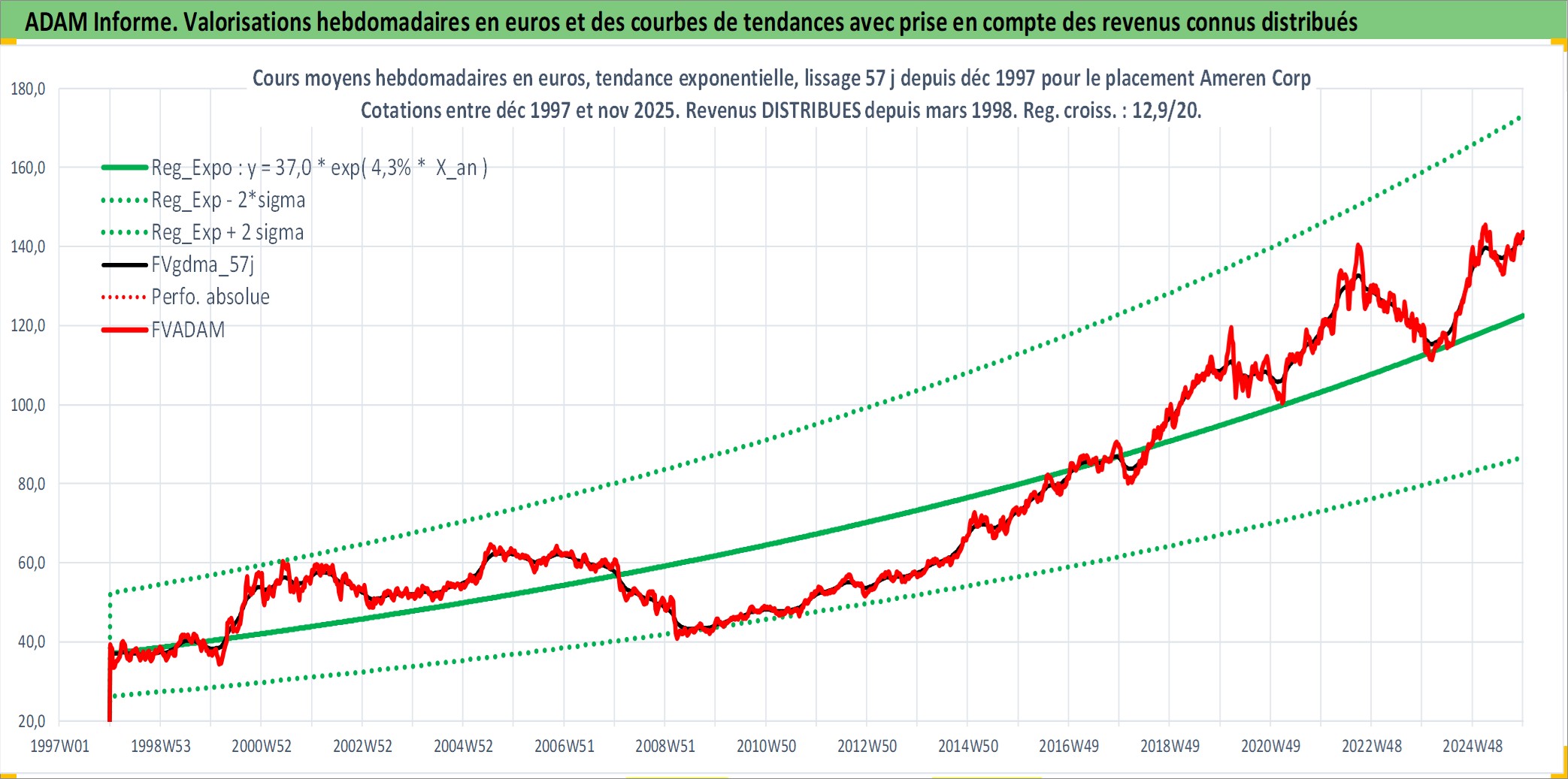 Site dédié aux investisseursPage dédiée sur site financeAnalyse des valorisations hebdomadaires de l'action Ameren Corp. Cet actif est cote en USD. Les valorisations sont en contrevaleur EURO et couvrent les semaines 1998W01 a 2025W48. Les revenus de cet actif financier sont pris en compte depuis la semaine 1998W10. La note globale ESG de cet actif est estimee a 5.0 (apres rebasage entre 0 et 20).