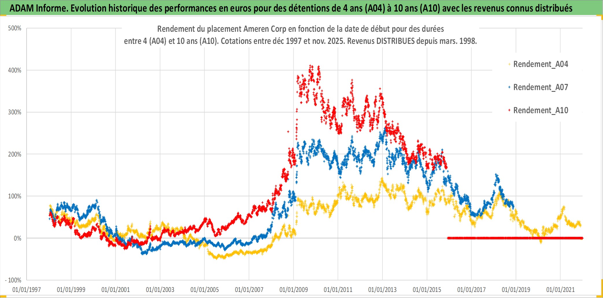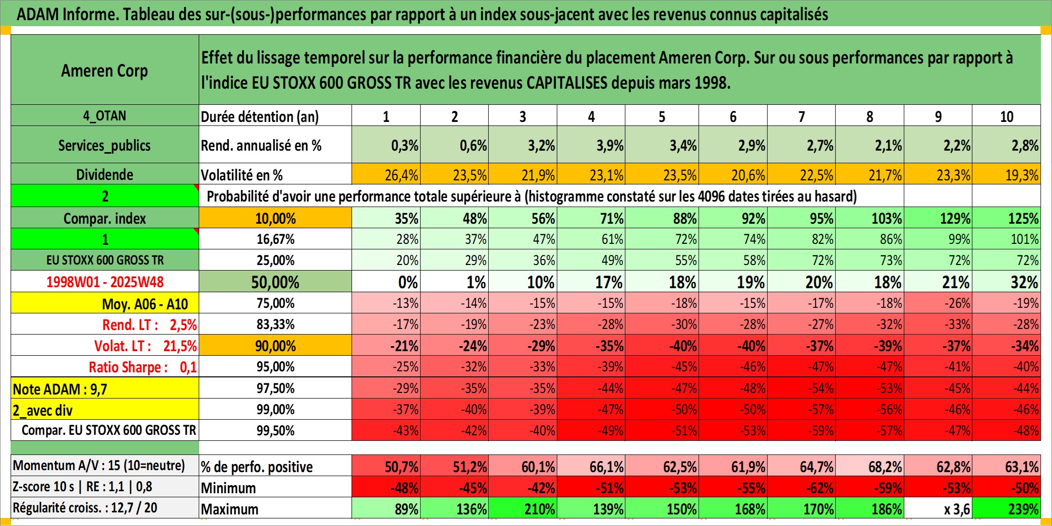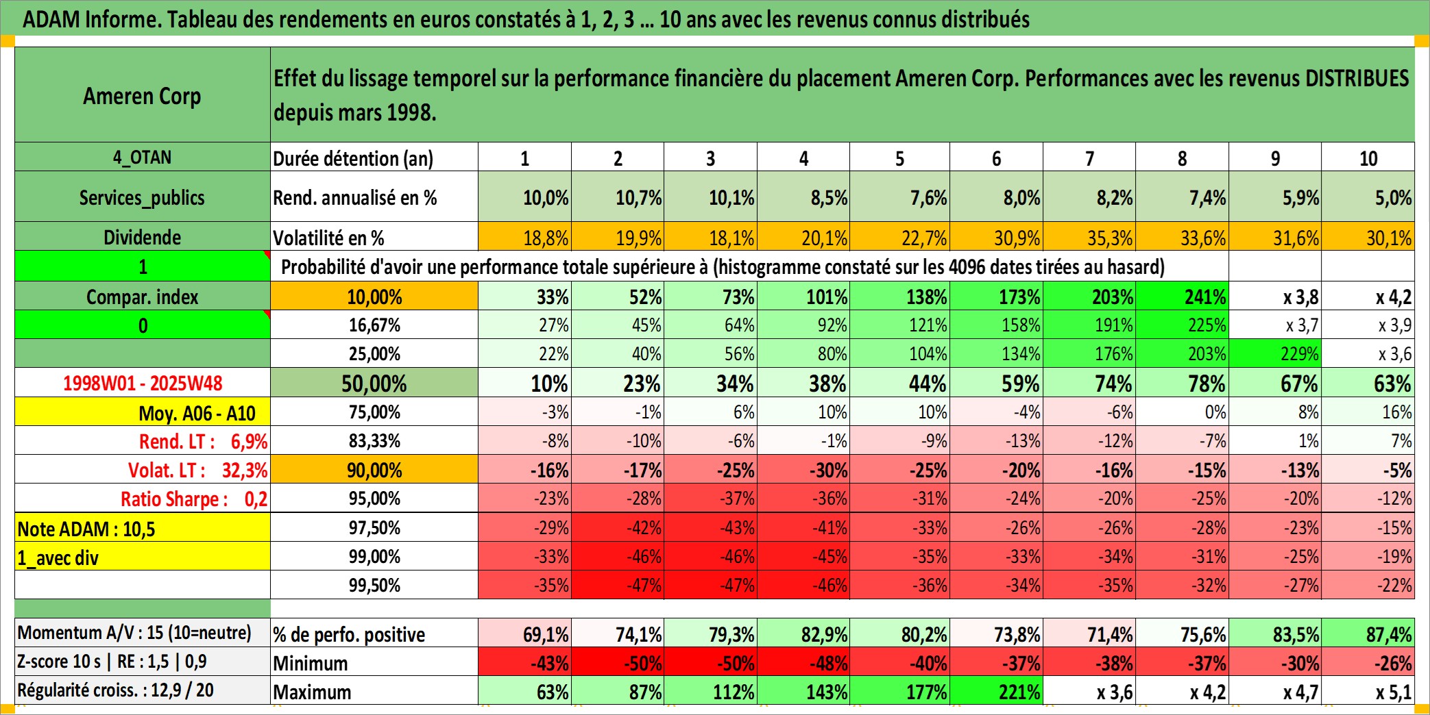 Site dédié aux investisseursPage dédiée sur site financeAnalyse des valorisations hebdomadaires de l'action Ameren Corp. Cet actif est cote en USD. Les valorisations sont en contrevaleur EURO et couvrent les semaines 1998W01 a 2025W48. Les revenus de cet actif financier sont pris en compte depuis la semaine 1998W10. La note globale ESG de cet actif est estimee a 5.0 (apres rebasage entre 0 et 20).