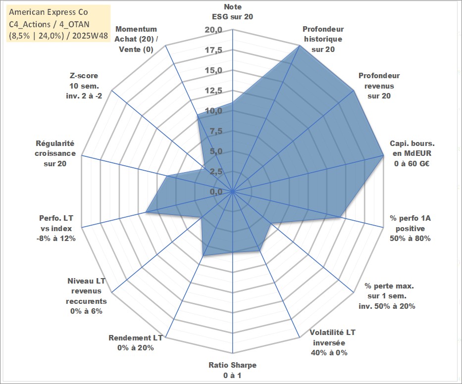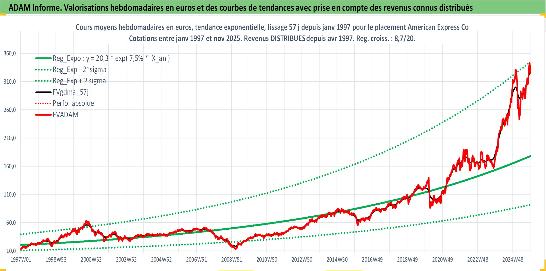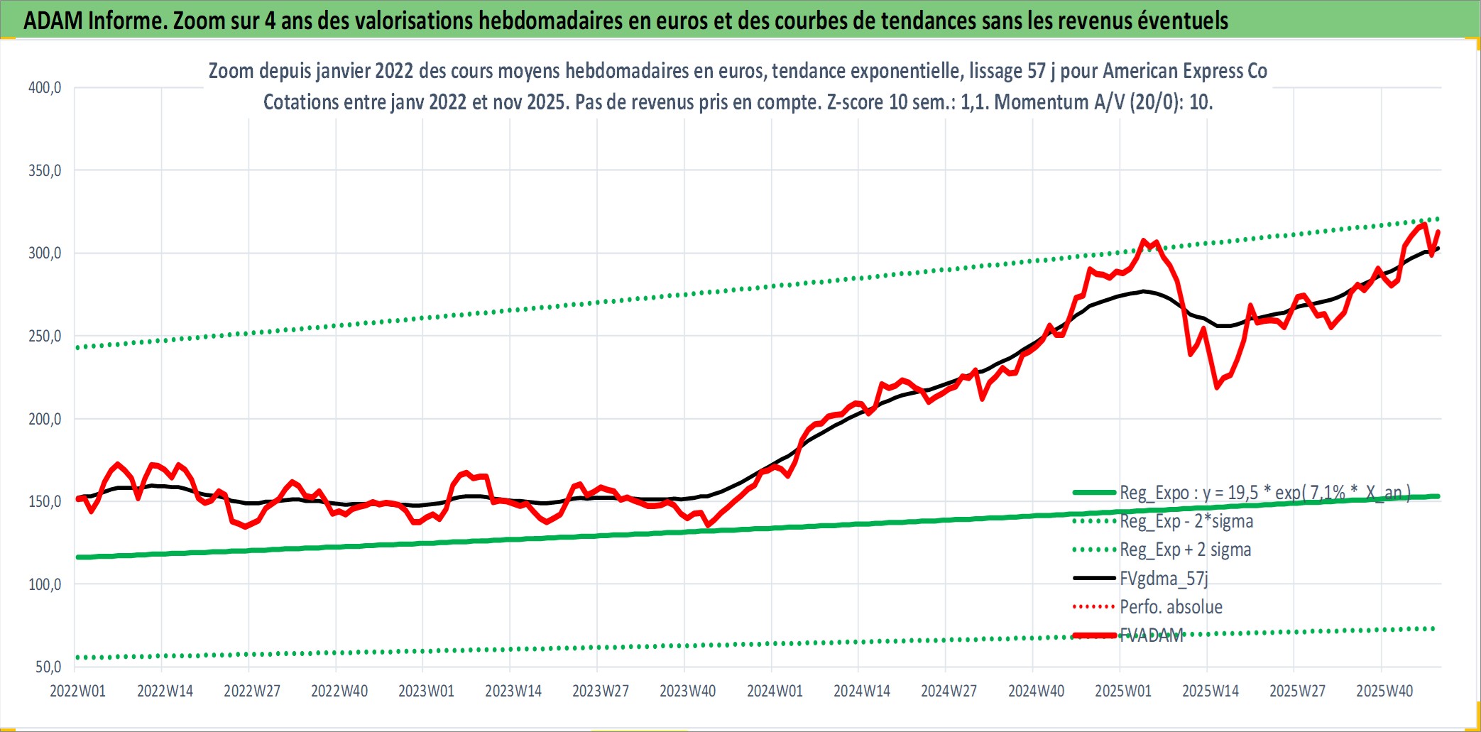 Site dédié aux investisseursPage dédiée sur site financeAnalyse des valorisations hebdomadaires de l'action American Express Co. Cet actif est cote en USD. Les valorisations sont en contrevaleur EURO et couvrent les semaines 1997W01 a 2025W48. Les revenus de cet actif financier sont pris en compte depuis la semaine 1997W14. La note globale ESG de cet actif est estimee a 11.0 (apres rebasage entre 0 et 20).