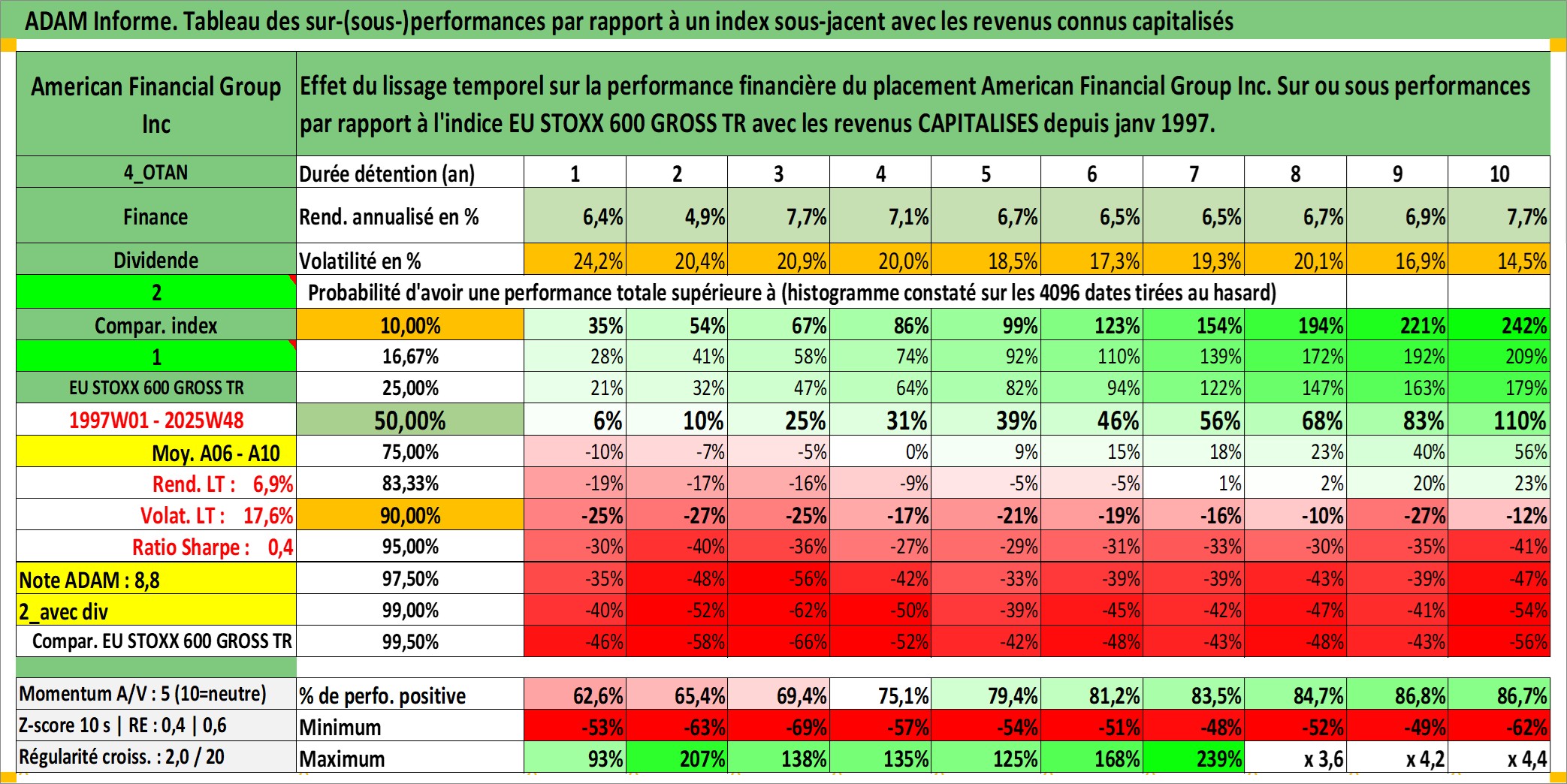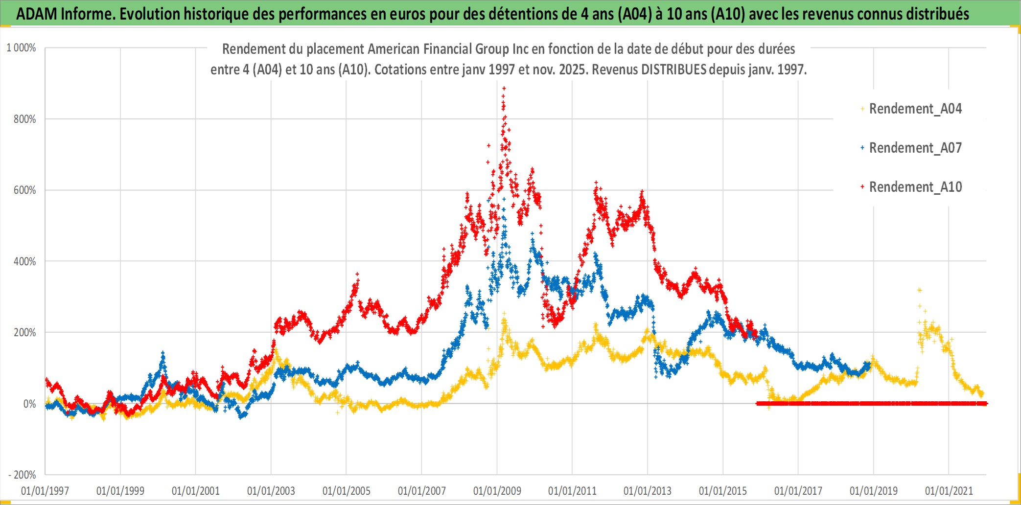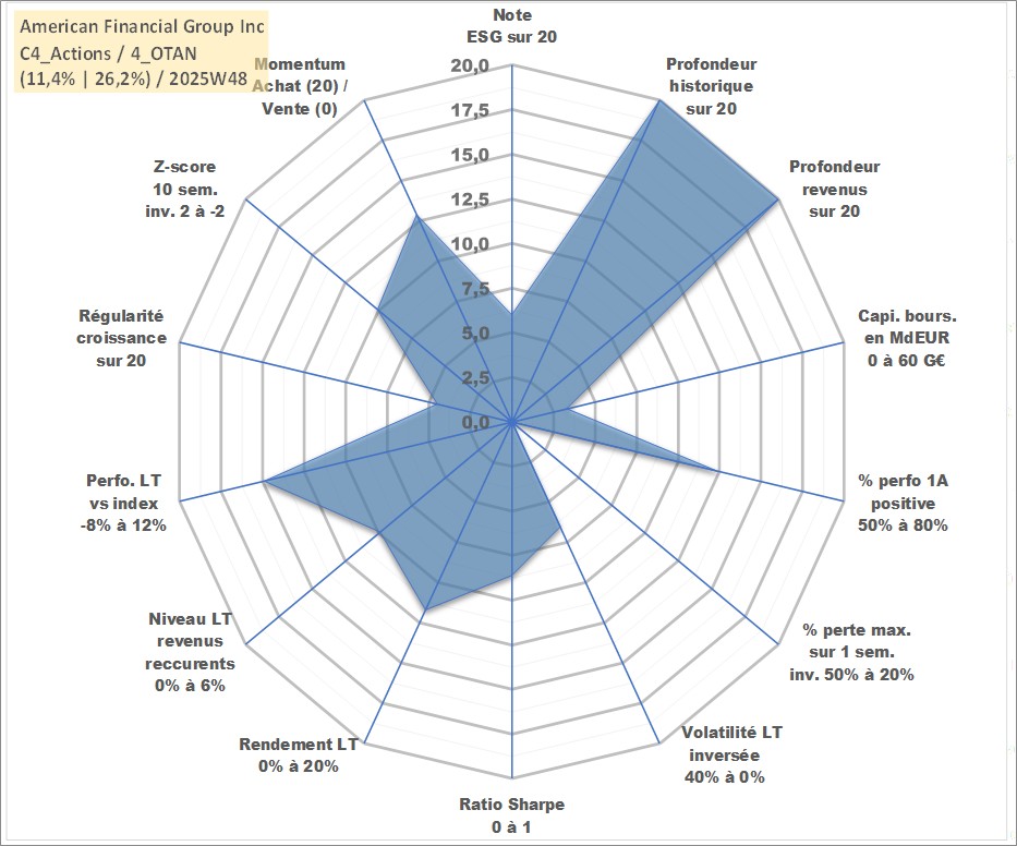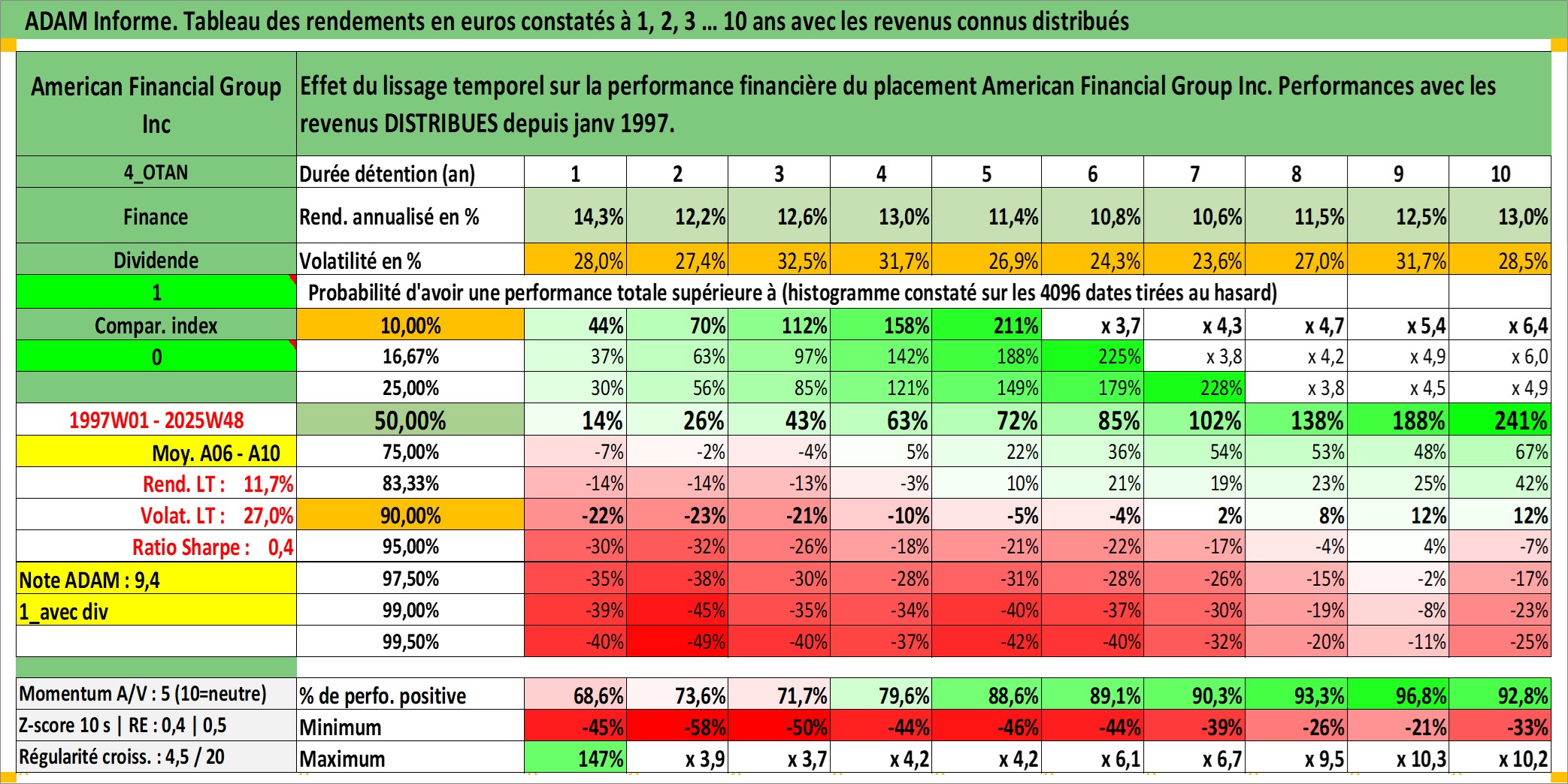 Site dédié aux investisseursPage dédiée sur site financeAnalyse des valorisations hebdomadaires de l'action American Financial Group Inc. Cet actif est cote en USD. Les valorisations sont en contrevaleur EURO et couvrent les semaines 1997W01 a 2025W48. Les revenus de cet actif financier sont pris en compte depuis la semaine 1997W03. La note globale ESG de cet actif est estimee a 6.0 (apres rebasage entre 0 et 20).