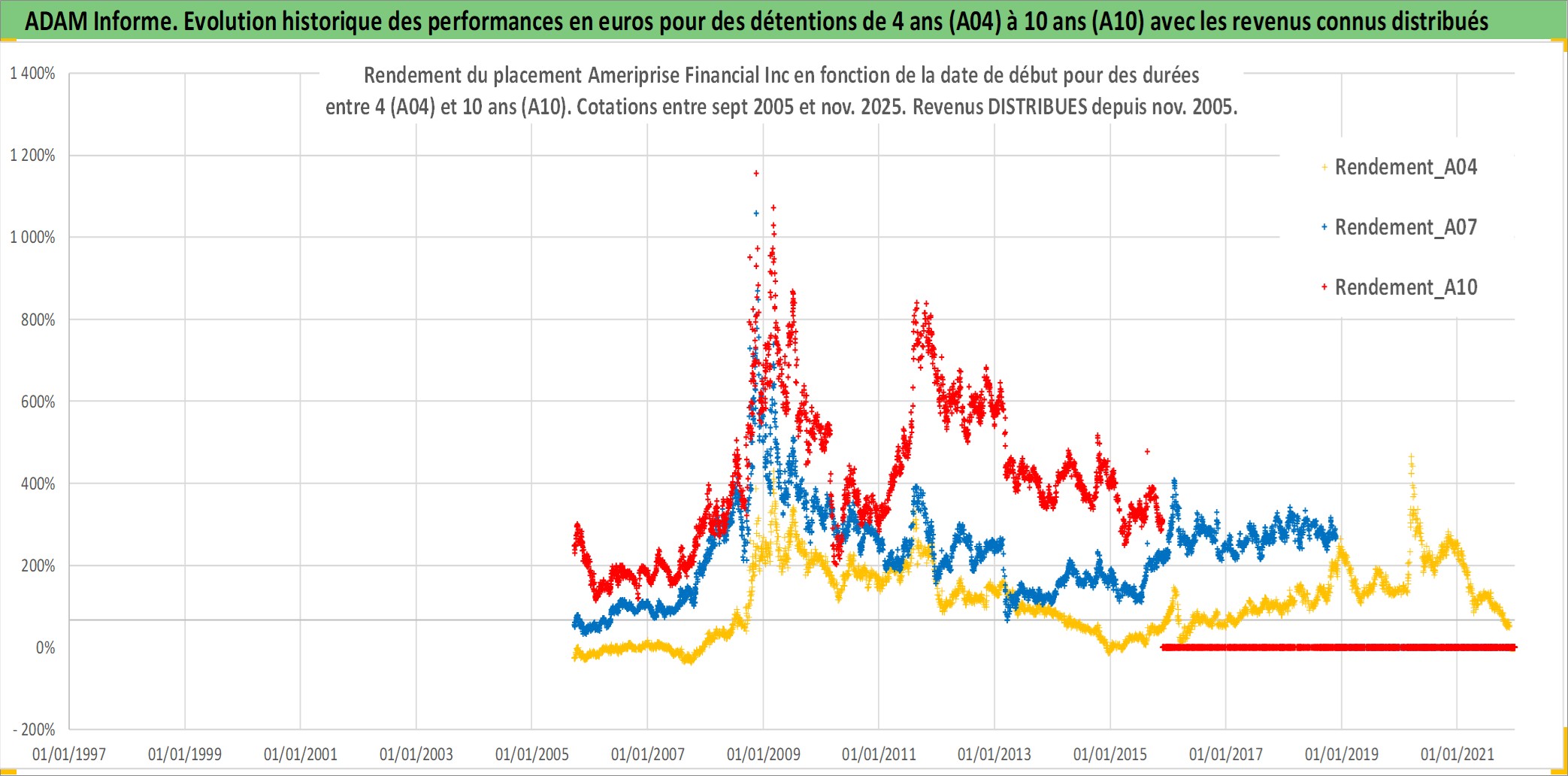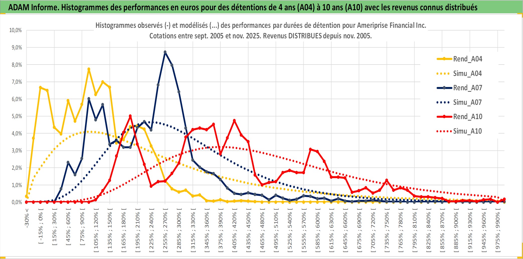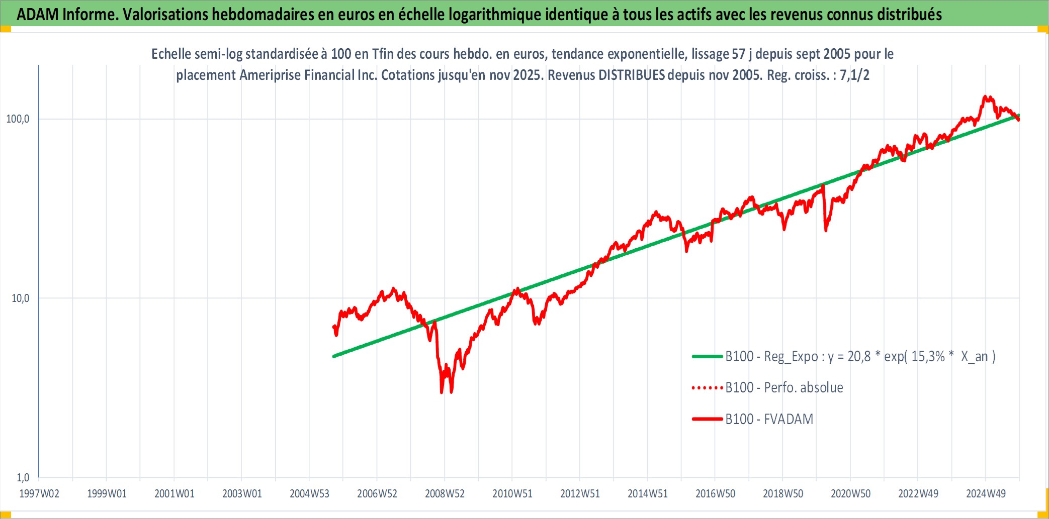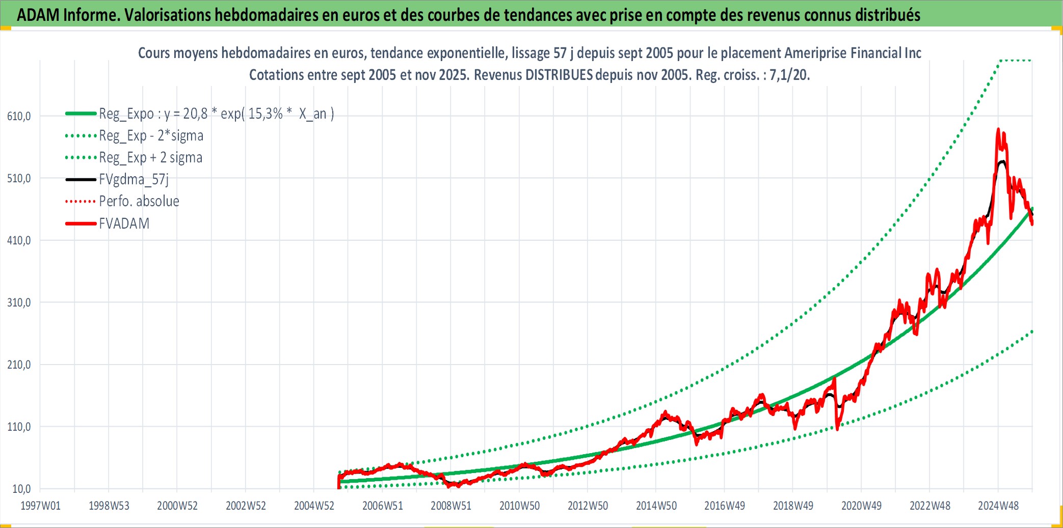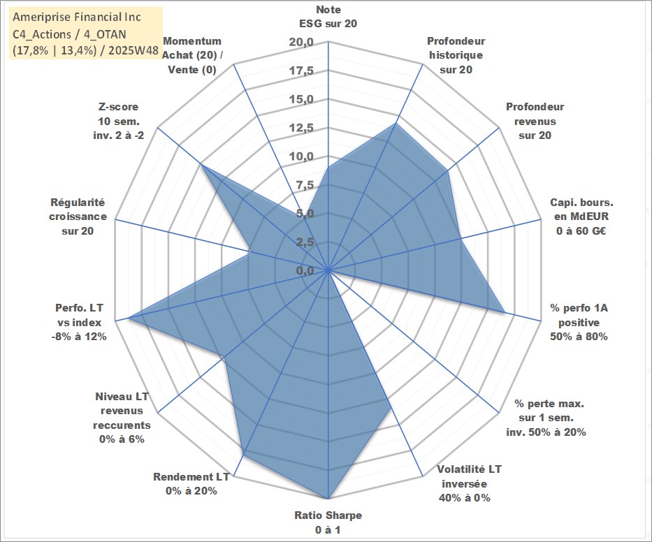 Site dédié aux investisseursPage dédiée sur site financeAnalyse des valorisations hebdomadaires de l'action Ameriprise Financial Inc. Cet actif est cote en USD. Les valorisations sont en contrevaleur EURO et couvrent les semaines 2005W37 a 2025W48. Les revenus de cet actif financier sont pris en compte depuis la semaine 2005W44. La note globale ESG de cet actif est estimee a 9.0 (apres rebasage entre 0 et 20).