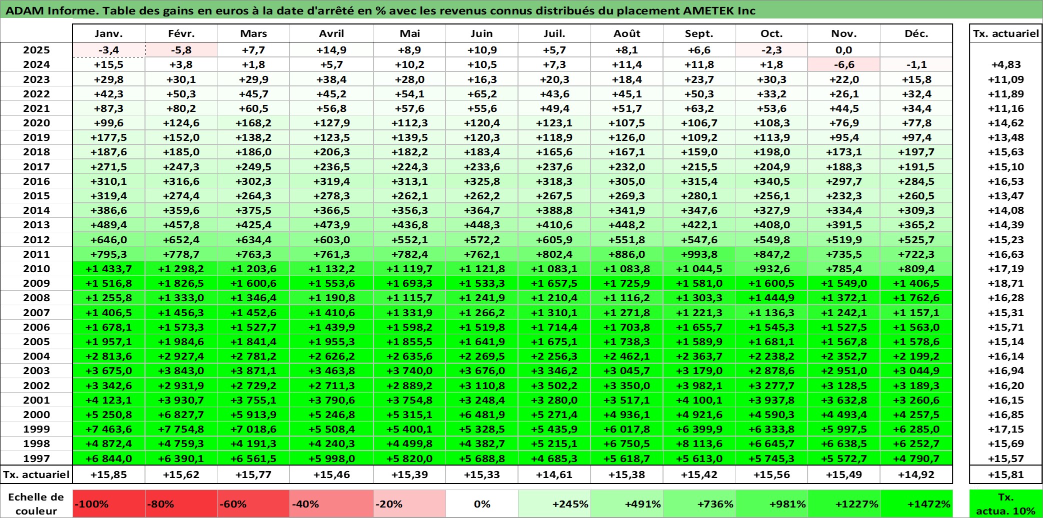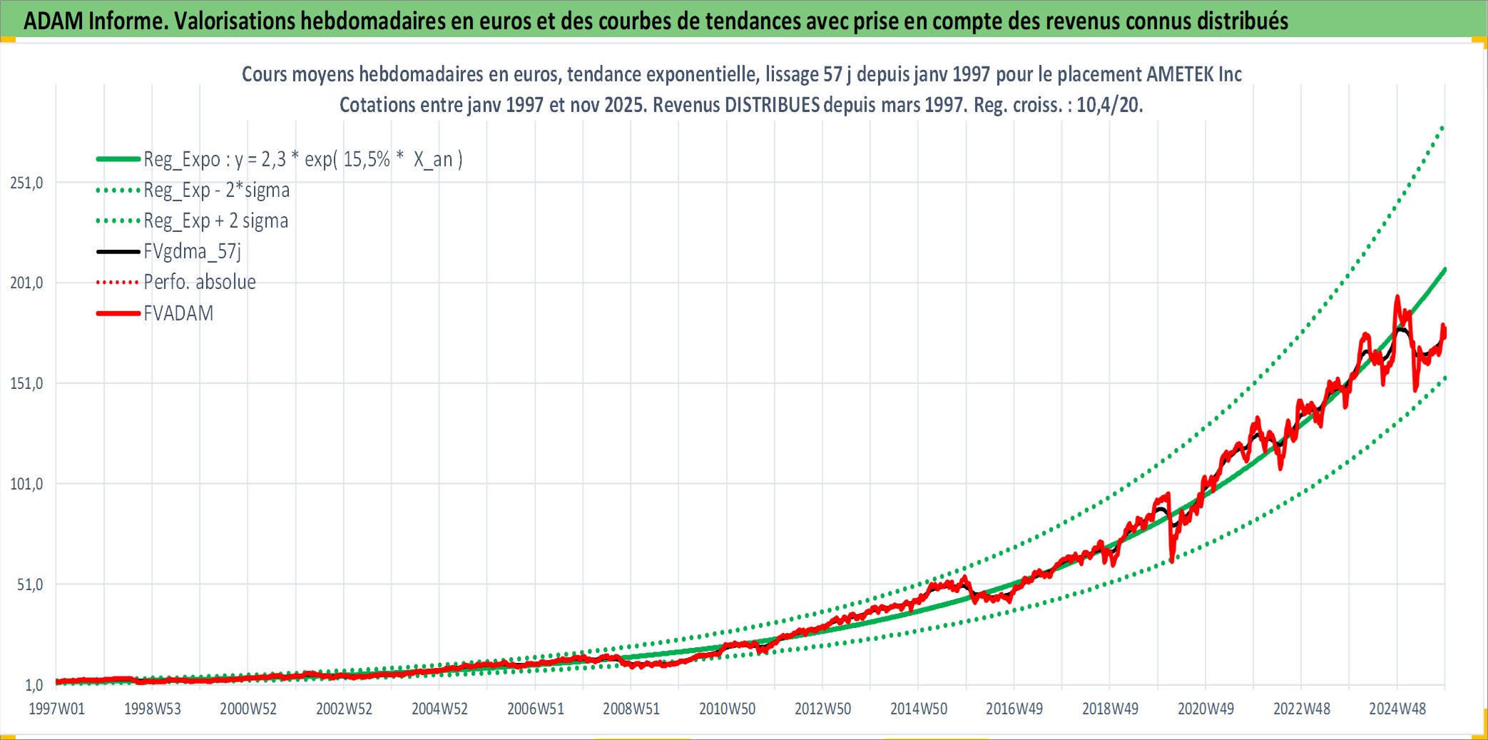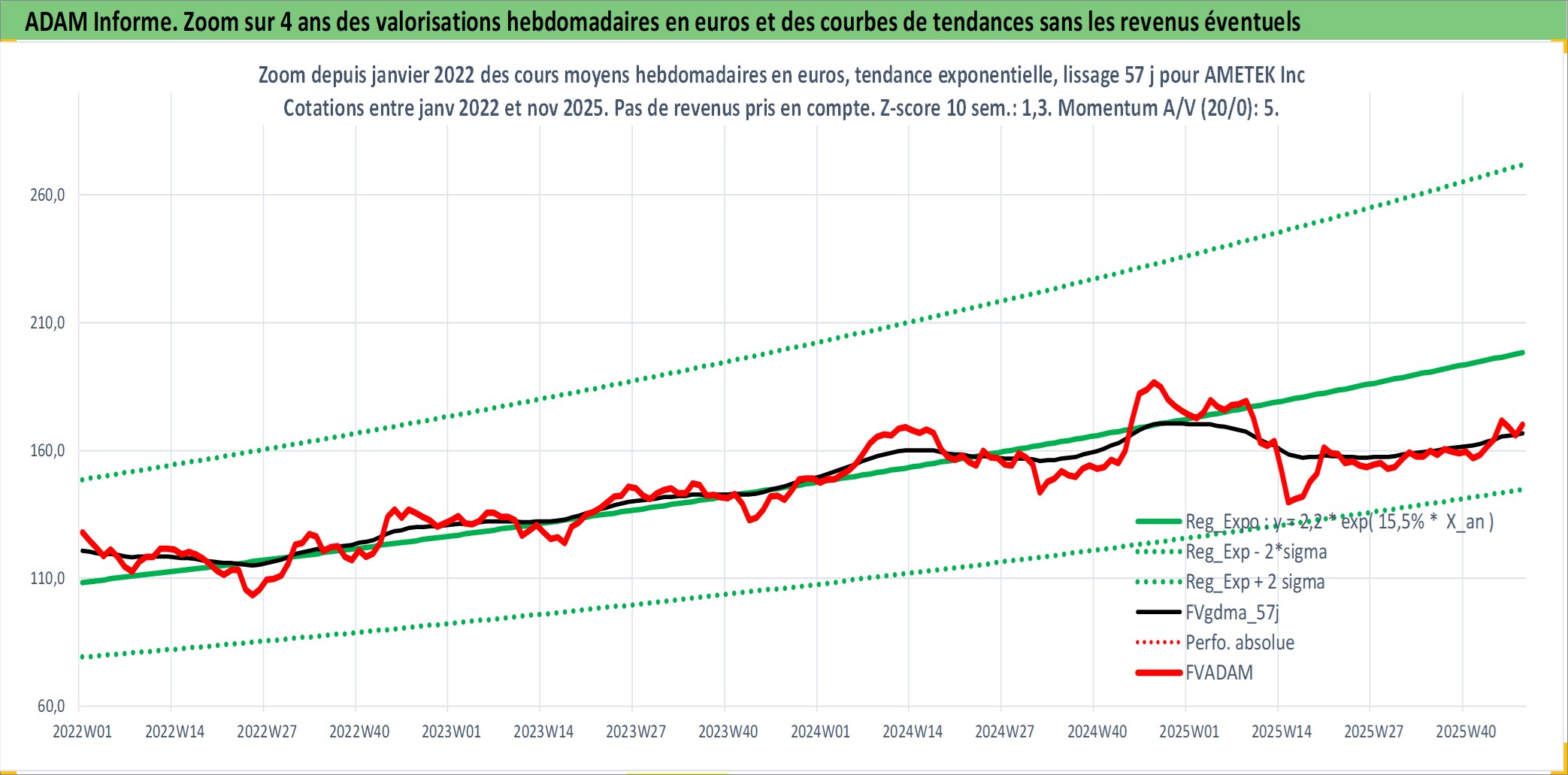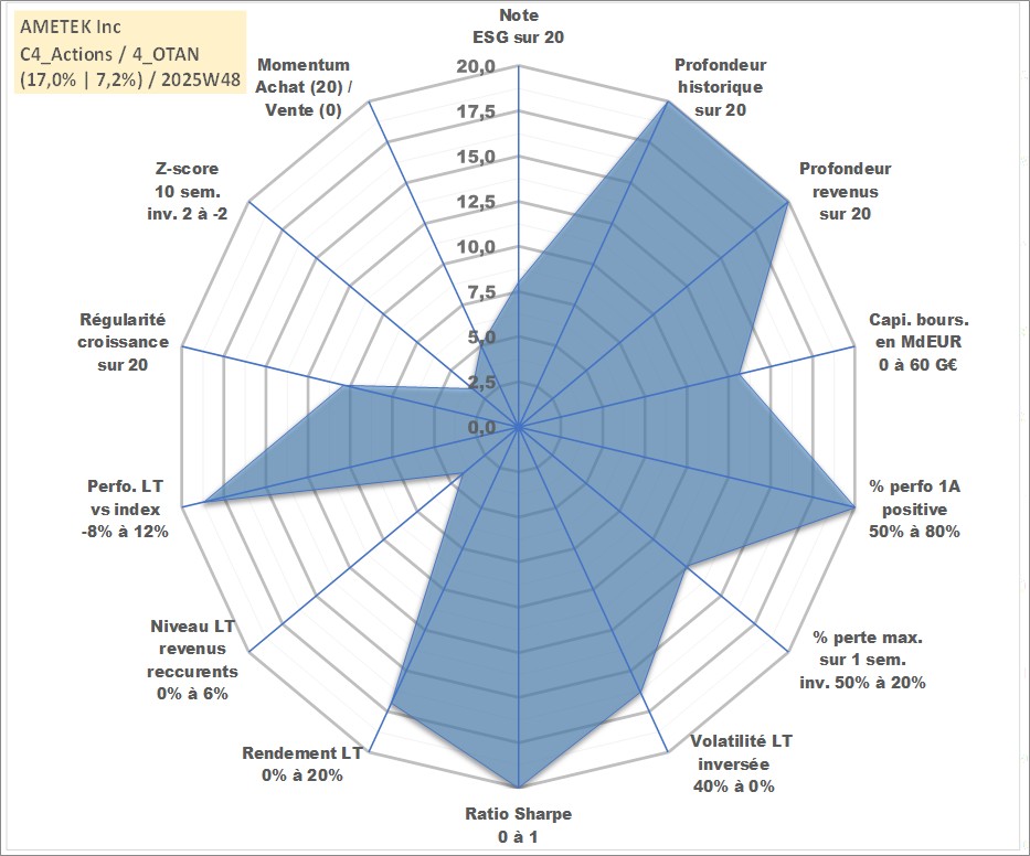 Site dédié aux investisseursPage dédiée sur site financeAnalyse des valorisations hebdomadaires de l'action AMETEK Inc. Cet actif est cote en USD. Les valorisations sont en contrevaleur EURO et couvrent les semaines 1997W01 a 2025W48. Les revenus de cet actif financier sont pris en compte depuis la semaine 1997W11. La note globale ESG de cet actif est estimee a 8.0 (apres rebasage entre 0 et 20).