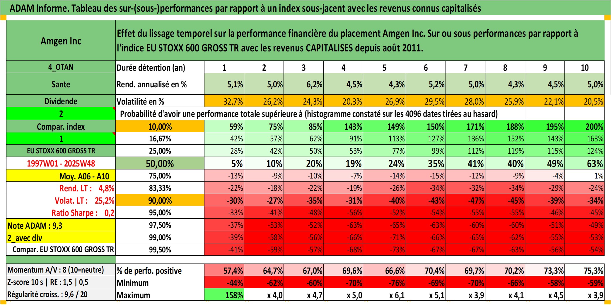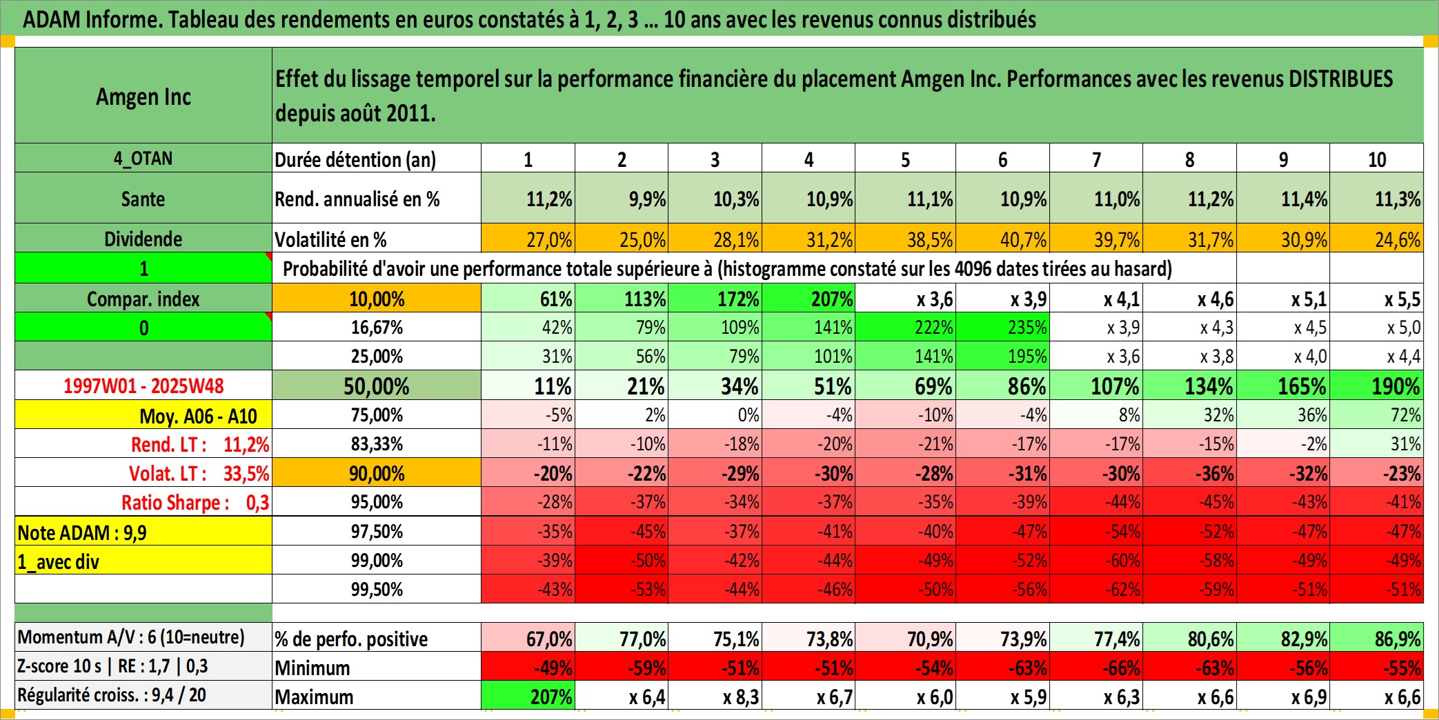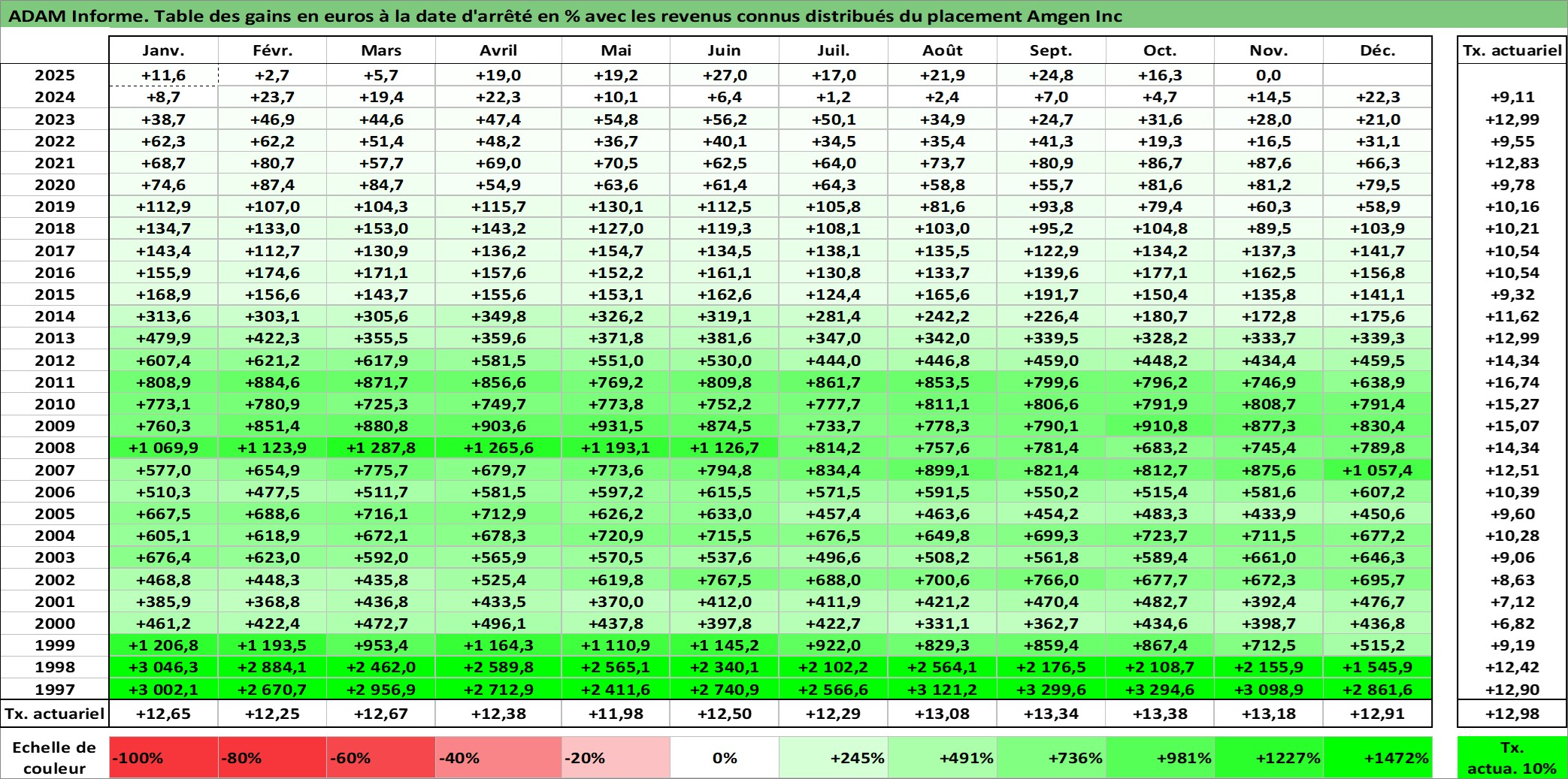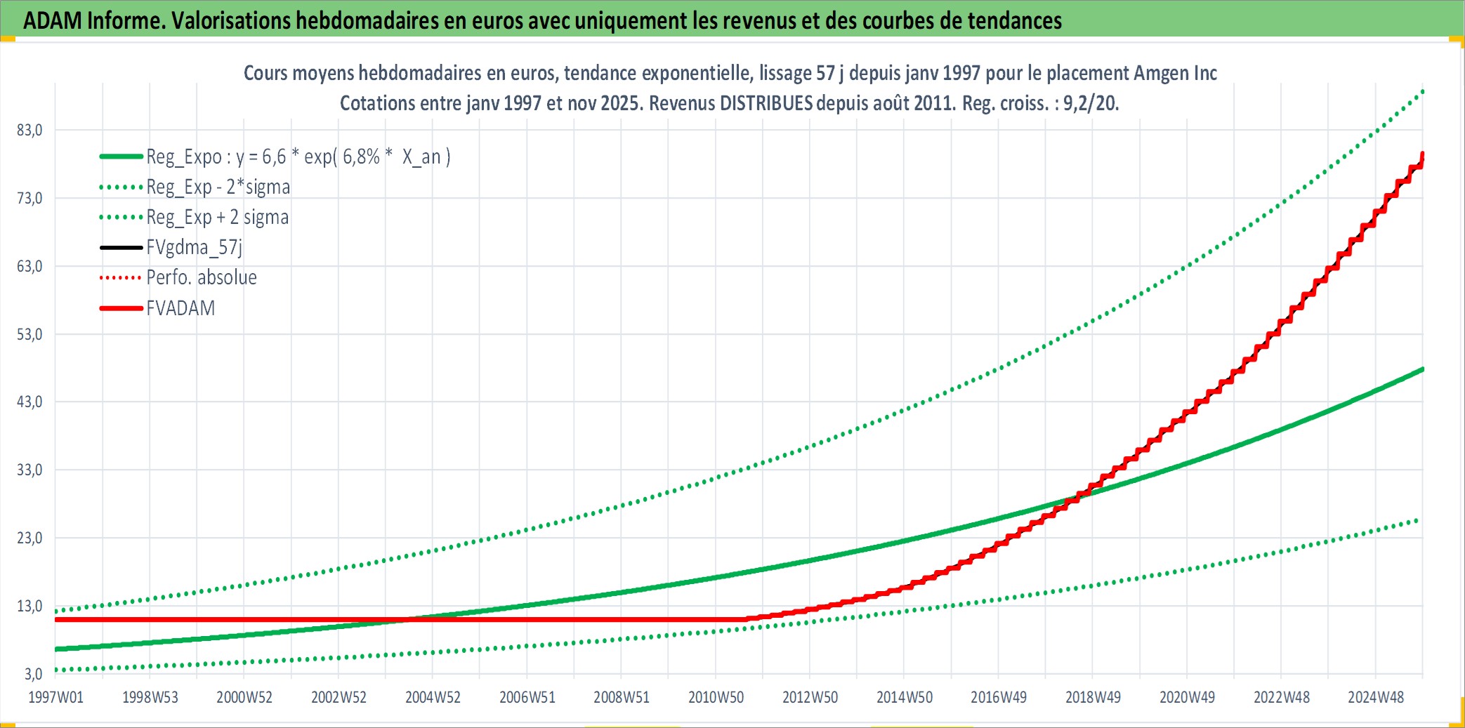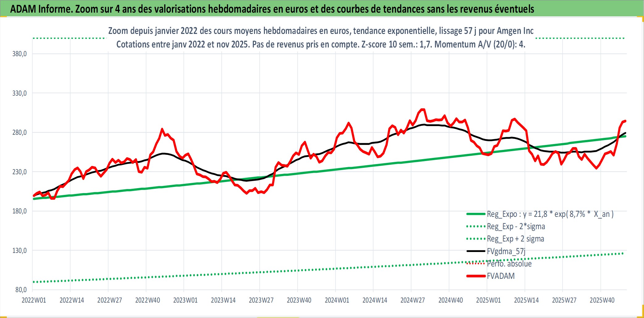 Site dédié aux investisseursPage dédiée sur site financeAnalyse des valorisations hebdomadaires de l'action Amgen Inc. Cet actif est cote en USD. Les valorisations sont en contrevaleur EURO et couvrent les semaines 1997W01 a 2025W48. Les revenus de cet actif financier sont pris en compte depuis la semaine 2011W33. La note globale ESG de cet actif est estimee a 9.0 (apres rebasage entre 0 et 20).