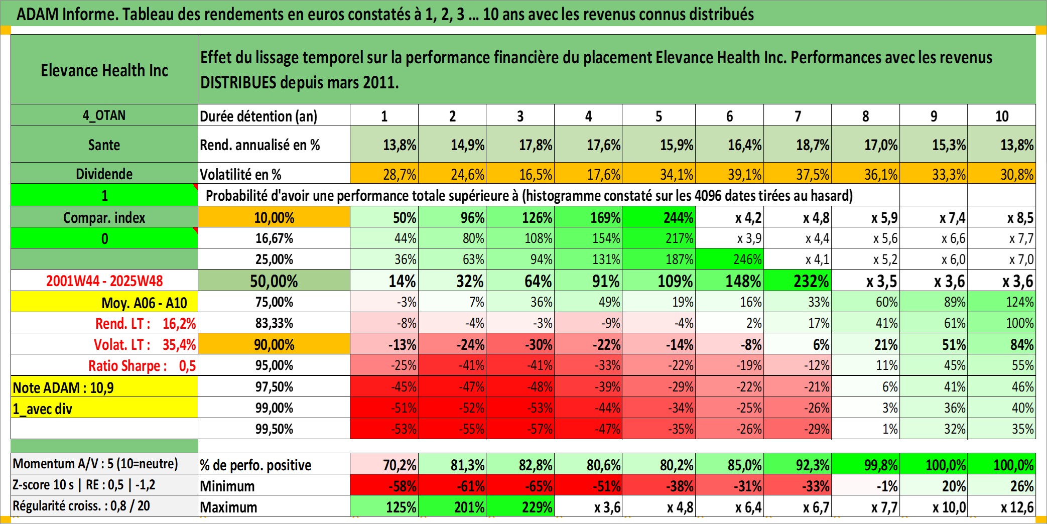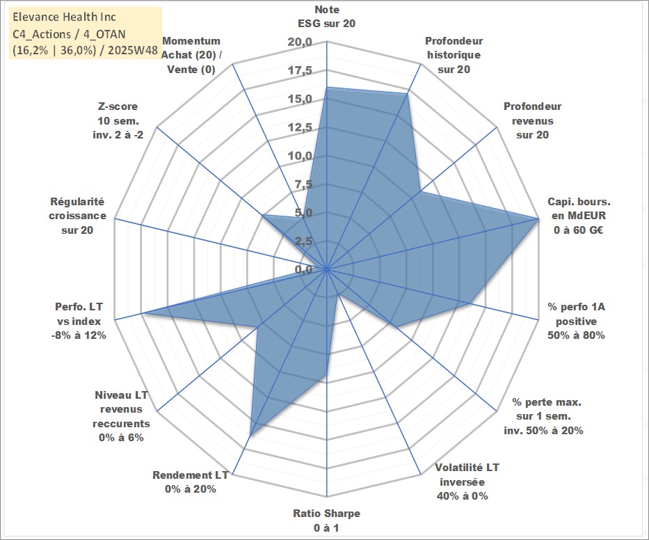 Site dédié aux investisseursPage dédiée sur site financeAnalyse des valorisations hebdomadaires de l'action Elevance Health Inc. Cet actif est cote en USD. Les valorisations sont en contrevaleur EURO et couvrent les semaines 2001W44 a 2025W48. Les revenus de cet actif financier sont pris en compte depuis la semaine 2011W10. La note globale ESG de cet actif est estimee a 16.0 (apres rebasage entre 0 et 20).