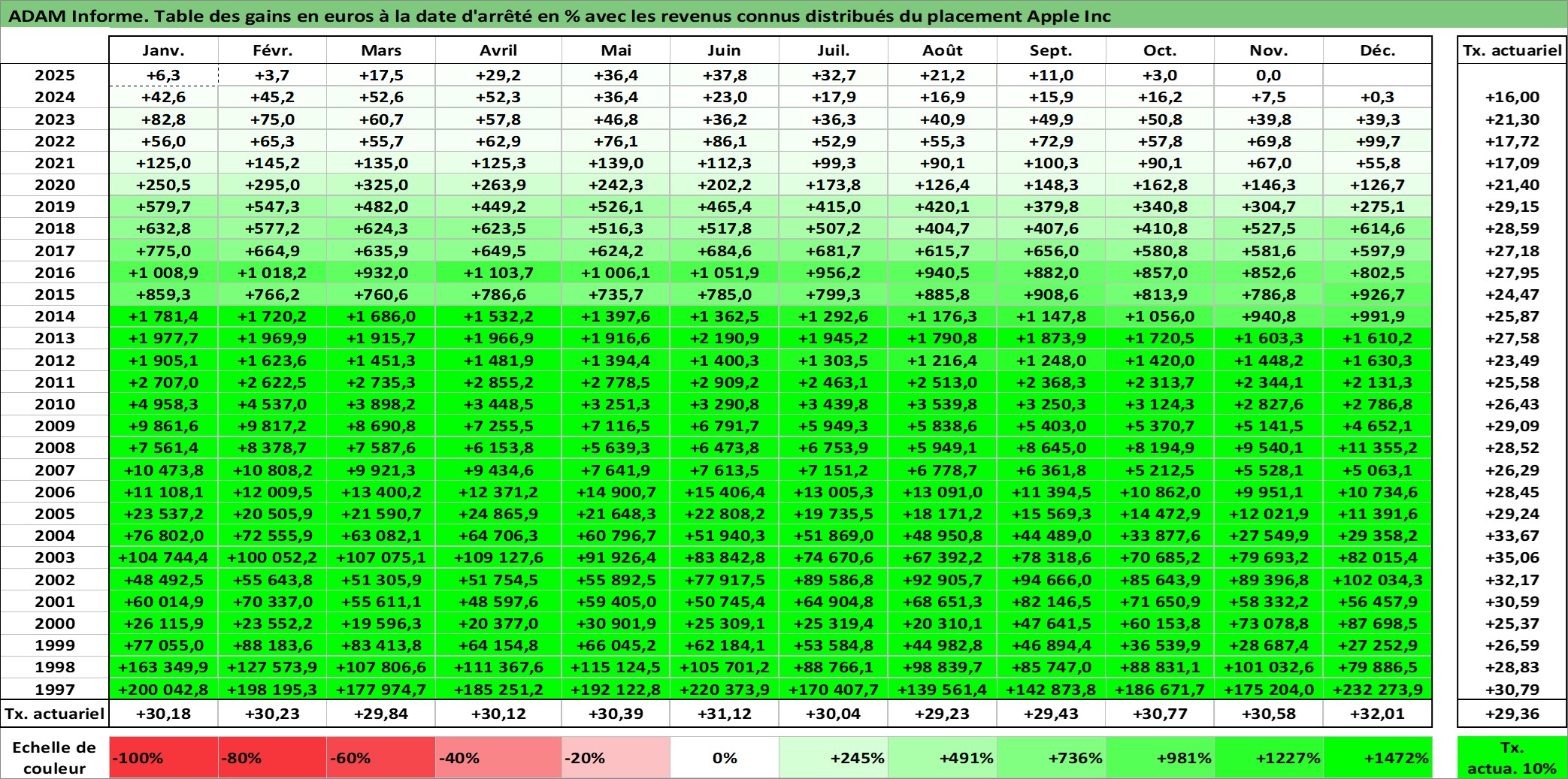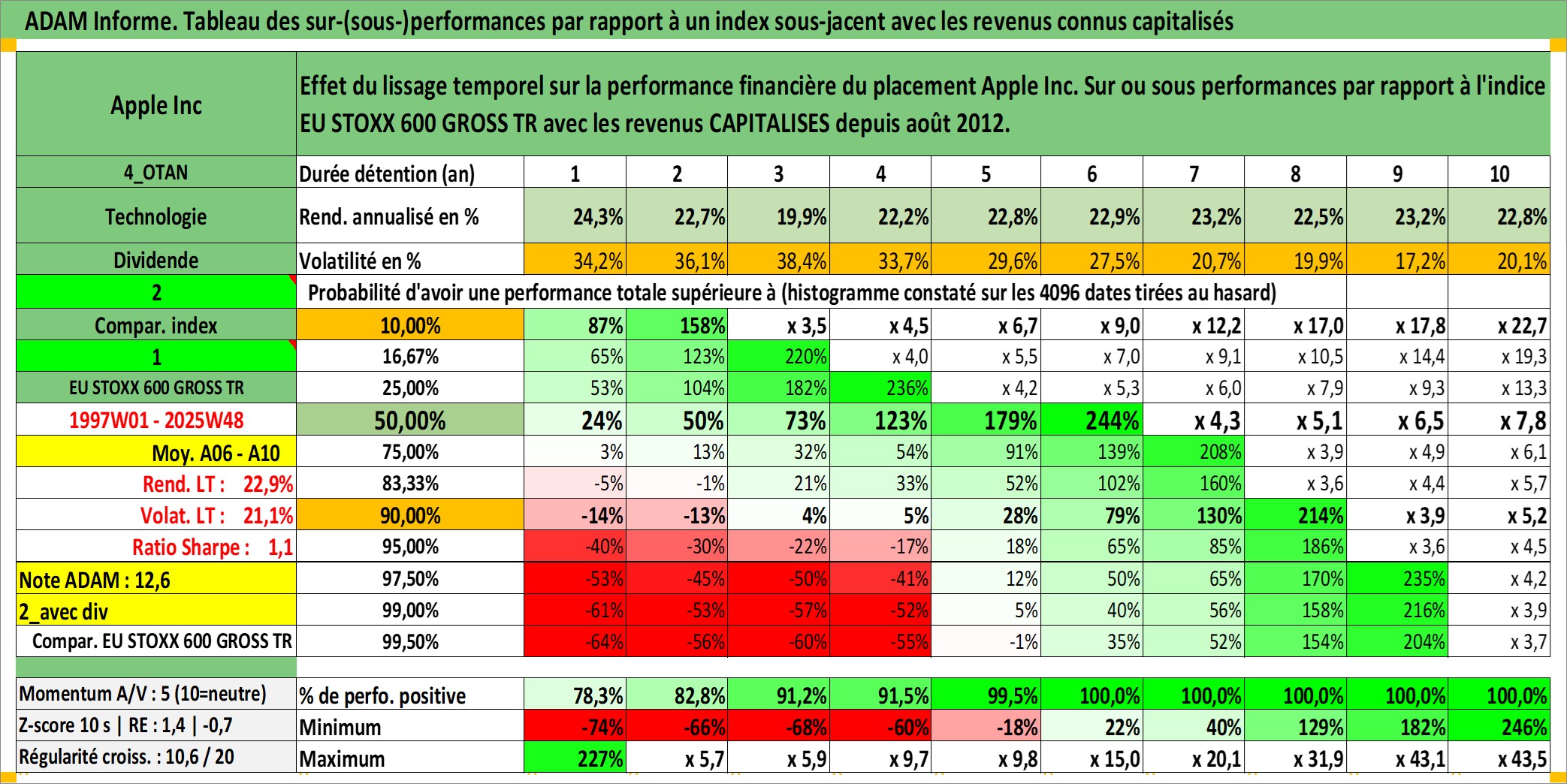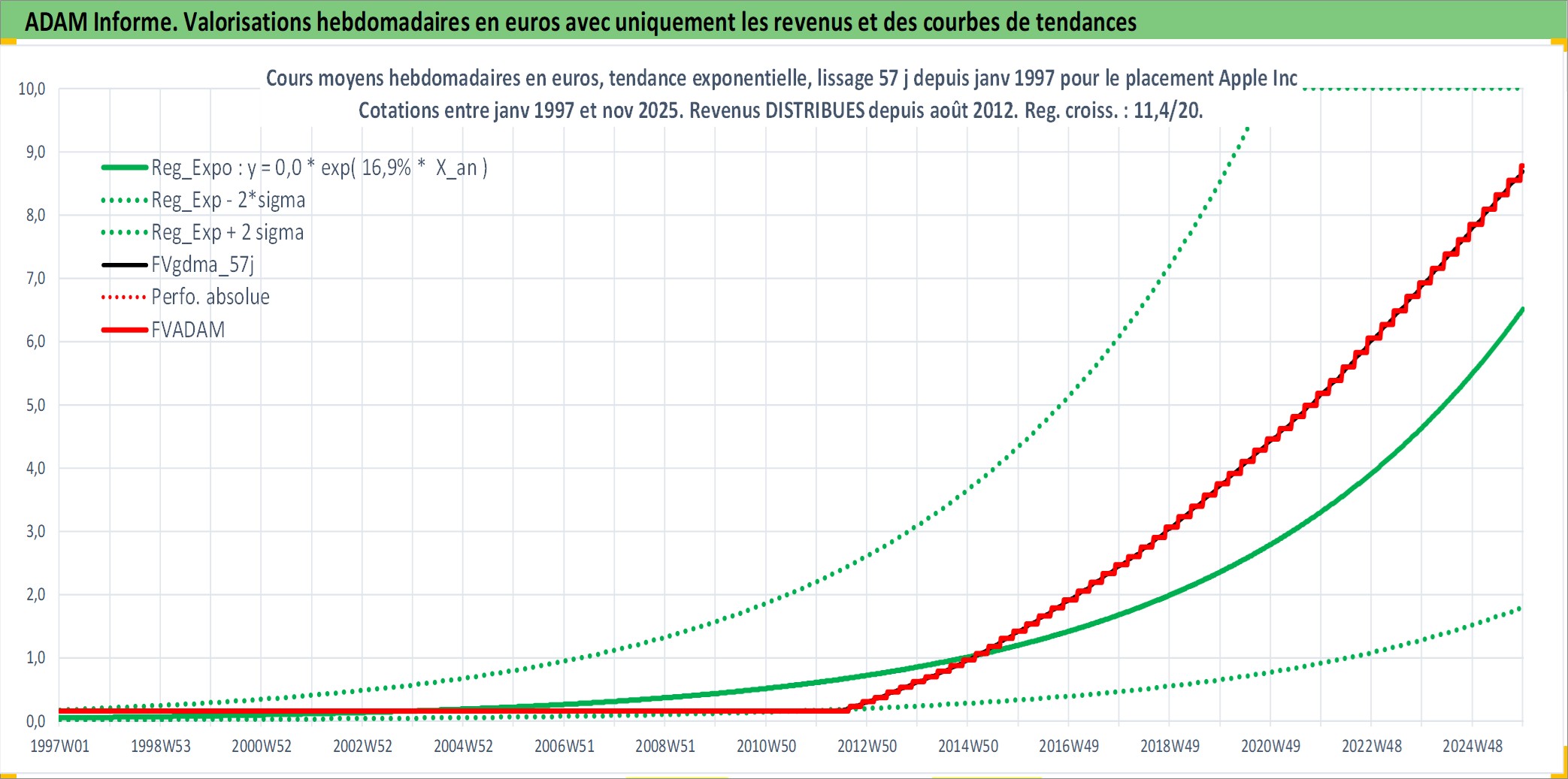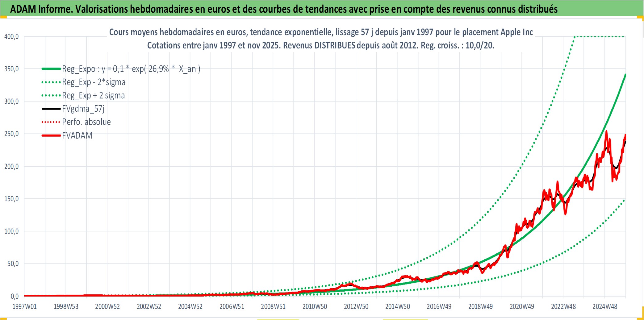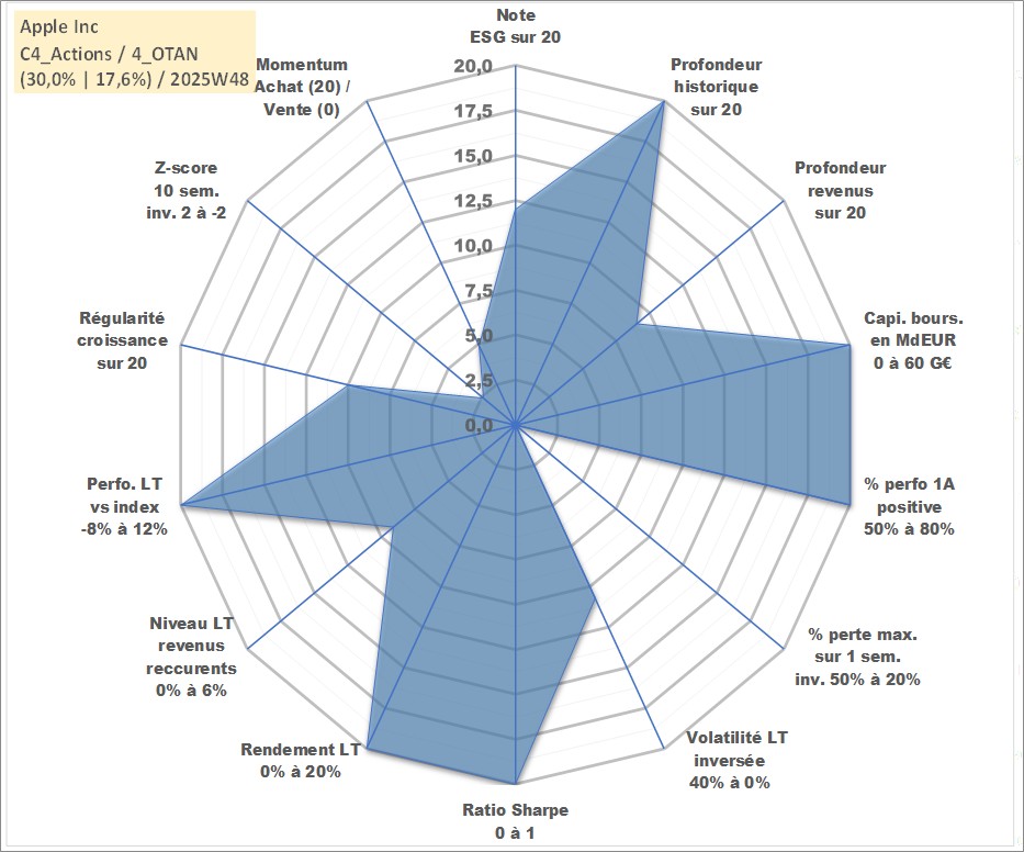 Site dédié aux investisseursPage dédiée sur site financeAnalyse des valorisations hebdomadaires de l'action Apple Inc. Cet actif est cote en USD. Les valorisations sont en contrevaleur EURO et couvrent les semaines 1997W01 a 2025W48. Les revenus de cet actif financier sont pris en compte depuis la semaine 2012W32. La note globale ESG de cet actif est estimee a 12.0 (apres rebasage entre 0 et 20).