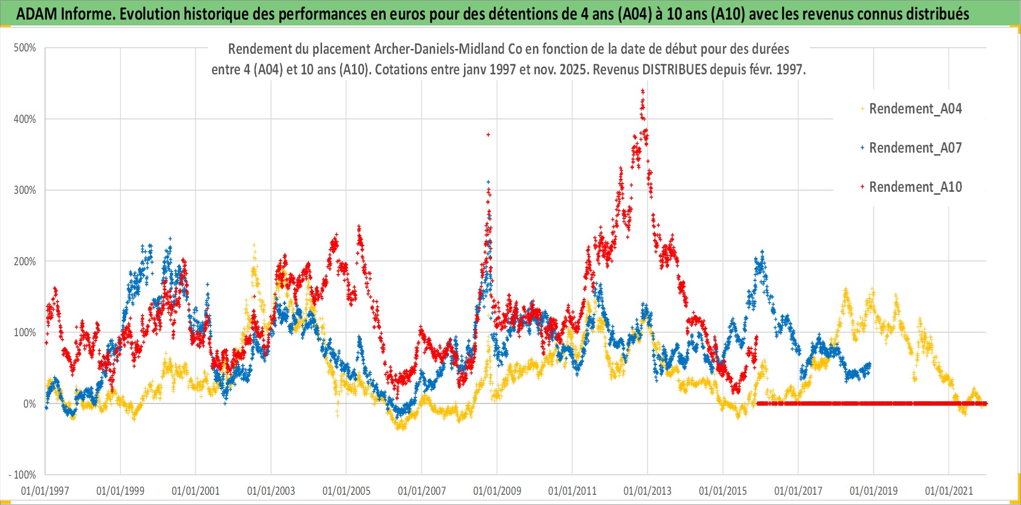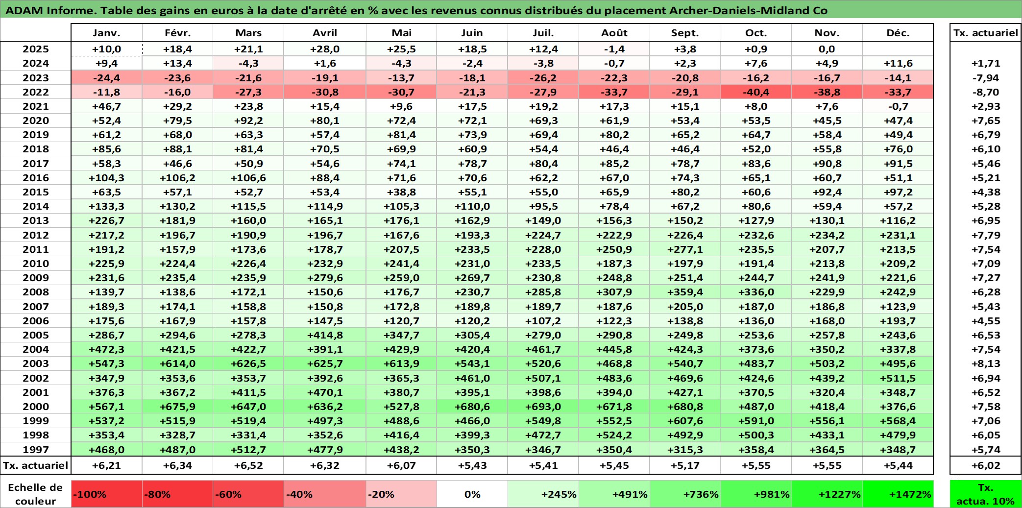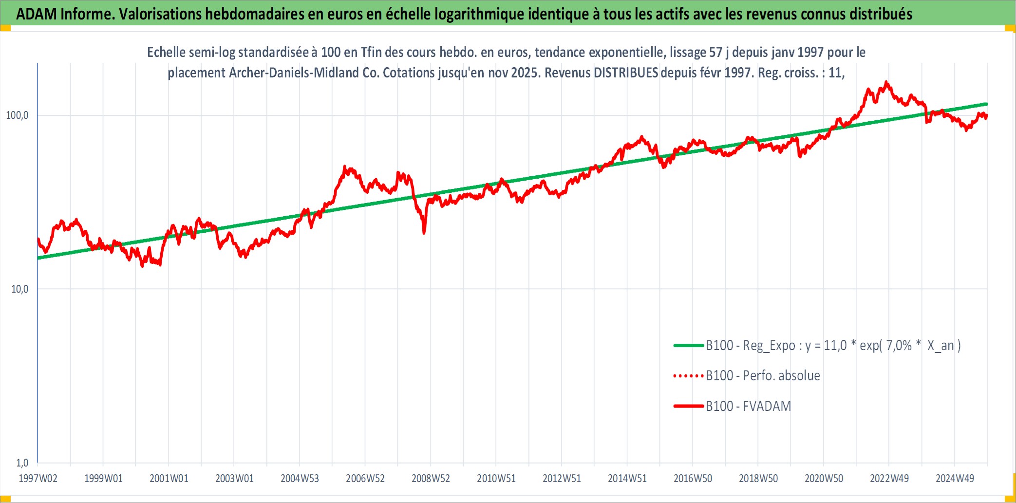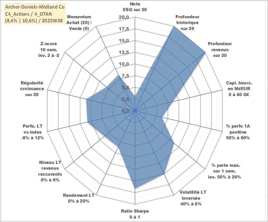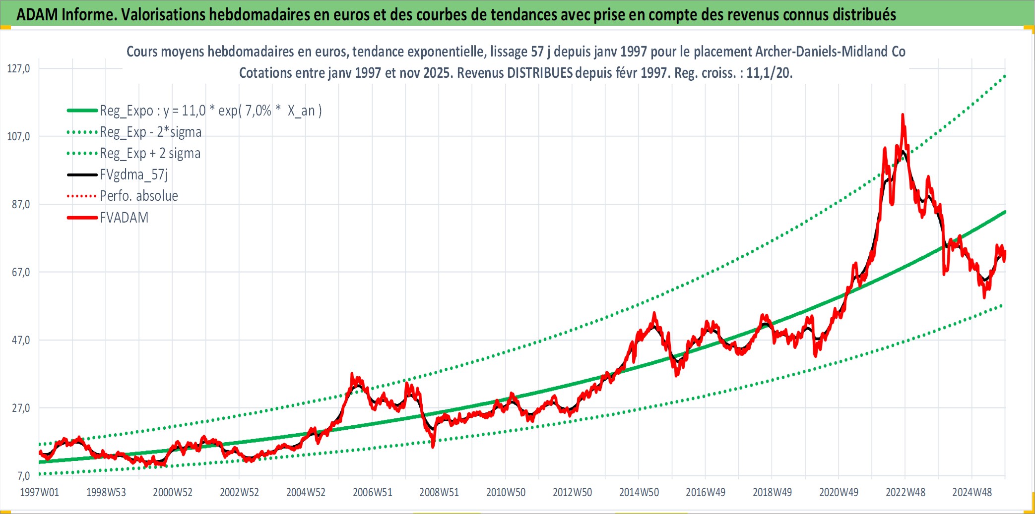 Site dédié aux investisseursPage dédiée sur site financeAnalyse des valorisations hebdomadaires de l'action Archer-Daniels-Midland Co. Cet actif est cote en USD. Les valorisations sont en contrevaleur EURO et couvrent les semaines 1997W01 a 2025W48. Les revenus de cet actif financier sont pris en compte depuis la semaine 1997W06. La note globale ESG de cet actif est estimee a 3.0 (apres rebasage entre 0 et 20).