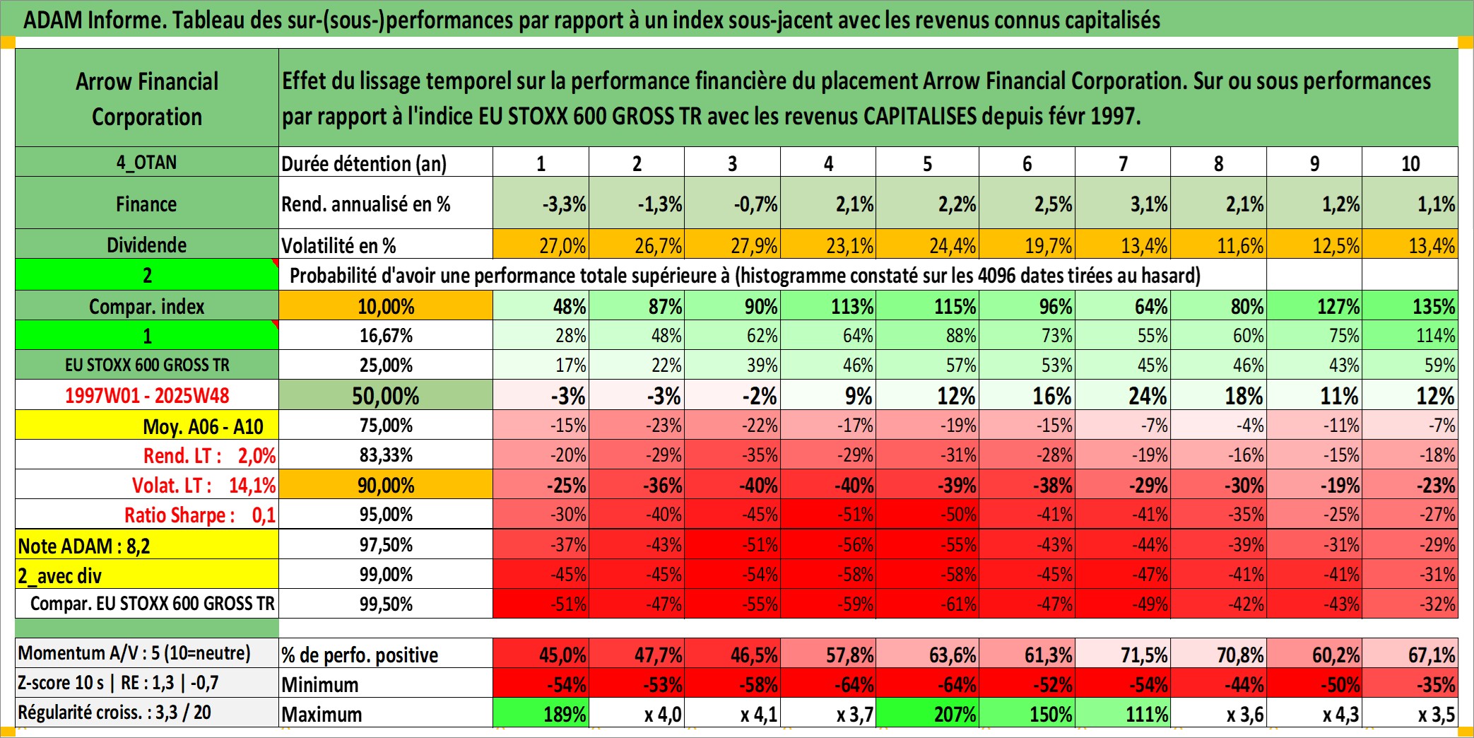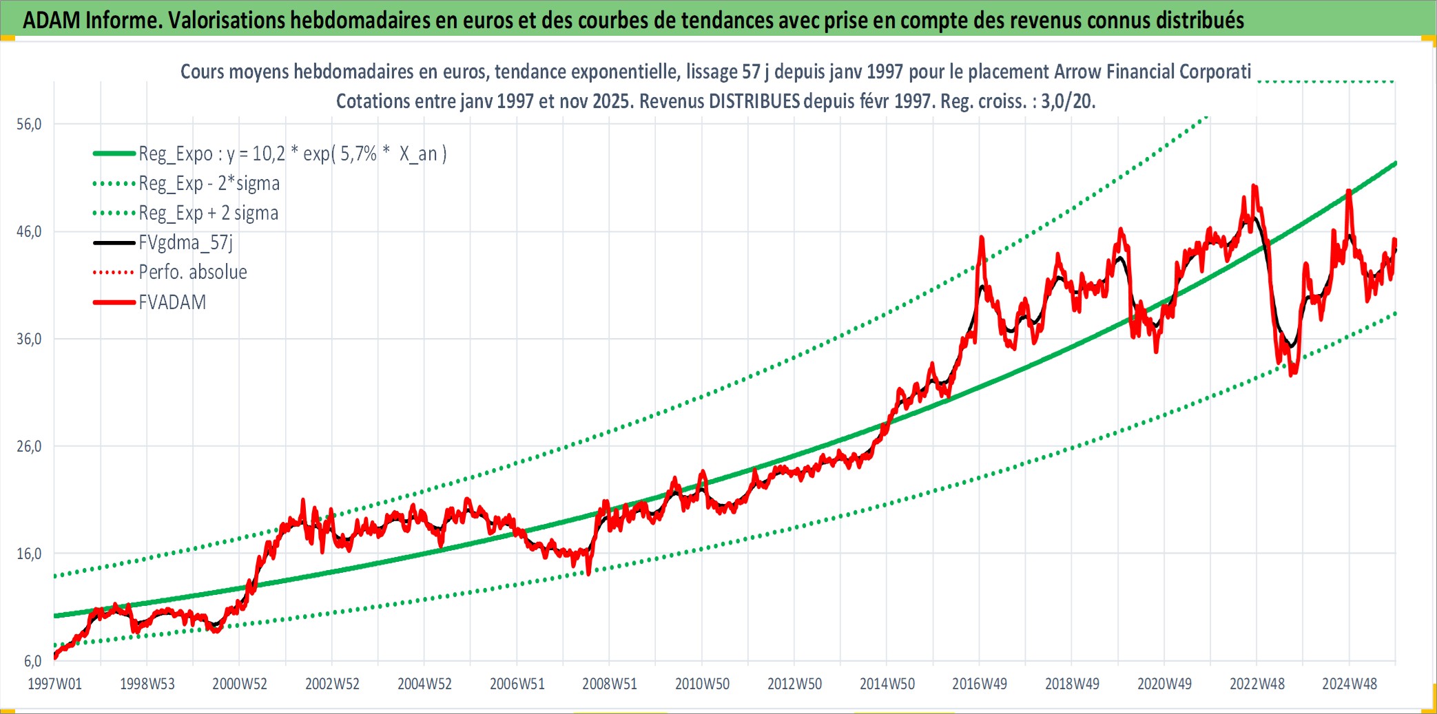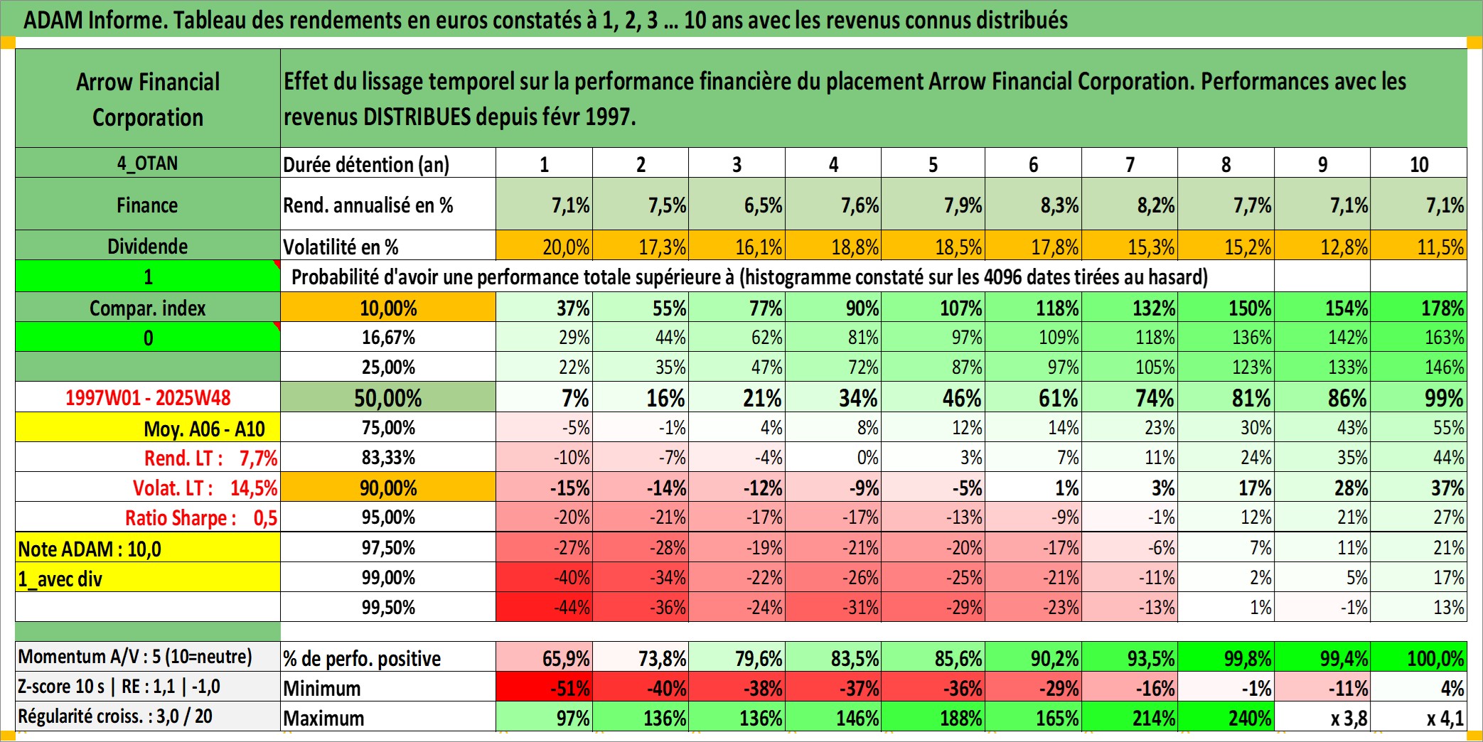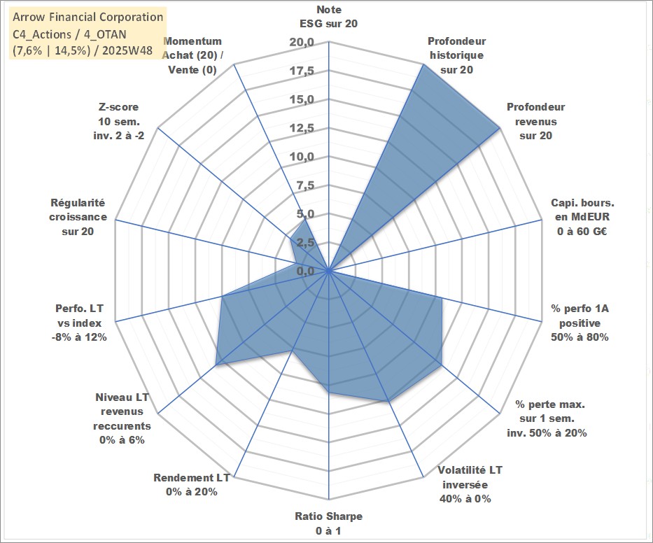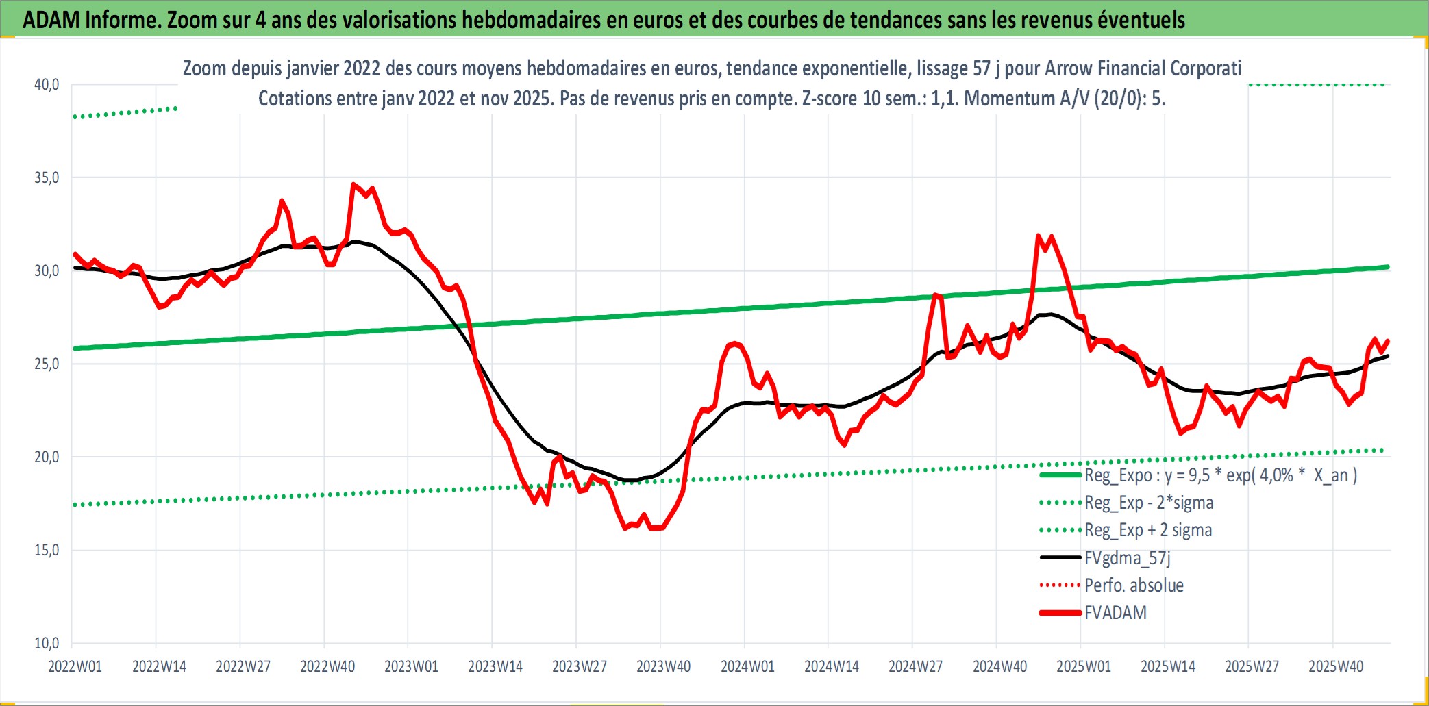 Site dédié aux investisseursPage dédiée sur site financeAnalyse des valorisations hebdomadaires de l'action Arrow Financial Corporation. Cet actif est cote en USD. Les valorisations sont en contrevaleur EURO et couvrent les semaines 1997W01 a 2025W48. Les revenus de cet actif financier sont pris en compte depuis la semaine 1997W09. La note ESG de cet actif n'est pas connue.
