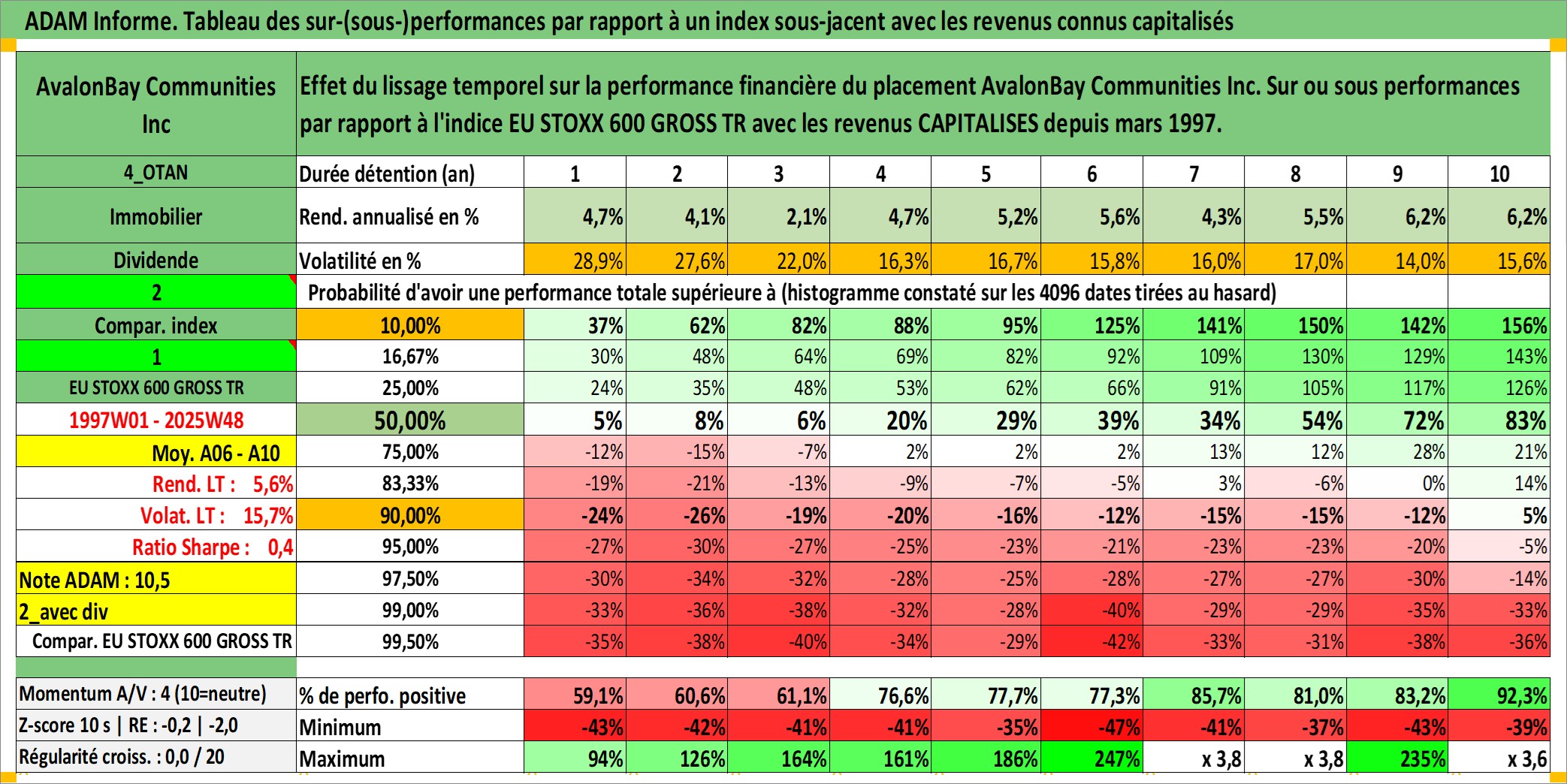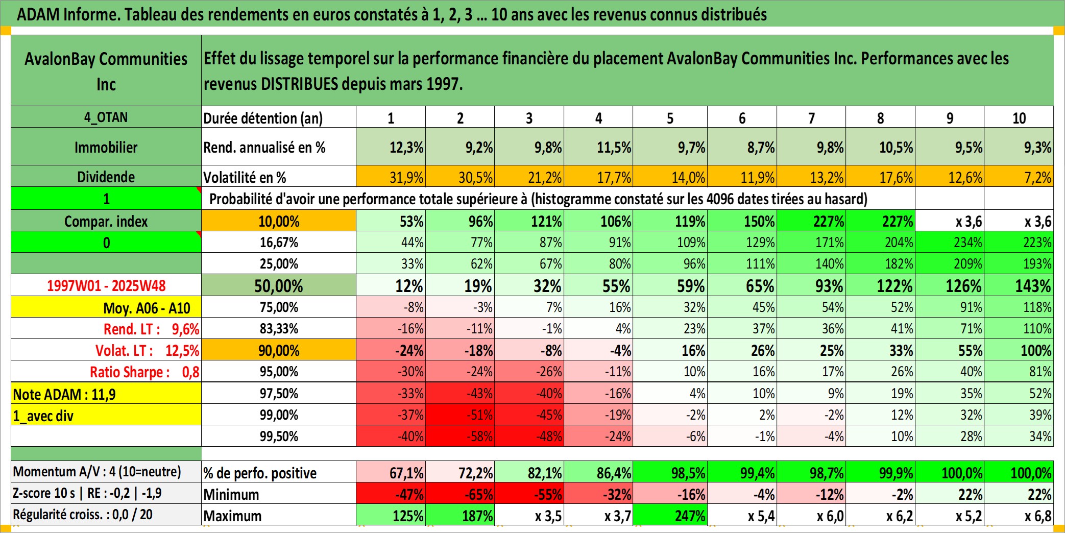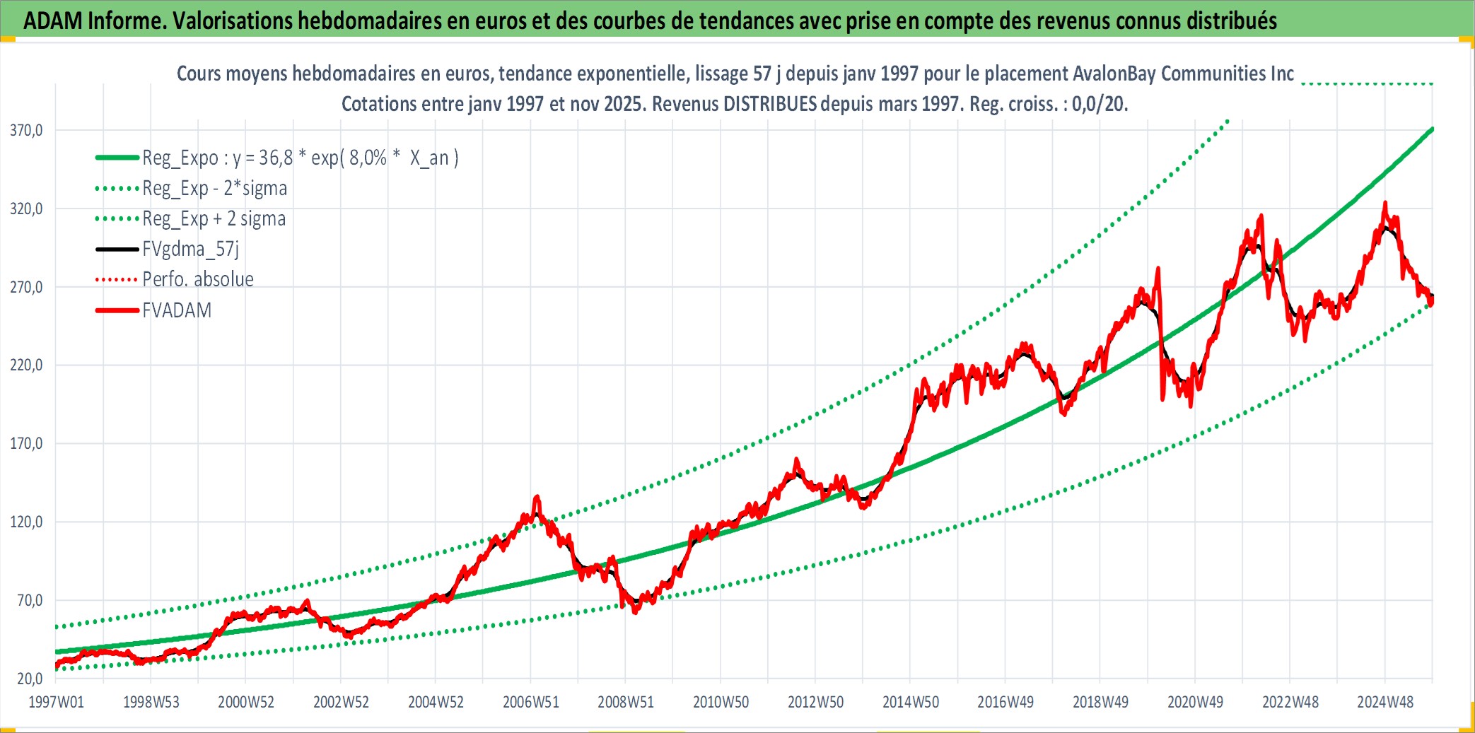 Site dédié aux investisseursPage dédiée sur site financeAnalyse des valorisations hebdomadaires de l'action AvalonBay Communities Inc. Cet actif est cote en USD. Les valorisations sont en contrevaleur EURO et couvrent les semaines 1997W01 a 2025W48. Les revenus de cet actif financier sont pris en compte depuis la semaine 1997W13. La note globale ESG de cet actif est estimee a 16.0 (apres rebasage entre 0 et 20).