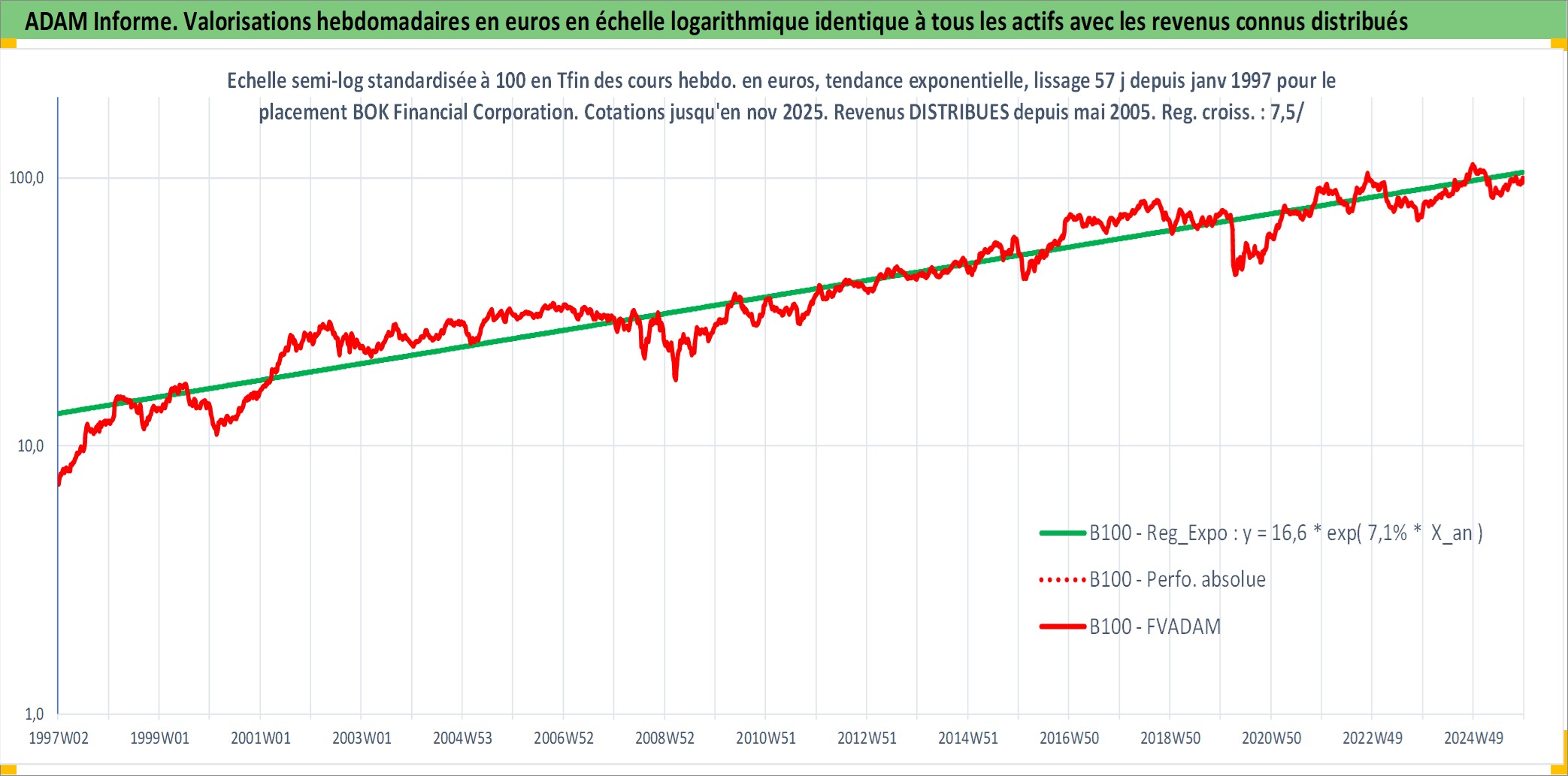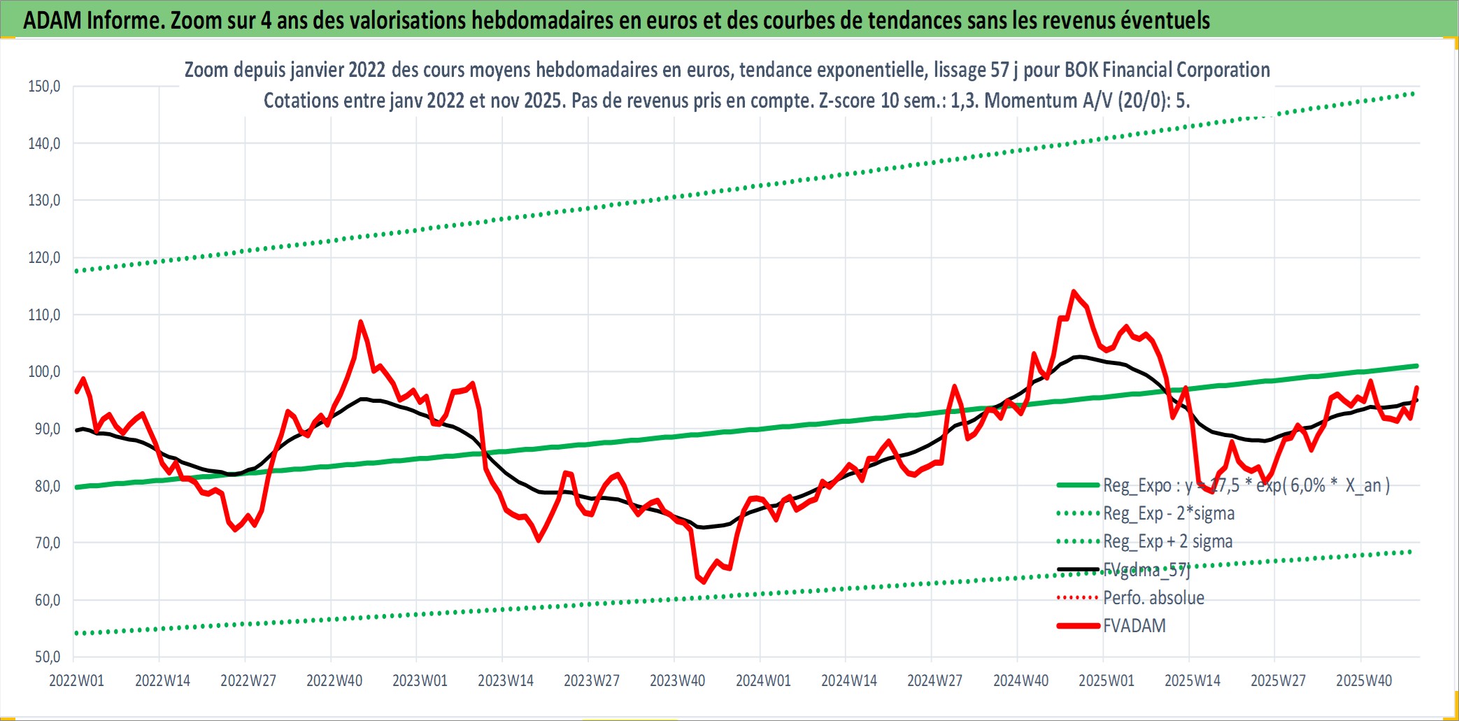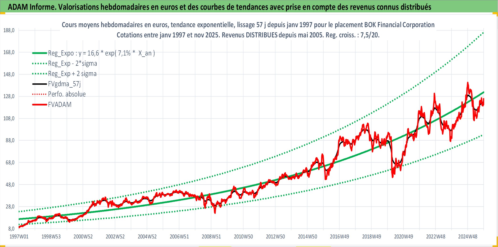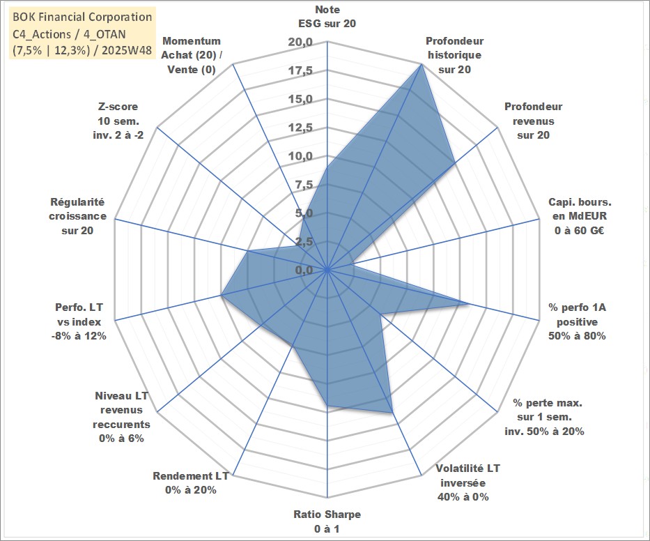 Site dédié aux investisseursPage dédiée sur site financeAnalyse des valorisations hebdomadaires de l'action BOK Financial Corporation. Cet actif est cote en USD. Les valorisations sont en contrevaleur EURO et couvrent les semaines 1997W01 a 2025W48. Les revenus de cet actif financier sont pris en compte depuis la semaine 2005W19. La note globale ESG de cet actif est estimee a 9.0 (apres rebasage entre 0 et 20).