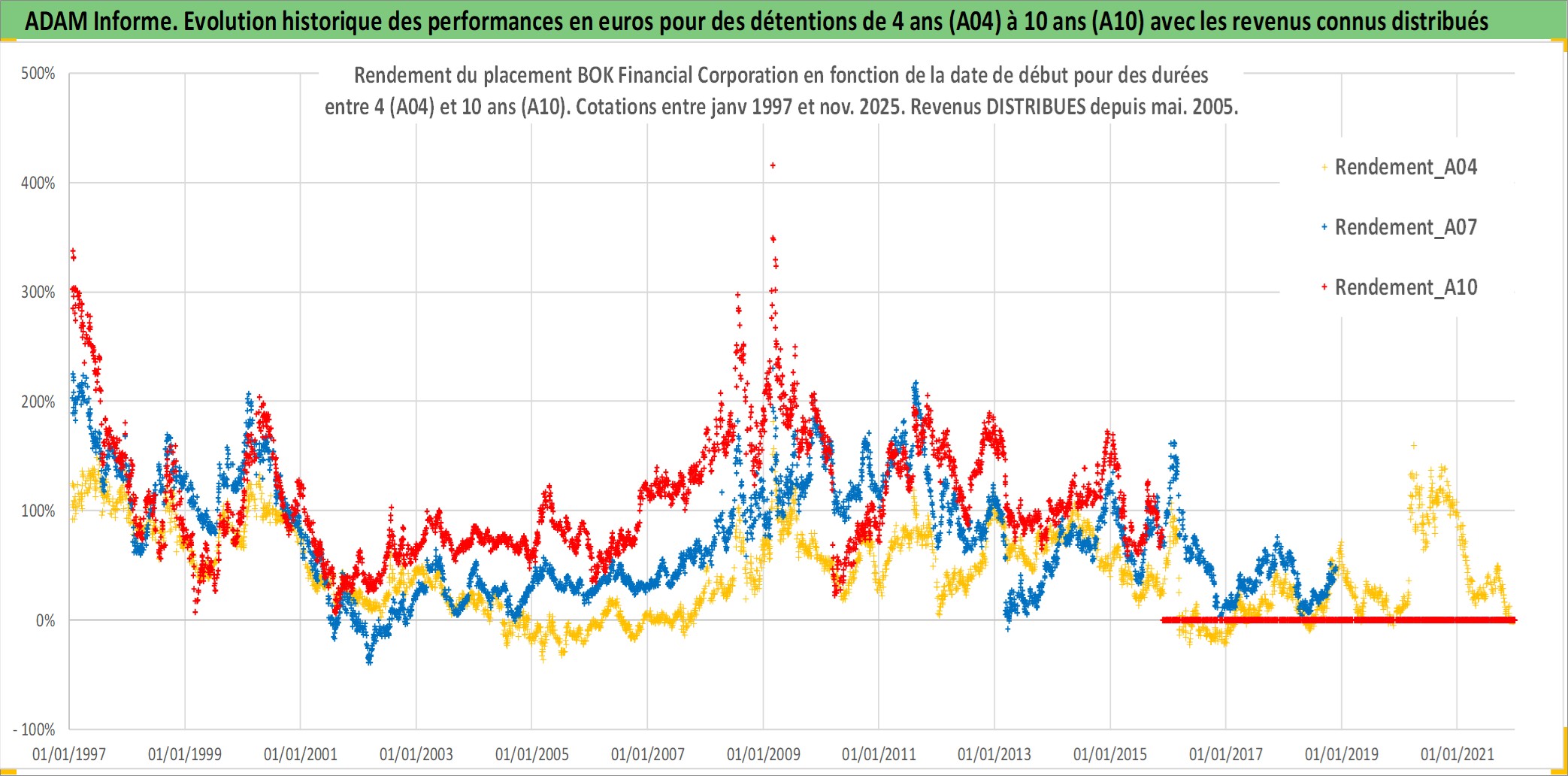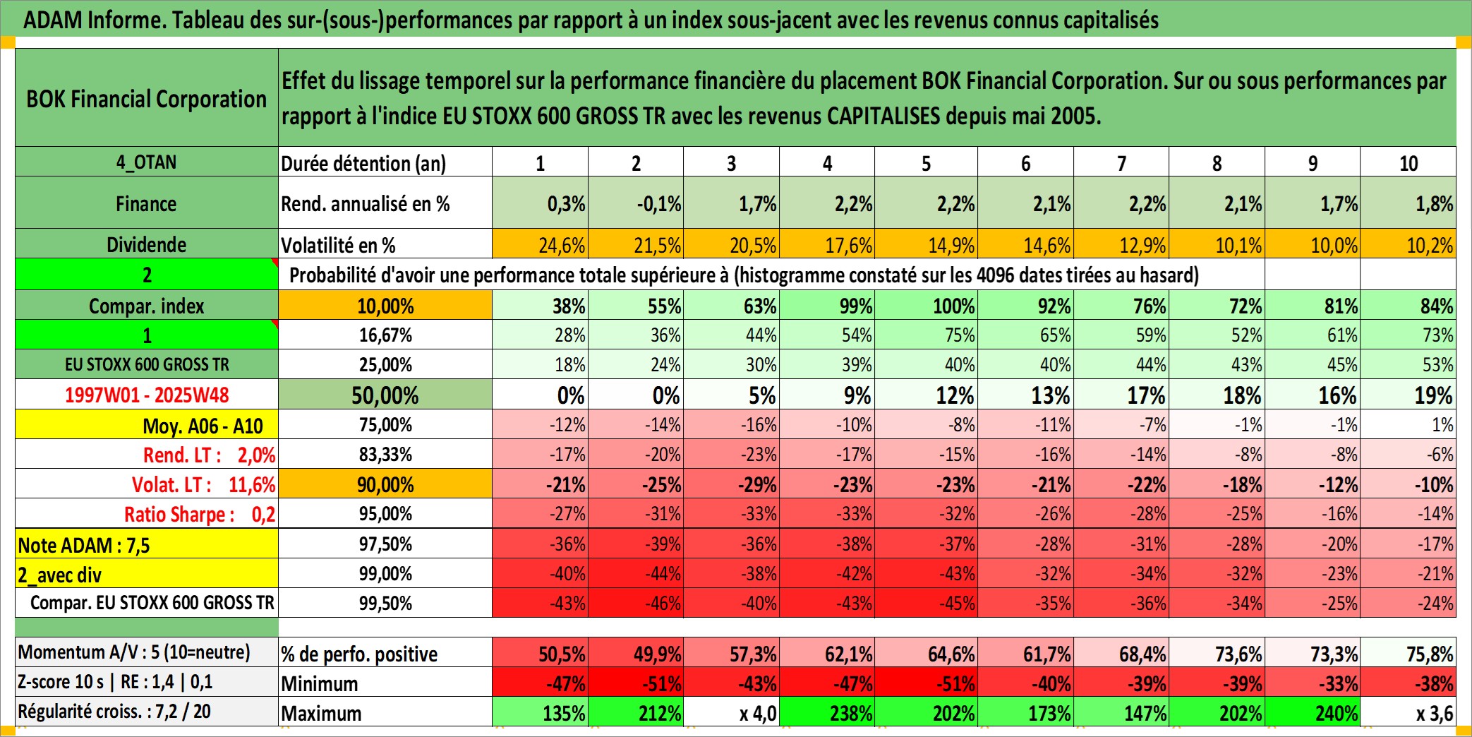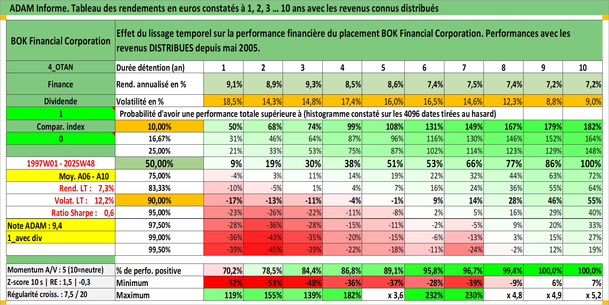 Site dédié aux investisseursPage dédiée sur site financeAnalyse des valorisations hebdomadaires de l'action BOK Financial Corporation. Cet actif est cote en USD. Les valorisations sont en contrevaleur EURO et couvrent les semaines 1997W01 a 2025W48. Les revenus de cet actif financier sont pris en compte depuis la semaine 2005W19. La note globale ESG de cet actif est estimee a 9.0 (apres rebasage entre 0 et 20).