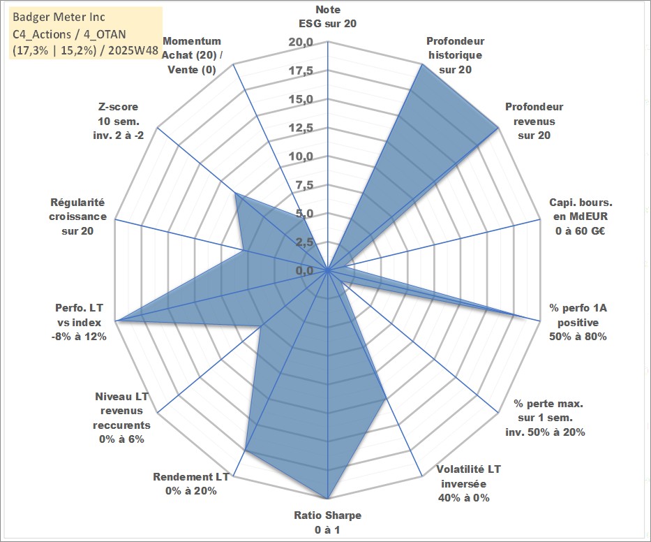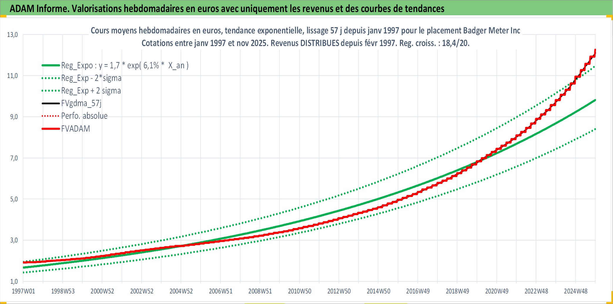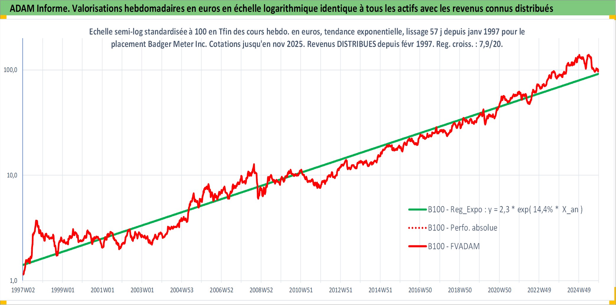 Site dédié aux investisseursPage dédiée sur site financeAnalyse des valorisations hebdomadaires de l'action Badger Meter Inc. Cet actif est cote en USD. Les valorisations sont en contrevaleur EURO et couvrent les semaines 1997W01 a 2025W48. Les revenus de cet actif financier sont pris en compte depuis la semaine 1997W09. La note ESG de cet actif n'est pas connue.