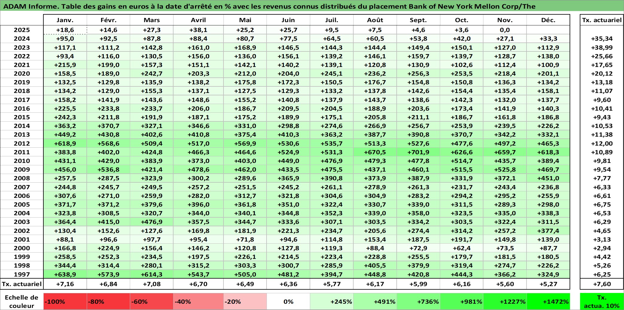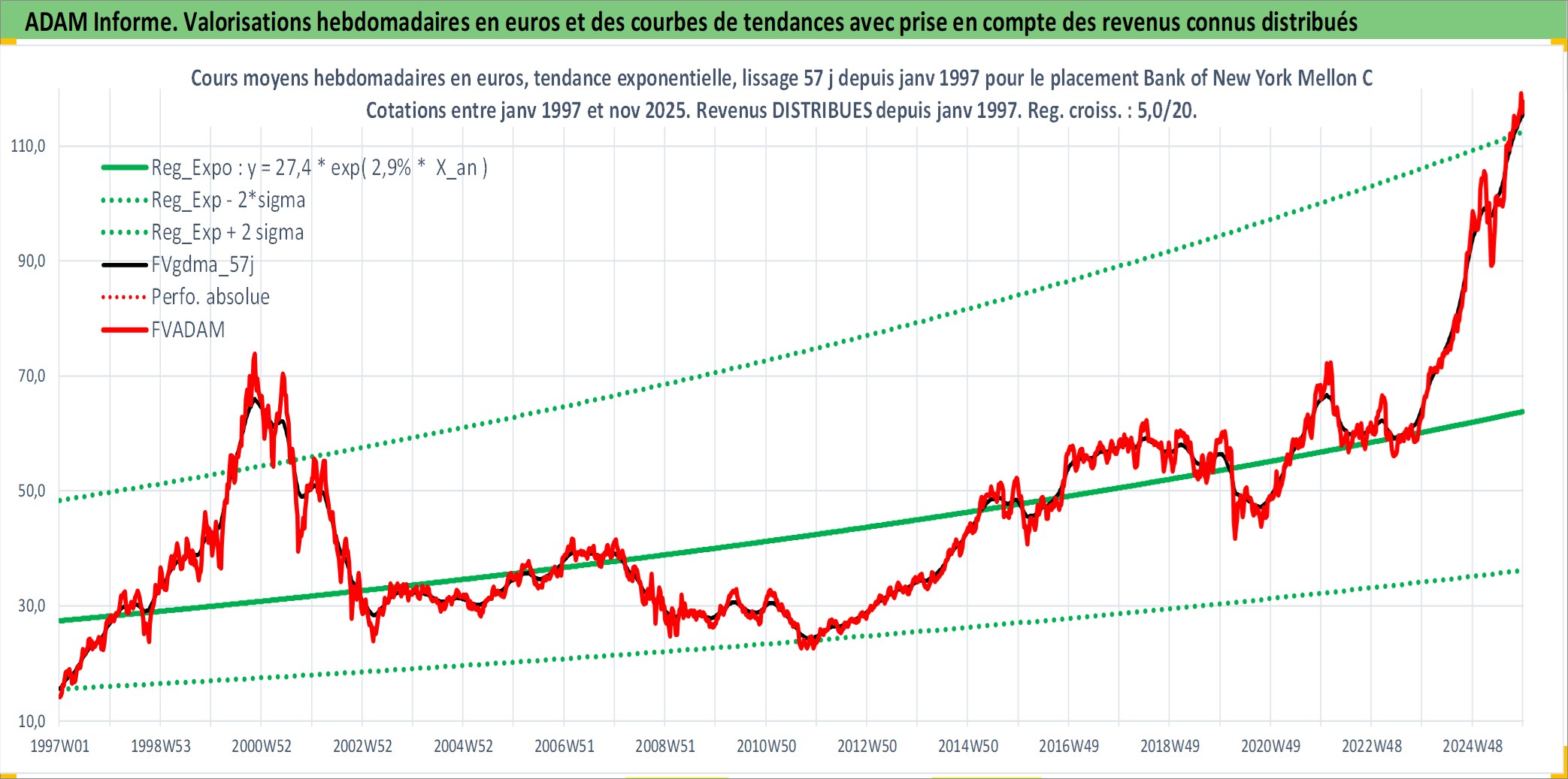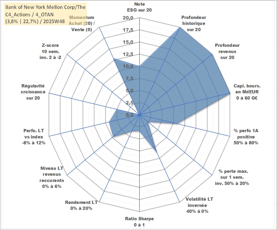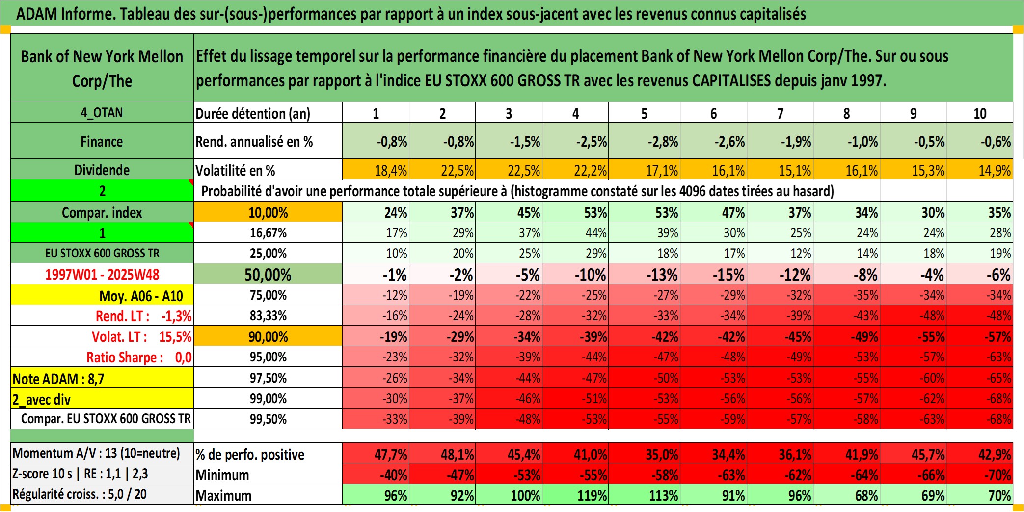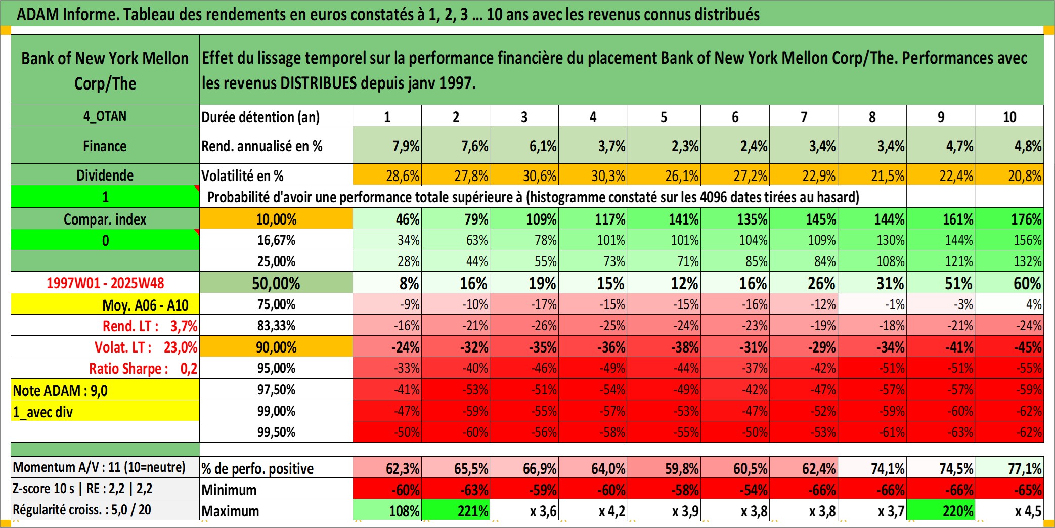 Site dédié aux investisseursPage dédiée sur site financeAnalyse des valorisations hebdomadaires de l'action Bank of New York Mellon Corp/The. Cet actif est cote en USD. Les valorisations sont en contrevaleur EURO et couvrent les semaines 1997W01 a 2025W48. Les revenus de cet actif financier sont pris en compte depuis la semaine 1997W04. La note globale ESG de cet actif est estimee a 10.0 (apres rebasage entre 0 et 20).
