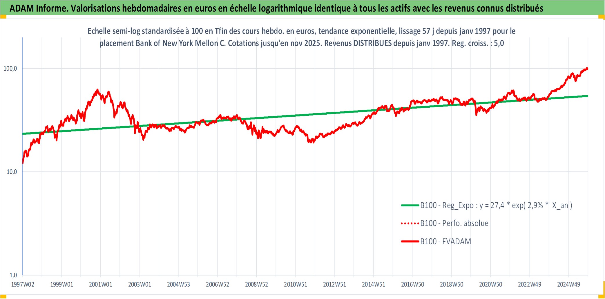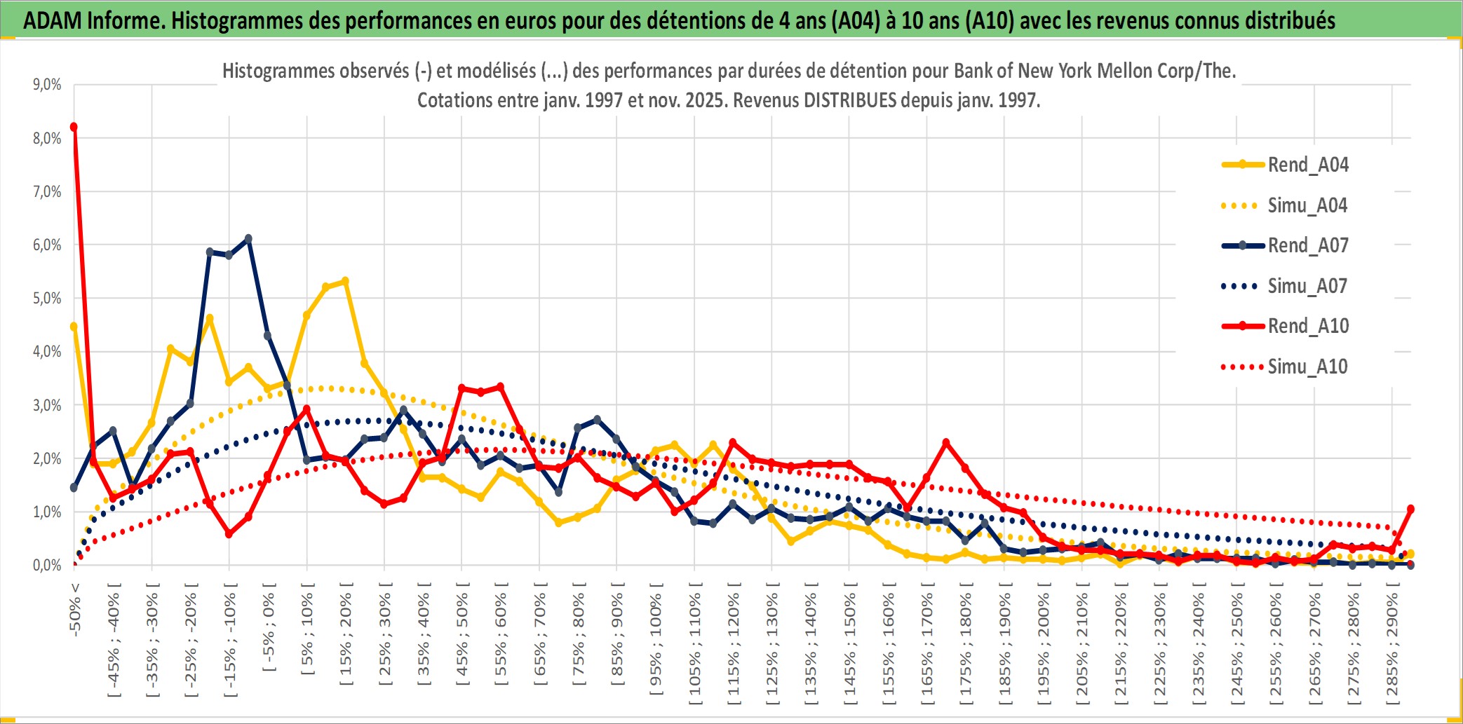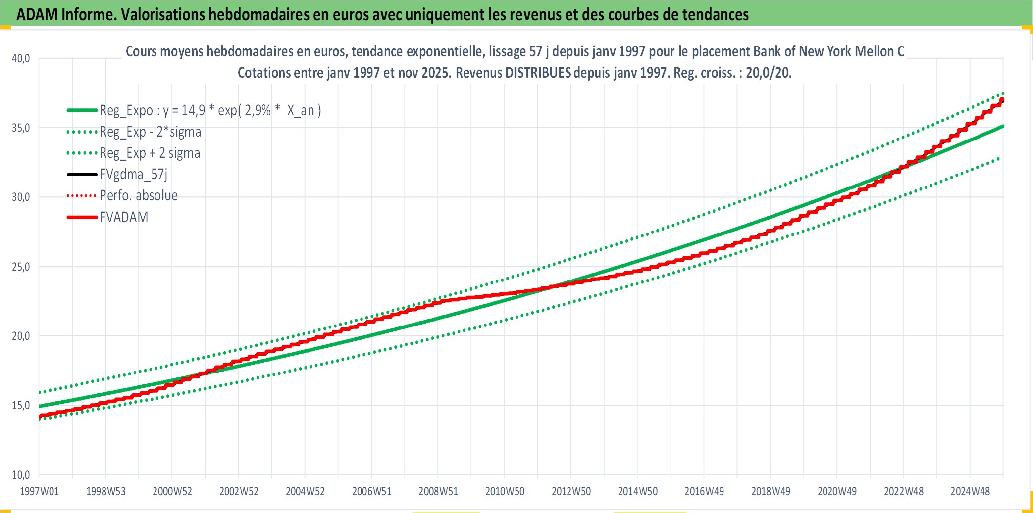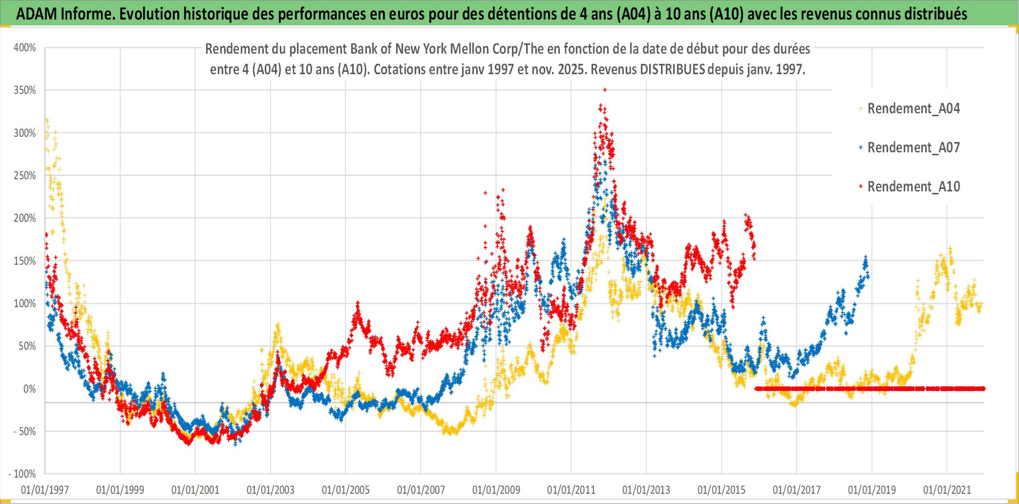 Site dédié aux investisseursPage dédiée sur site financeAnalyse des valorisations hebdomadaires de l'action Bank of New York Mellon Corp/The. Cet actif est cote en USD. Les valorisations sont en contrevaleur EURO et couvrent les semaines 1997W01 a 2025W48. Les revenus de cet actif financier sont pris en compte depuis la semaine 1997W04. La note globale ESG de cet actif est estimee a 10.0 (apres rebasage entre 0 et 20).