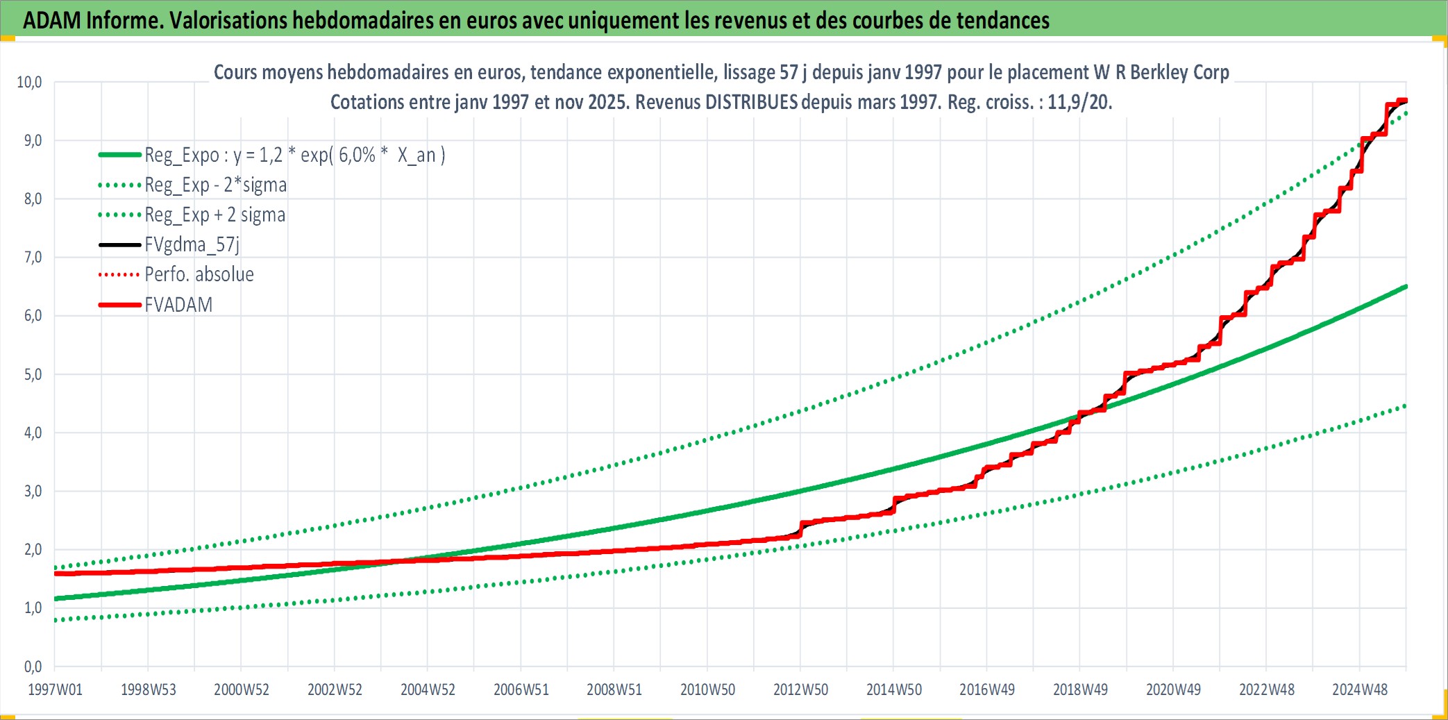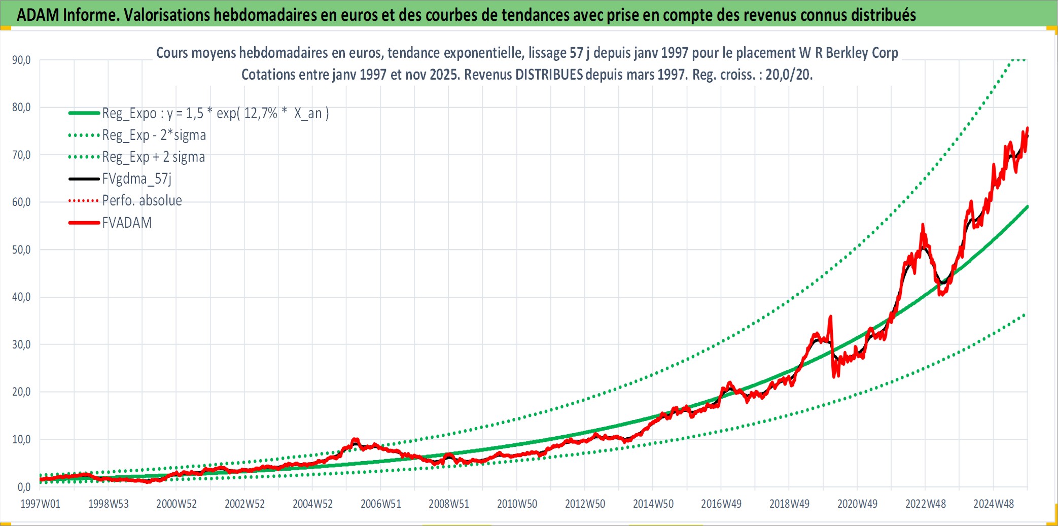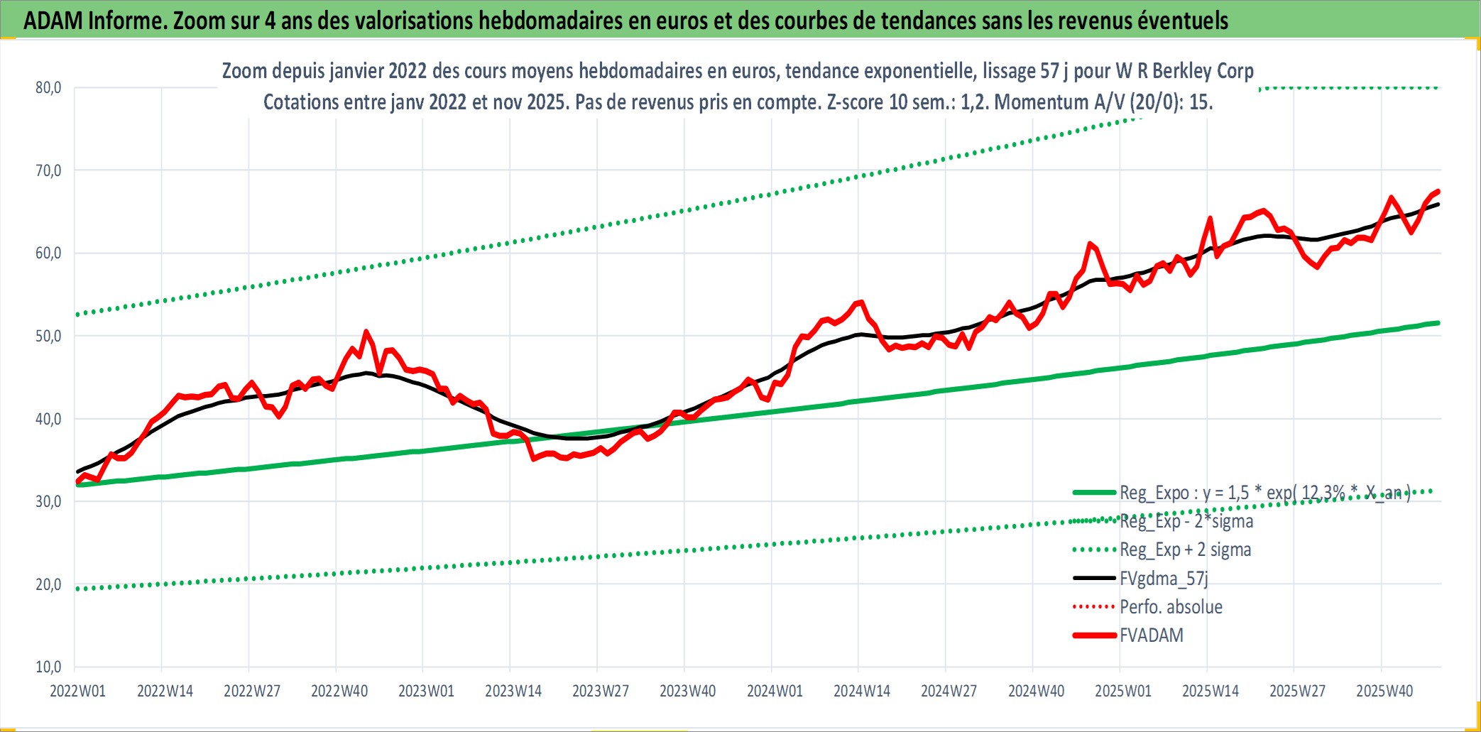 Site dédié aux investisseursPage dédiée sur site financeAnalyse des valorisations hebdomadaires de l'action W R Berkley Corp. Cet actif est cote en USD. Les valorisations sont en contrevaleur EURO et couvrent les semaines 1997W01 a 2025W48. Les revenus de cet actif financier sont pris en compte depuis la semaine 1997W12. La note globale ESG de cet actif est estimee a 9.0 (apres rebasage entre 0 et 20).