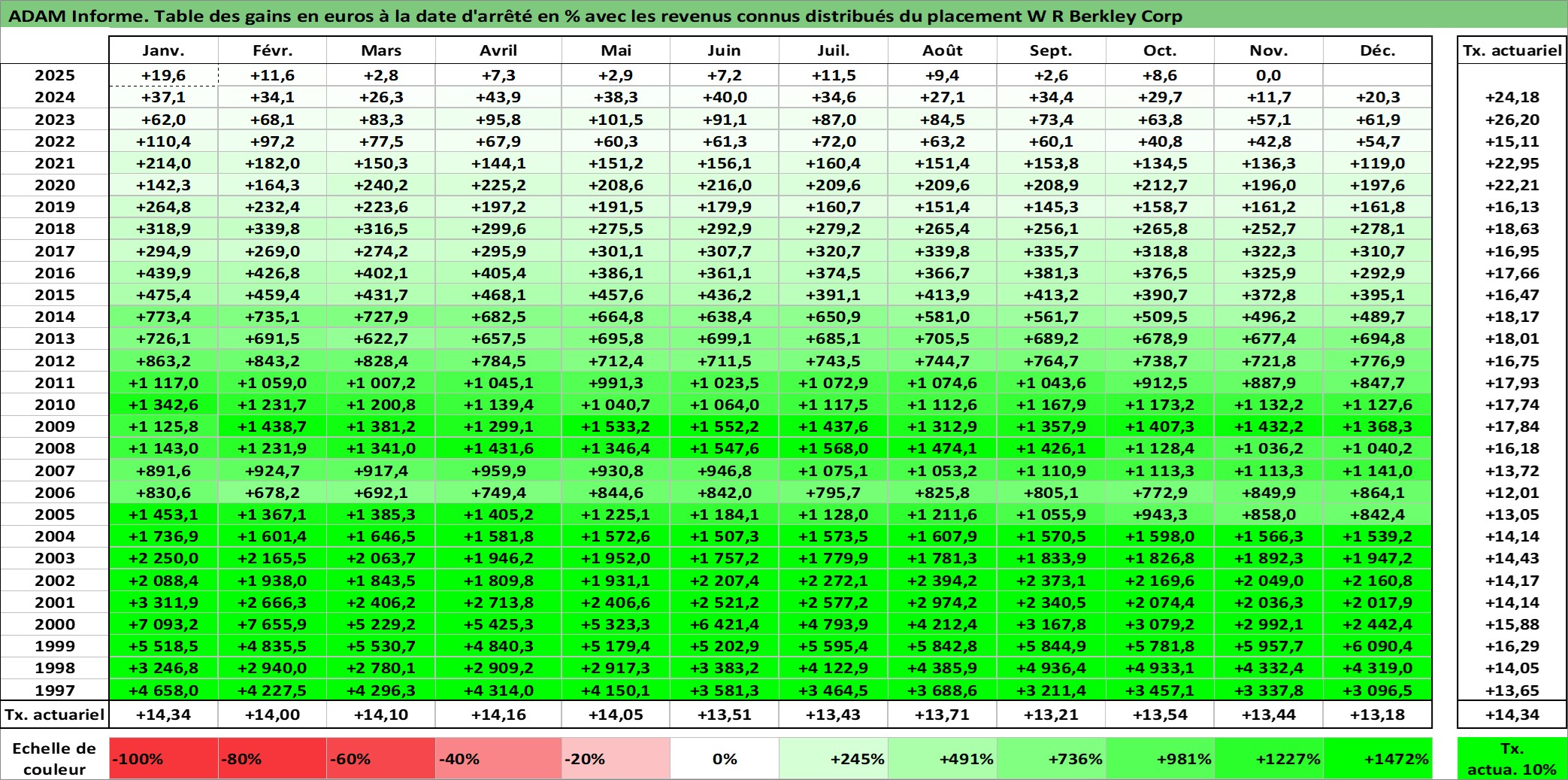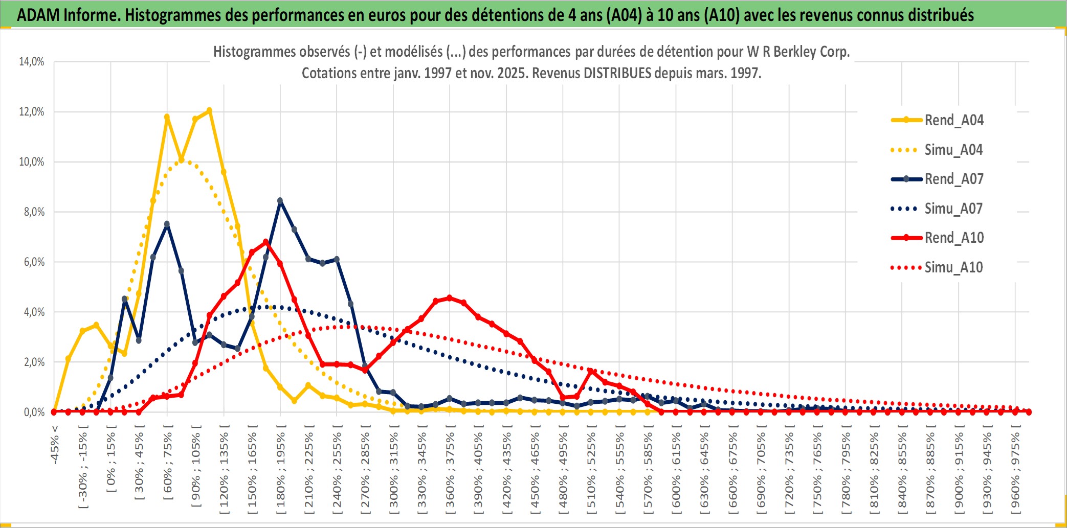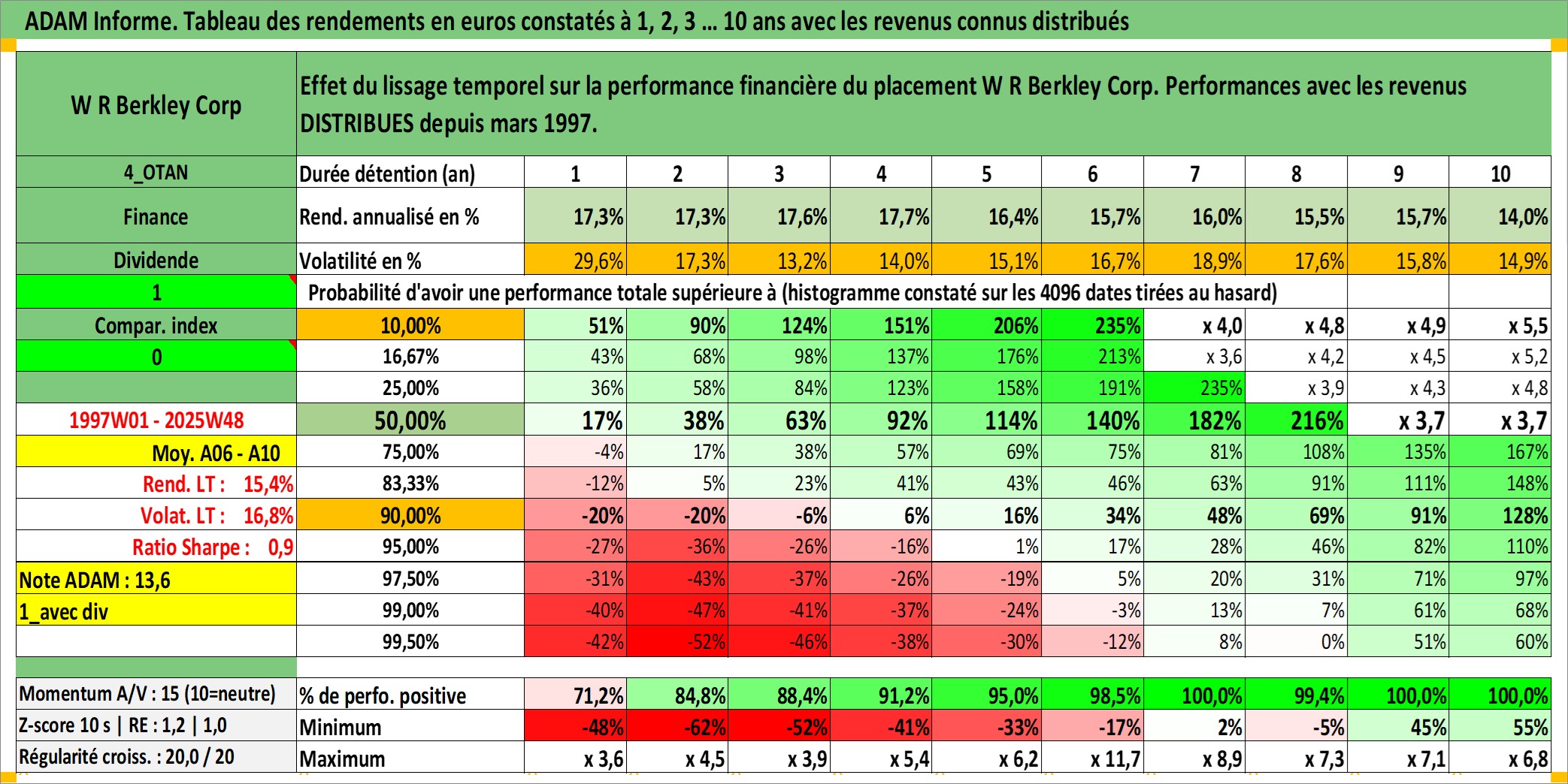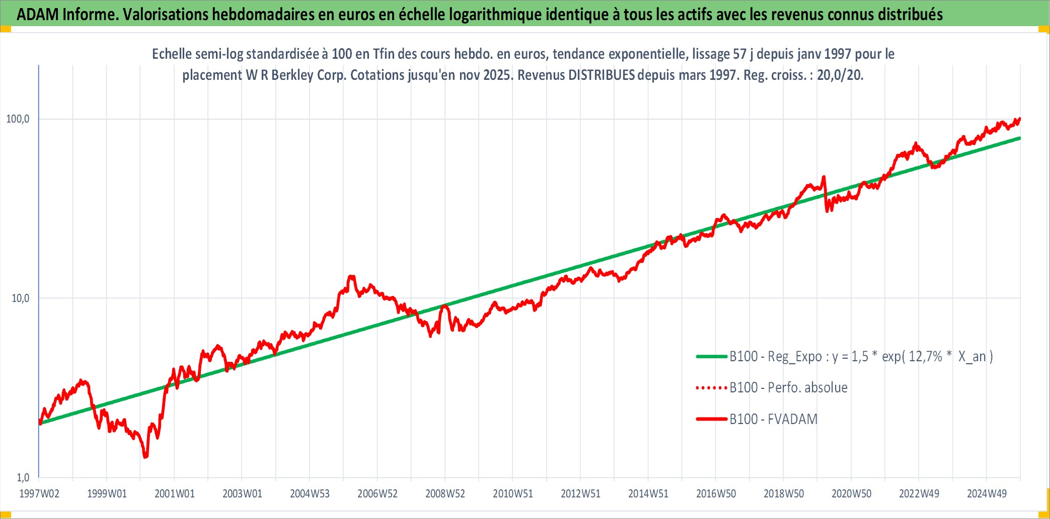 Site dédié aux investisseursPage dédiée sur site financeAnalyse des valorisations hebdomadaires de l'action W R Berkley Corp. Cet actif est cote en USD. Les valorisations sont en contrevaleur EURO et couvrent les semaines 1997W01 a 2025W48. Les revenus de cet actif financier sont pris en compte depuis la semaine 1997W12. La note globale ESG de cet actif est estimee a 9.0 (apres rebasage entre 0 et 20).