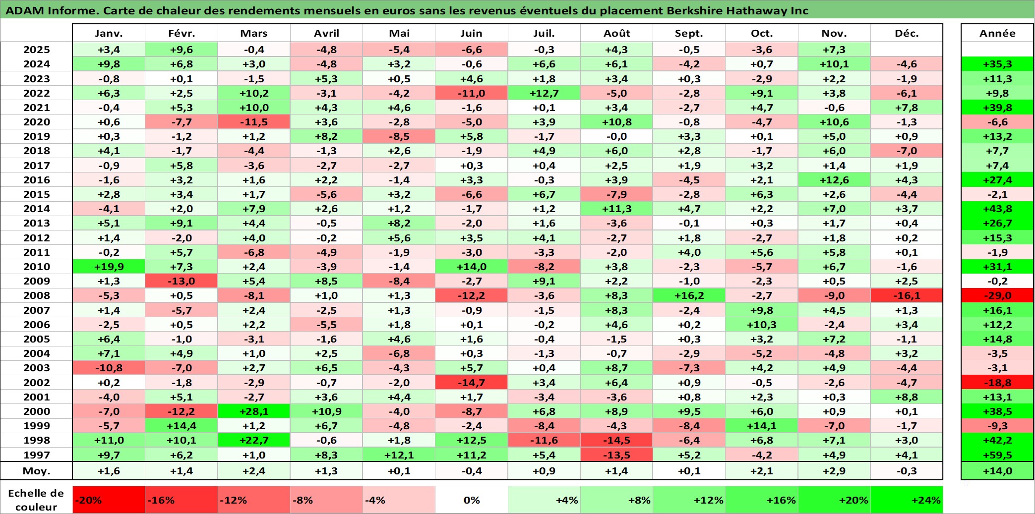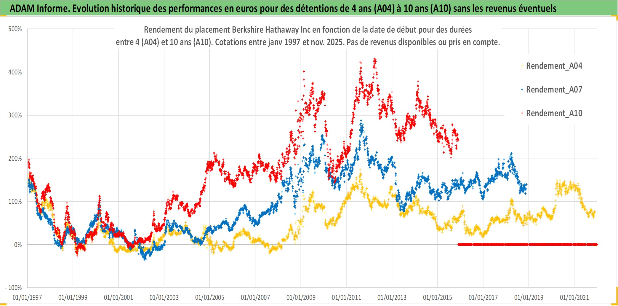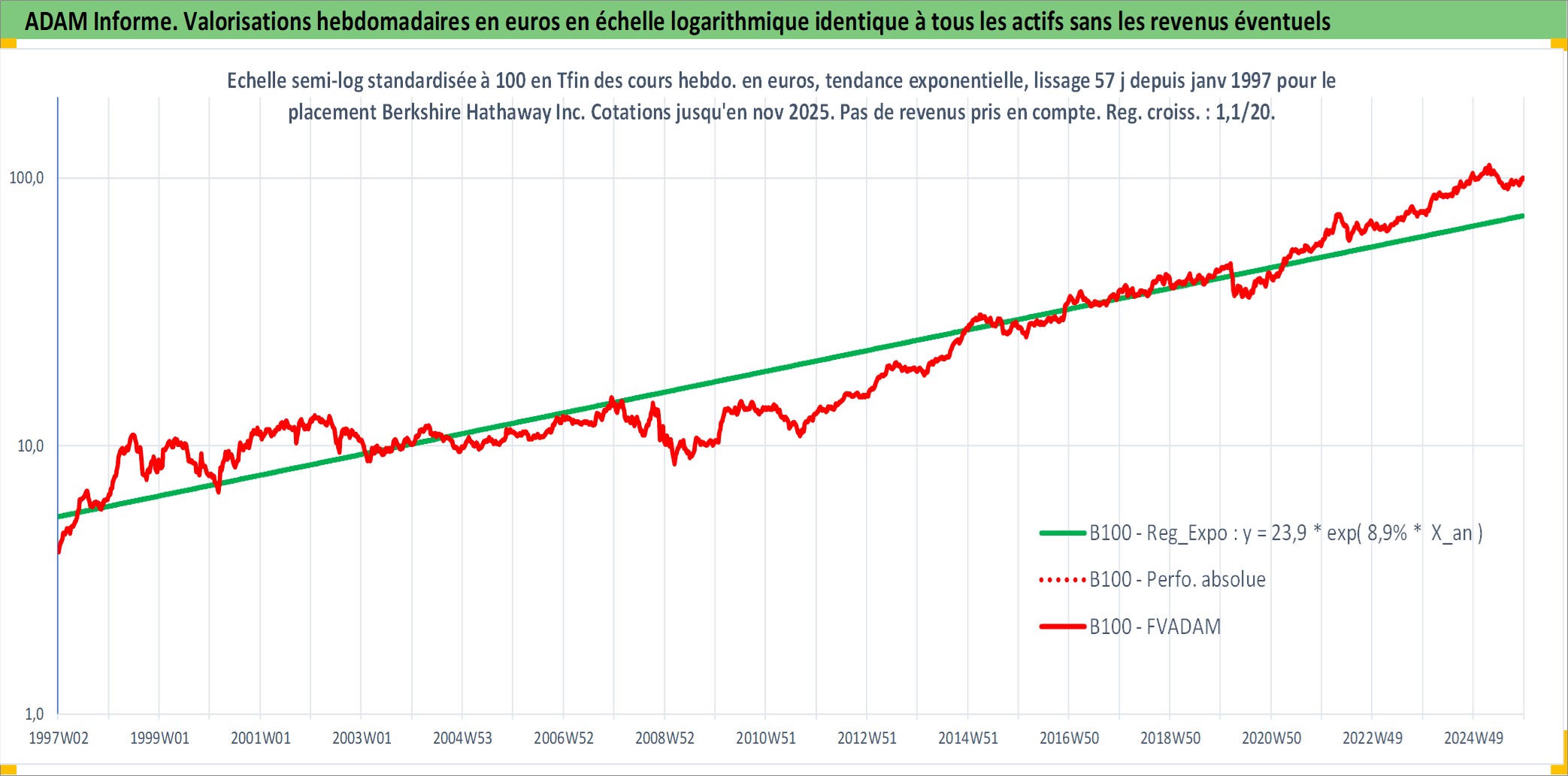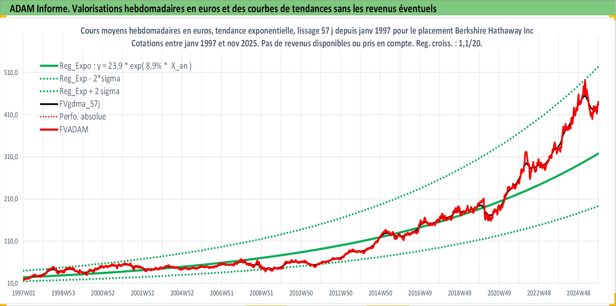 Site dédié aux investisseursPage dédiée sur site financeAnalyse des valorisations hebdomadaires de l'action Berkshire Hathaway Inc. Cet actif est cote en USD. Les valorisations sont en contrevaleur EURO et couvrent les semaines 1997W01 a 2025W48. Les revenus de cet actif financier ne sont pas connus car non existants ou non disponibles sur le site Yahoo Finance. La note globale ESG de cet actif est estimee a 13.0 (apres rebasage entre 0 et 20).