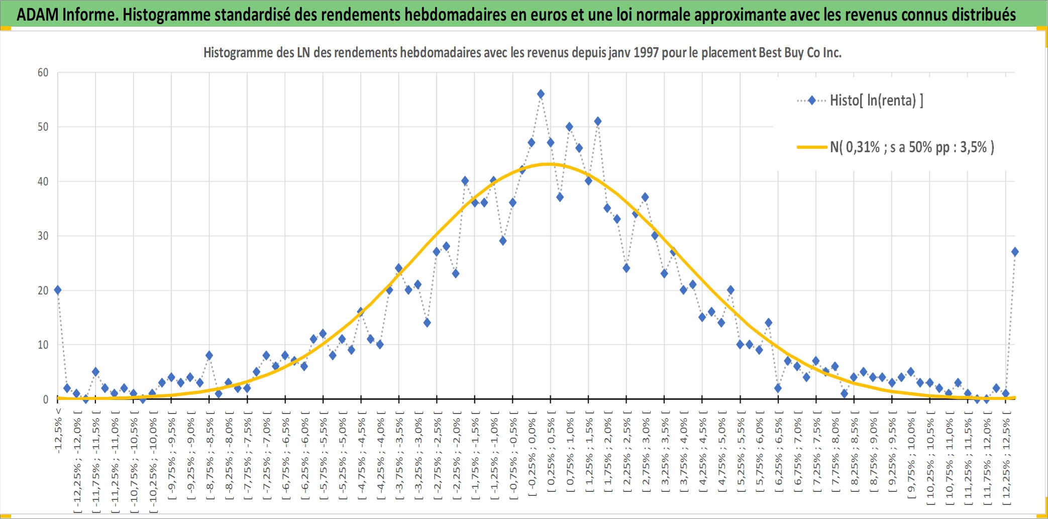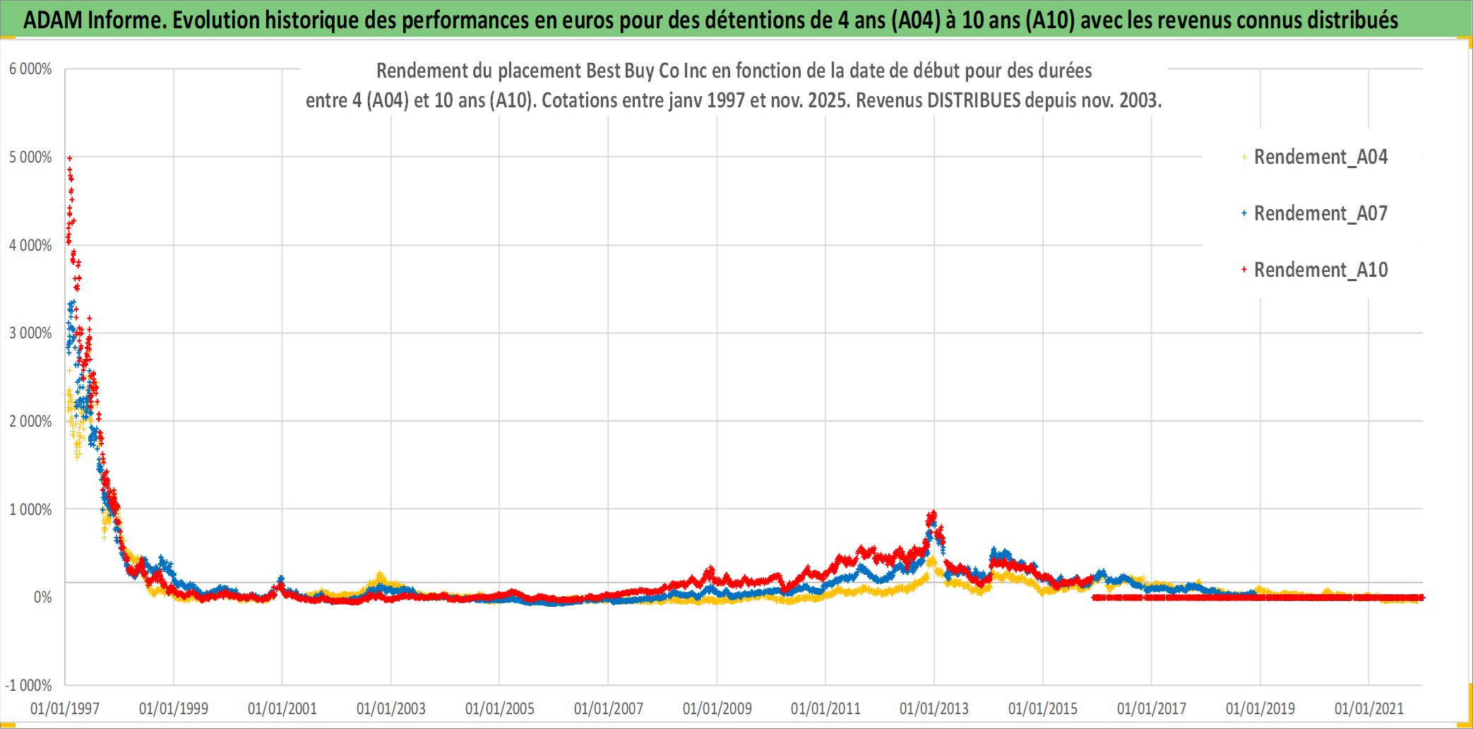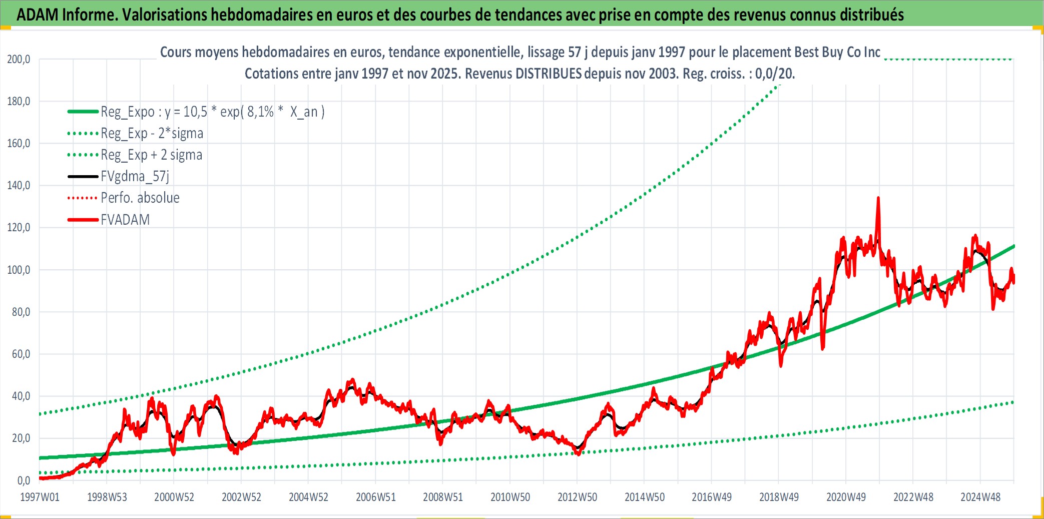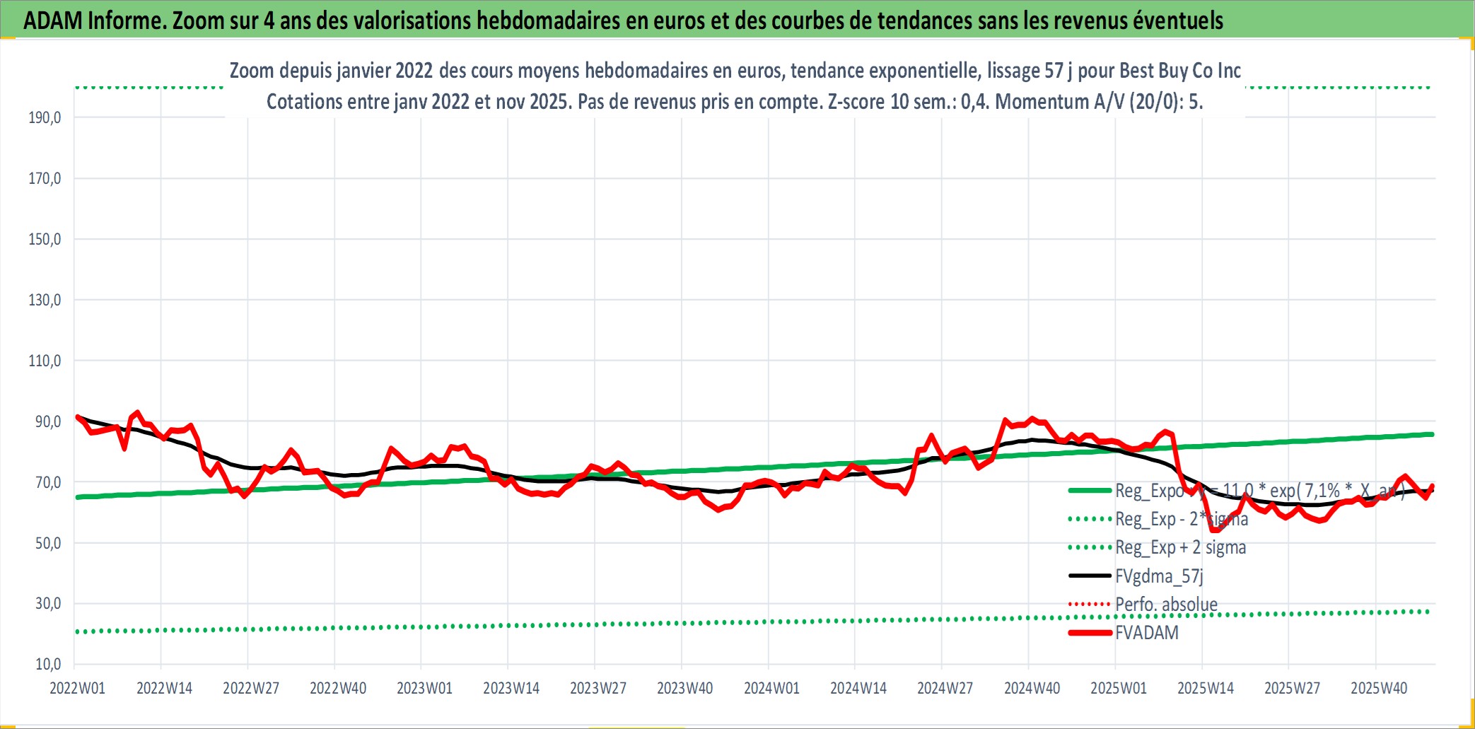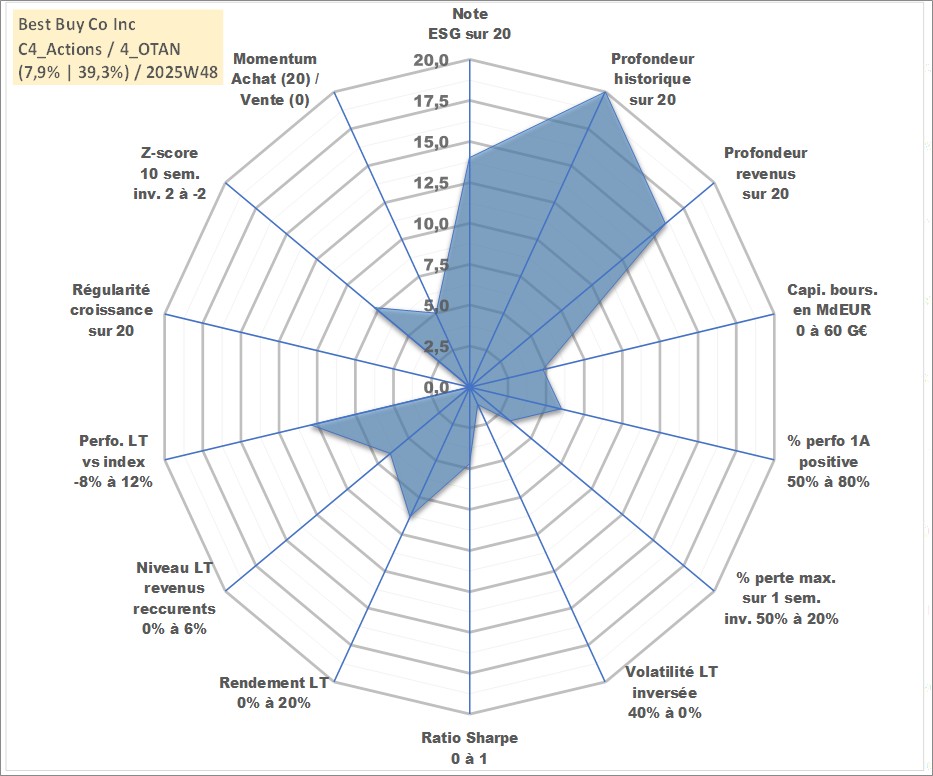 Site dédié aux investisseursPage dédiée sur site financeAnalyse des valorisations hebdomadaires de l'action Best Buy Co Inc. Cet actif est cote en USD. Les valorisations sont en contrevaleur EURO et couvrent les semaines 1997W01 a 2025W48. Les revenus de cet actif financier sont pris en compte depuis la semaine 2003W46. La note globale ESG de cet actif est estimee a 14.0 (apres rebasage entre 0 et 20).