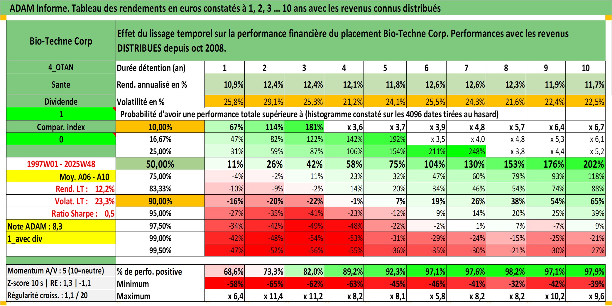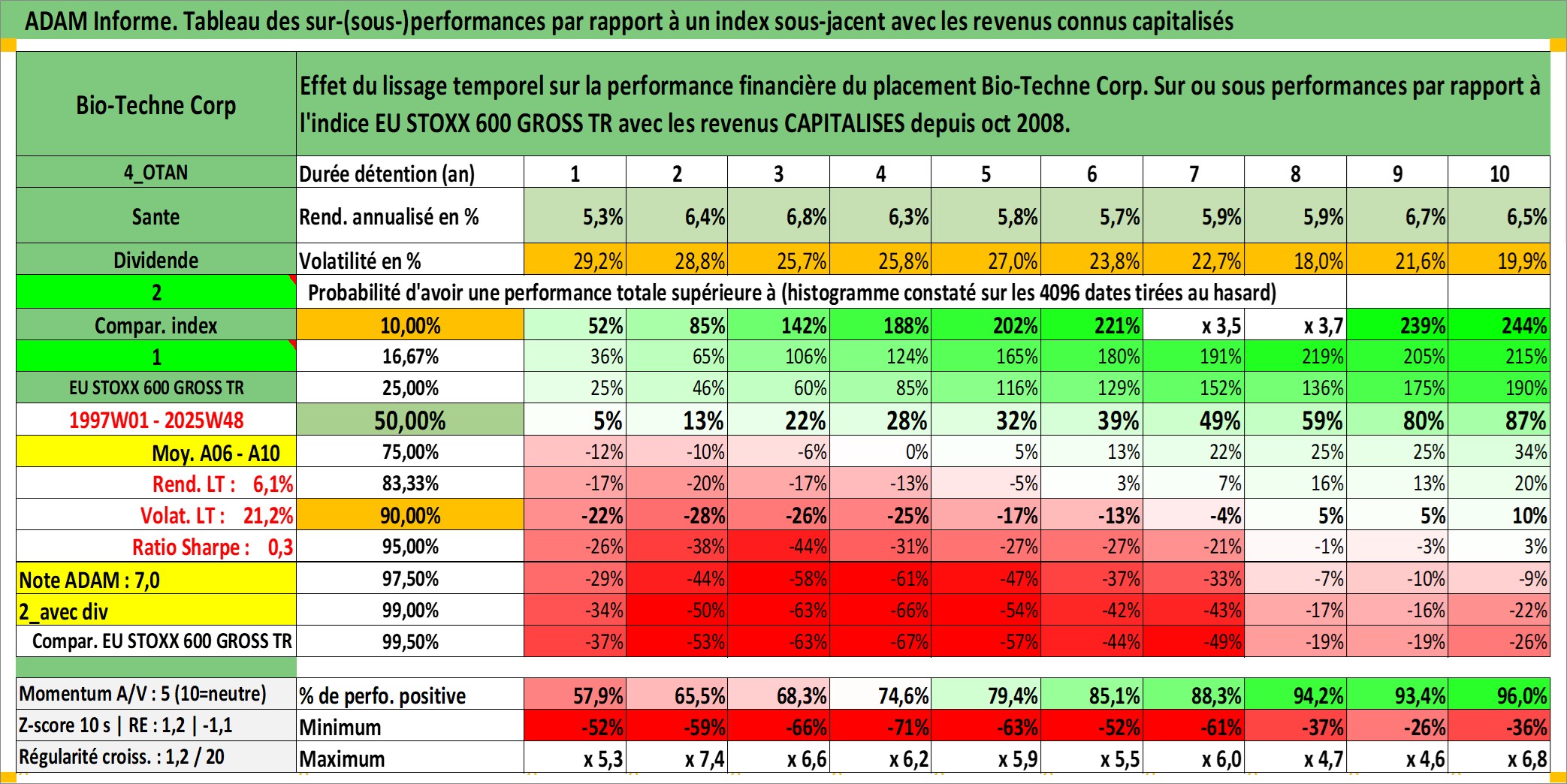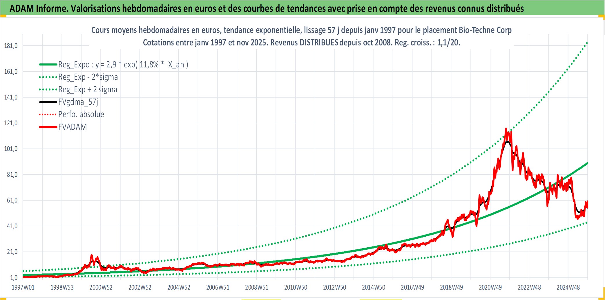 Site dédié aux investisseursPage dédiée sur site financeAnalyse des valorisations hebdomadaires de l'action Bio-Techne Corp. Cet actif est cote en USD. Les valorisations sont en contrevaleur EURO et couvrent les semaines 1997W01 a 2025W48. Les revenus de cet actif financier sont pris en compte depuis la semaine 2008W44. La note ESG de cet actif n'est pas connue.
