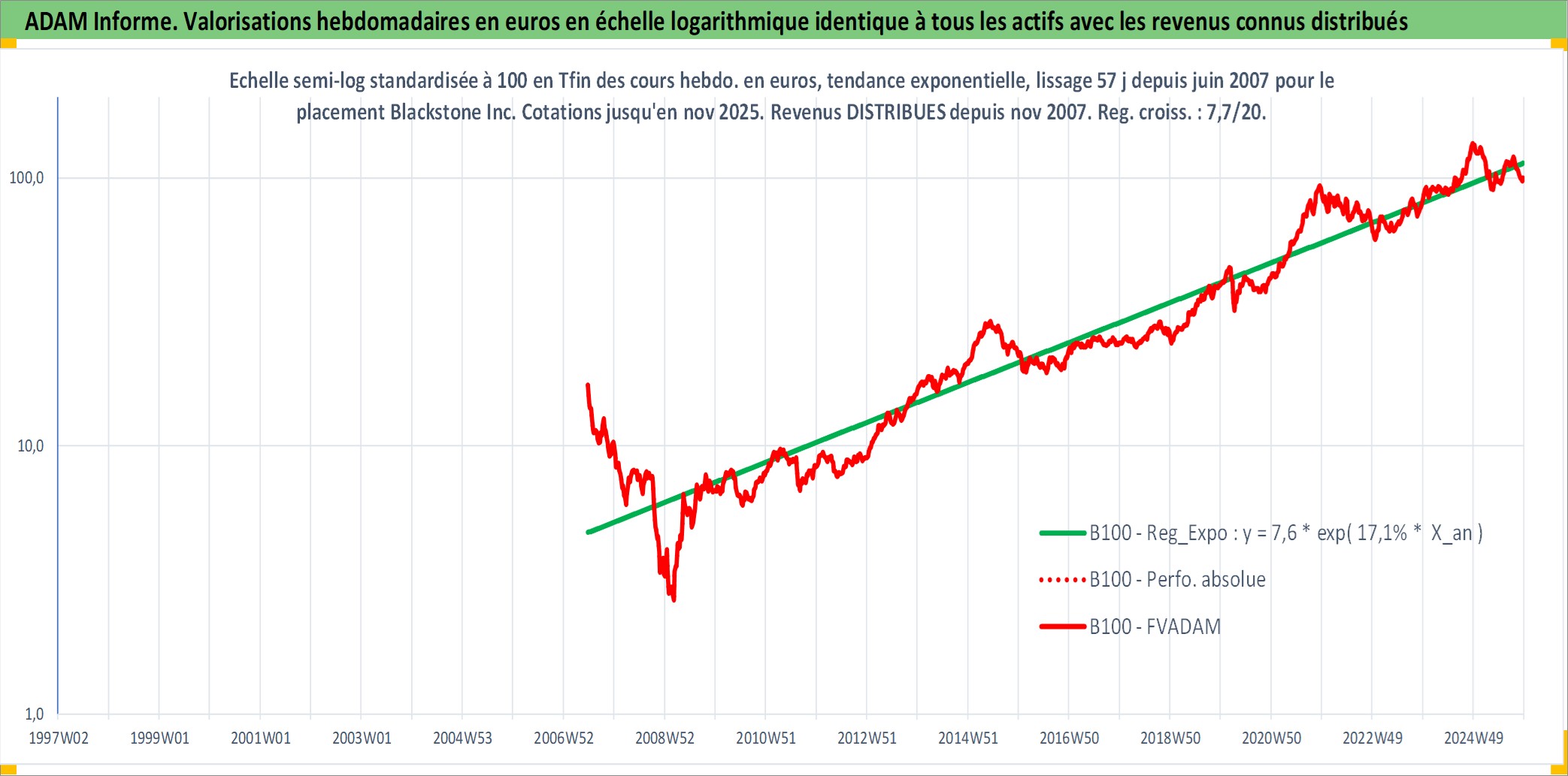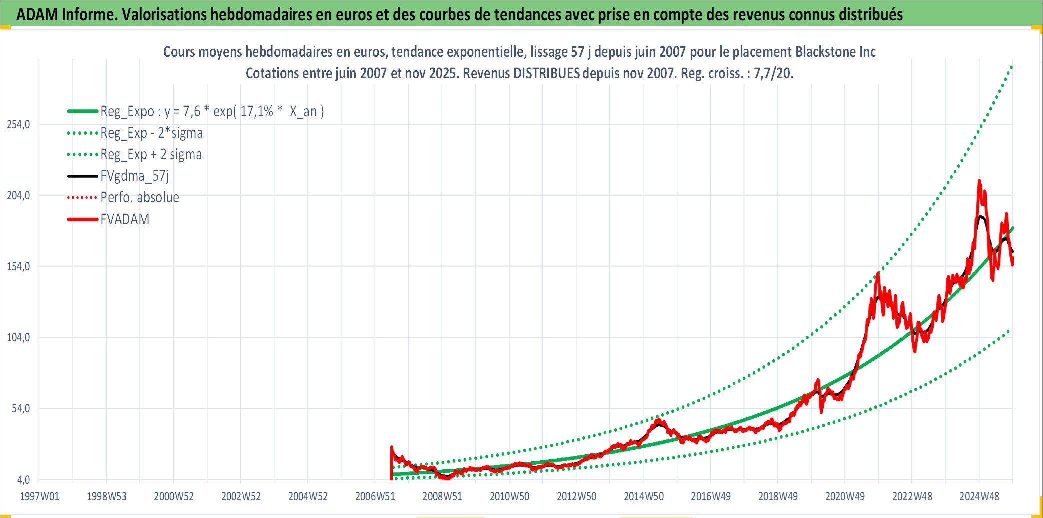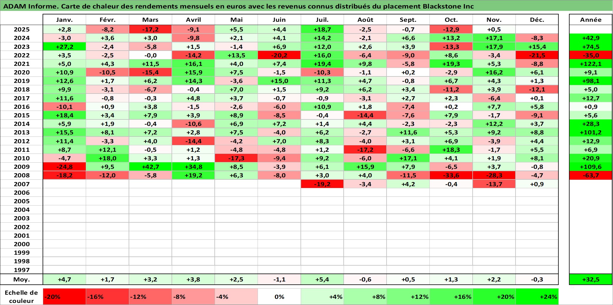 Site dédié aux investisseursPage dédiée sur site financeAnalyse des valorisations hebdomadaires de l'action Blackstone Inc. Cet actif est cote en USD. Les valorisations sont en contrevaleur EURO et couvrent les semaines 2007W25 a 2025W48. Les revenus de cet actif financier sont pris en compte depuis la semaine 2007W48. La note globale ESG de cet actif est estimee a 8.0 (apres rebasage entre 0 et 20).