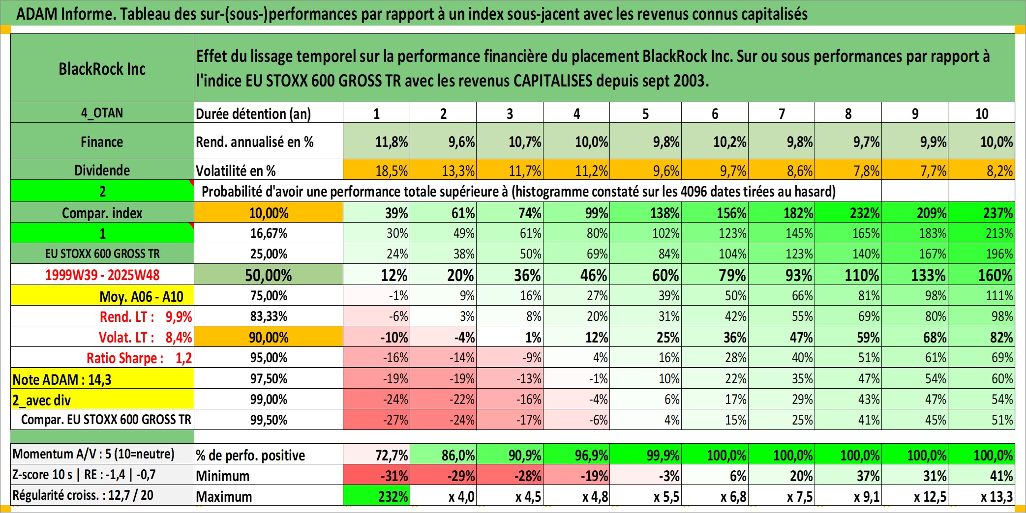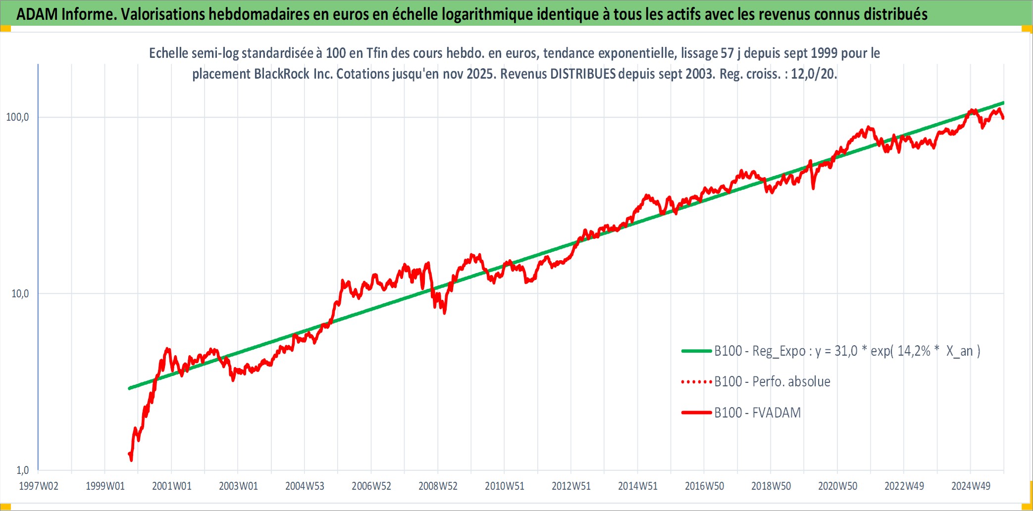 Site dédié aux investisseursPage dédiée sur site financeAnalyse des valorisations hebdomadaires de l'action BlackRock Inc. Cet actif est cote en USD. Les valorisations sont en contrevaleur EURO et couvrent les semaines 1999W39 a 2025W48. Les revenus de cet actif financier sont pris en compte depuis la semaine 2003W36. La note globale ESG de cet actif est estimee a 10.0 (apres rebasage entre 0 et 20).