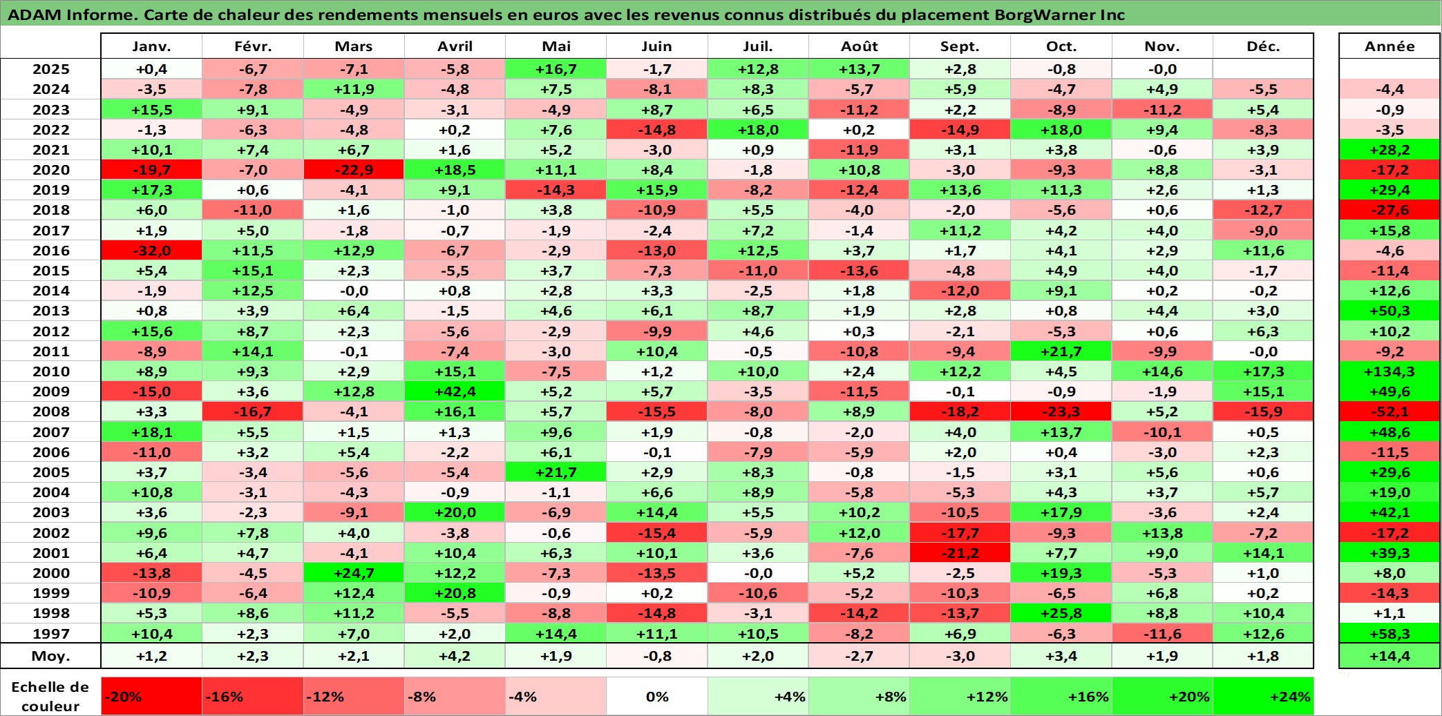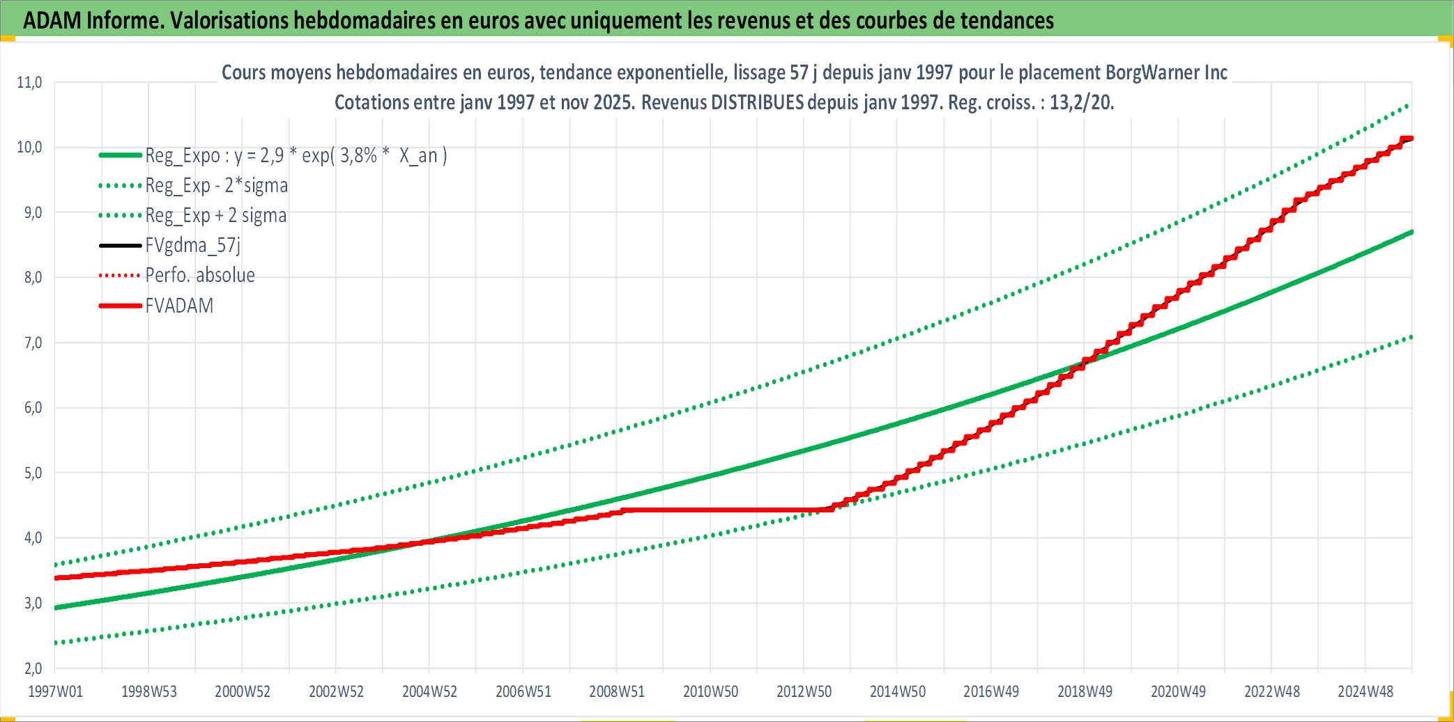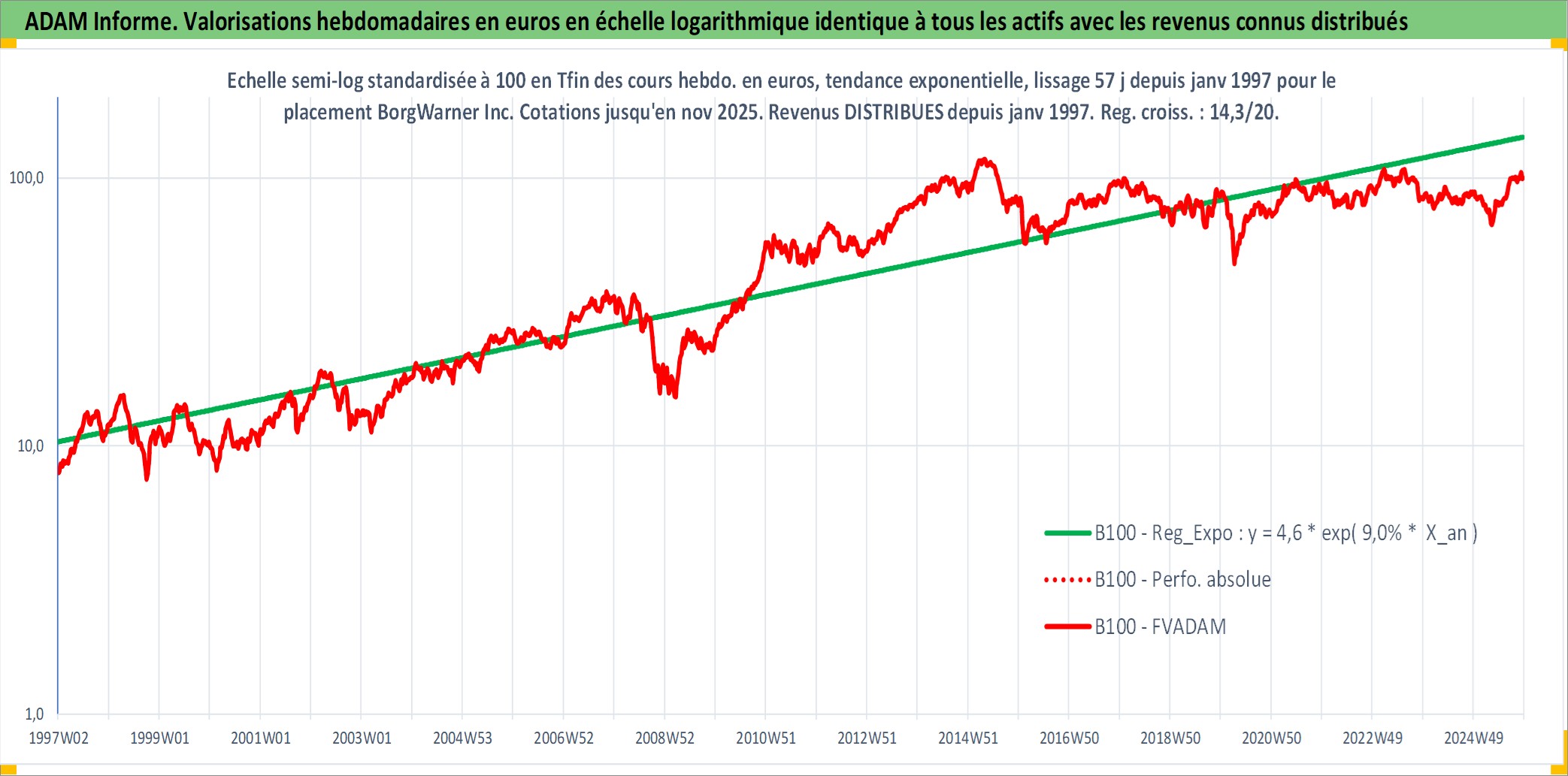 Site dédié aux investisseursPage dédiée sur site financeAnalyse des valorisations hebdomadaires de l'action BorgWarner Inc. Cet actif est cote en USD. Les valorisations sont en contrevaleur EURO et couvrent les semaines 1997W01 a 2025W48. Les revenus de cet actif financier sont pris en compte depuis la semaine 1997W05. La note globale ESG de cet actif est estimee a 15.0 (apres rebasage entre 0 et 20).