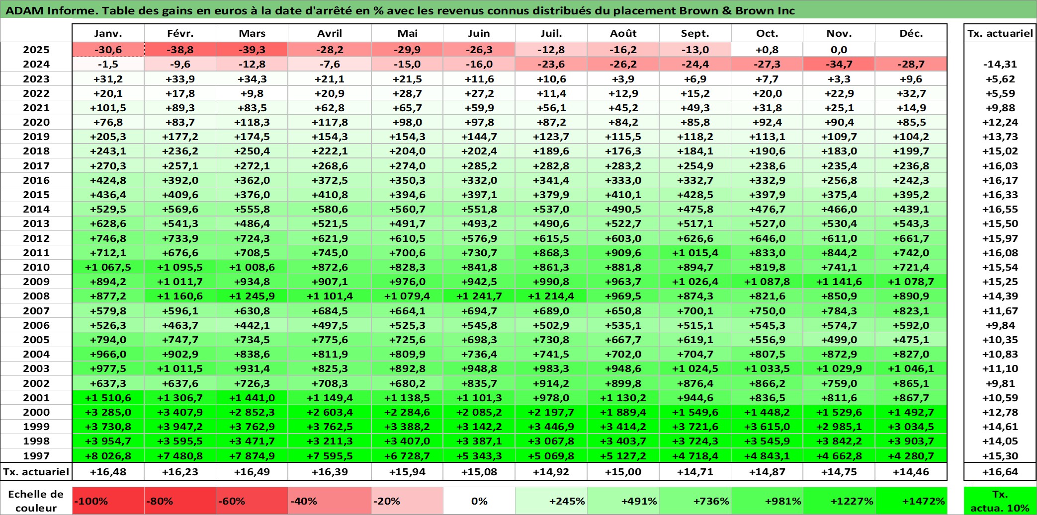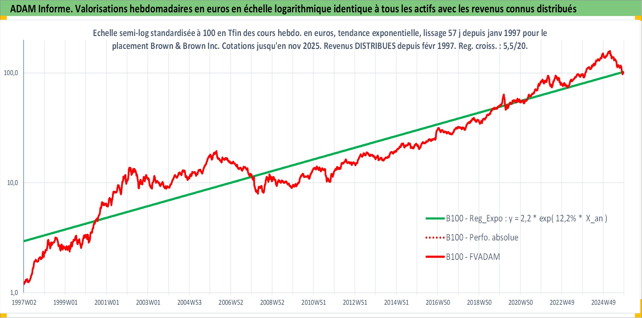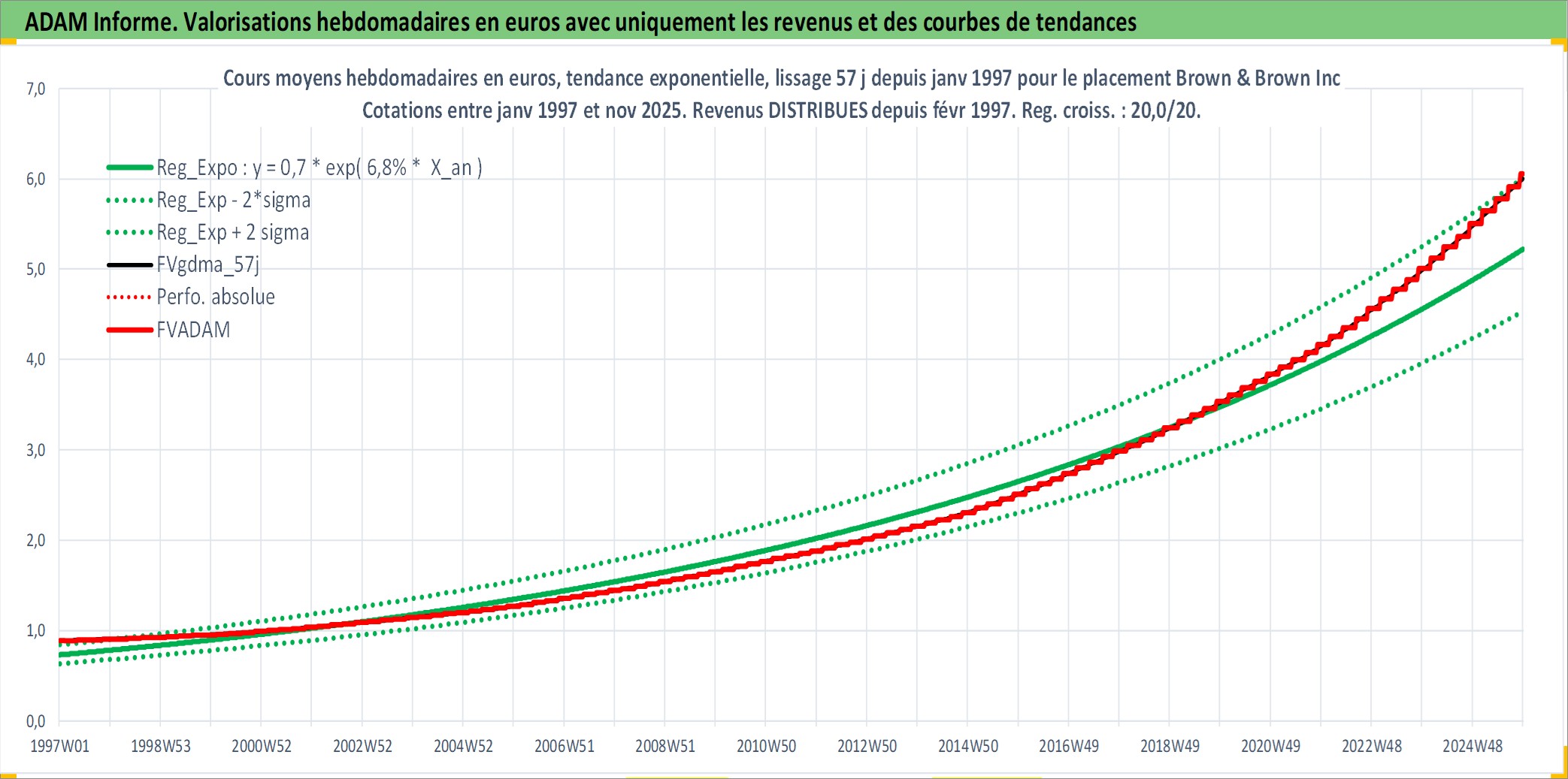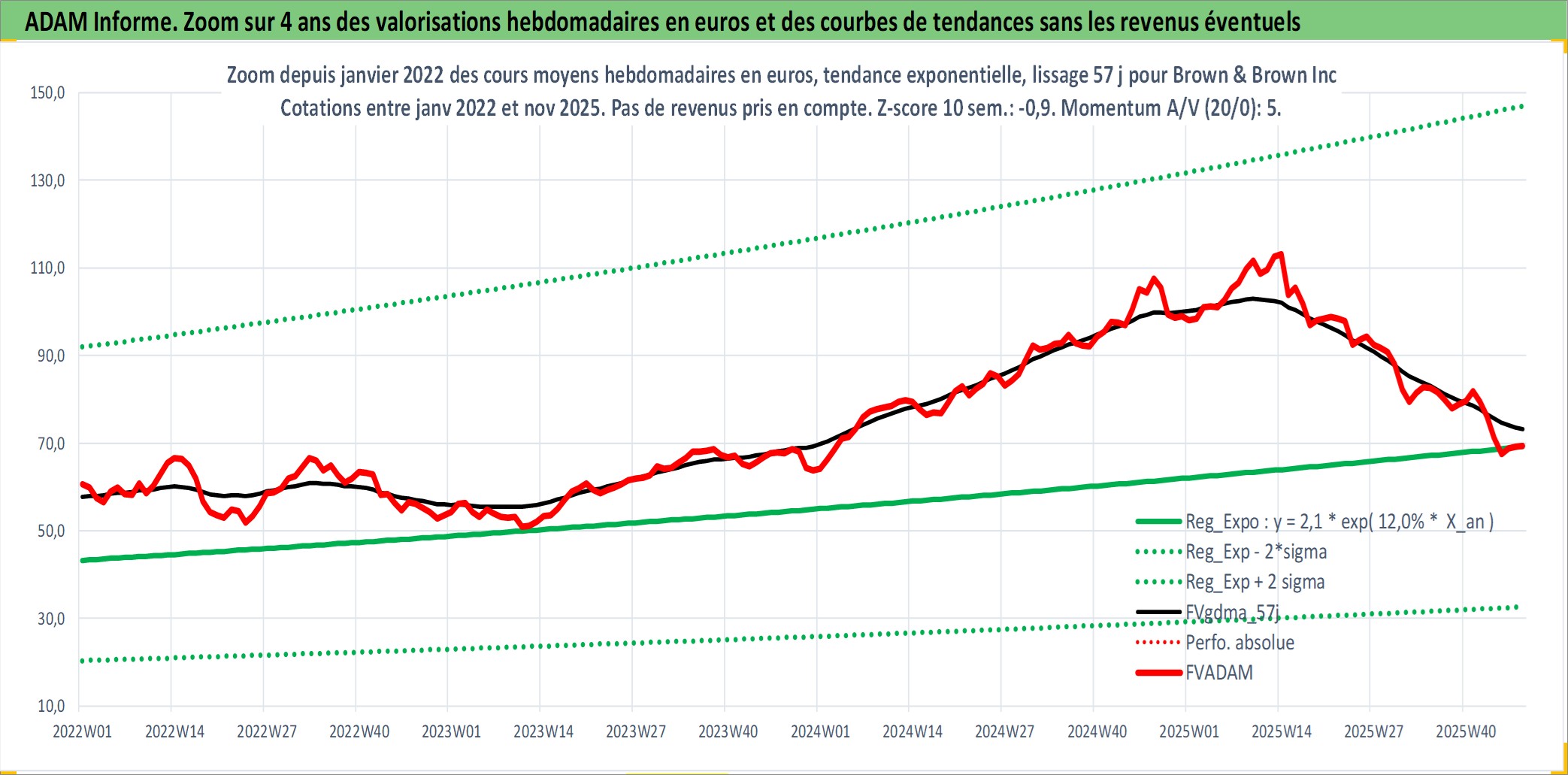Site dédié aux investisseursPage dédiée sur site financeAnalyse des valorisations hebdomadaires de l'action Brown & Brown Inc. Cet actif est cote en USD. Les valorisations sont en contrevaleur EURO et couvrent les semaines 1997W01 a 2025W48. Les revenus de cet actif financier sont pris en compte depuis la semaine 1997W07. La note globale ESG de cet actif est estimee a 10.0 (apres rebasage entre 0 et 20).