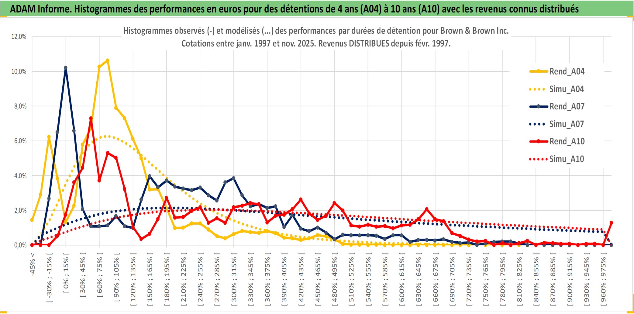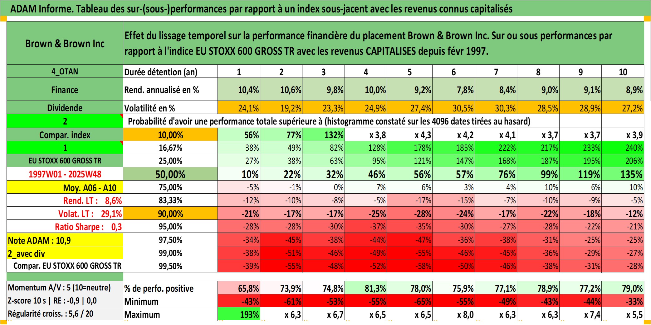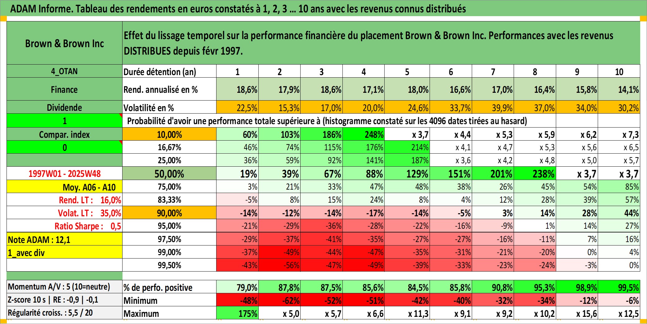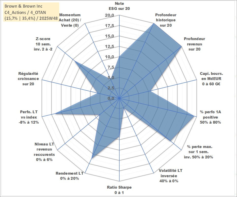 Site dédié aux investisseursPage dédiée sur site financeAnalyse des valorisations hebdomadaires de l'action Brown & Brown Inc. Cet actif est cote en USD. Les valorisations sont en contrevaleur EURO et couvrent les semaines 1997W01 a 2025W48. Les revenus de cet actif financier sont pris en compte depuis la semaine 1997W07. La note globale ESG de cet actif est estimee a 10.0 (apres rebasage entre 0 et 20).