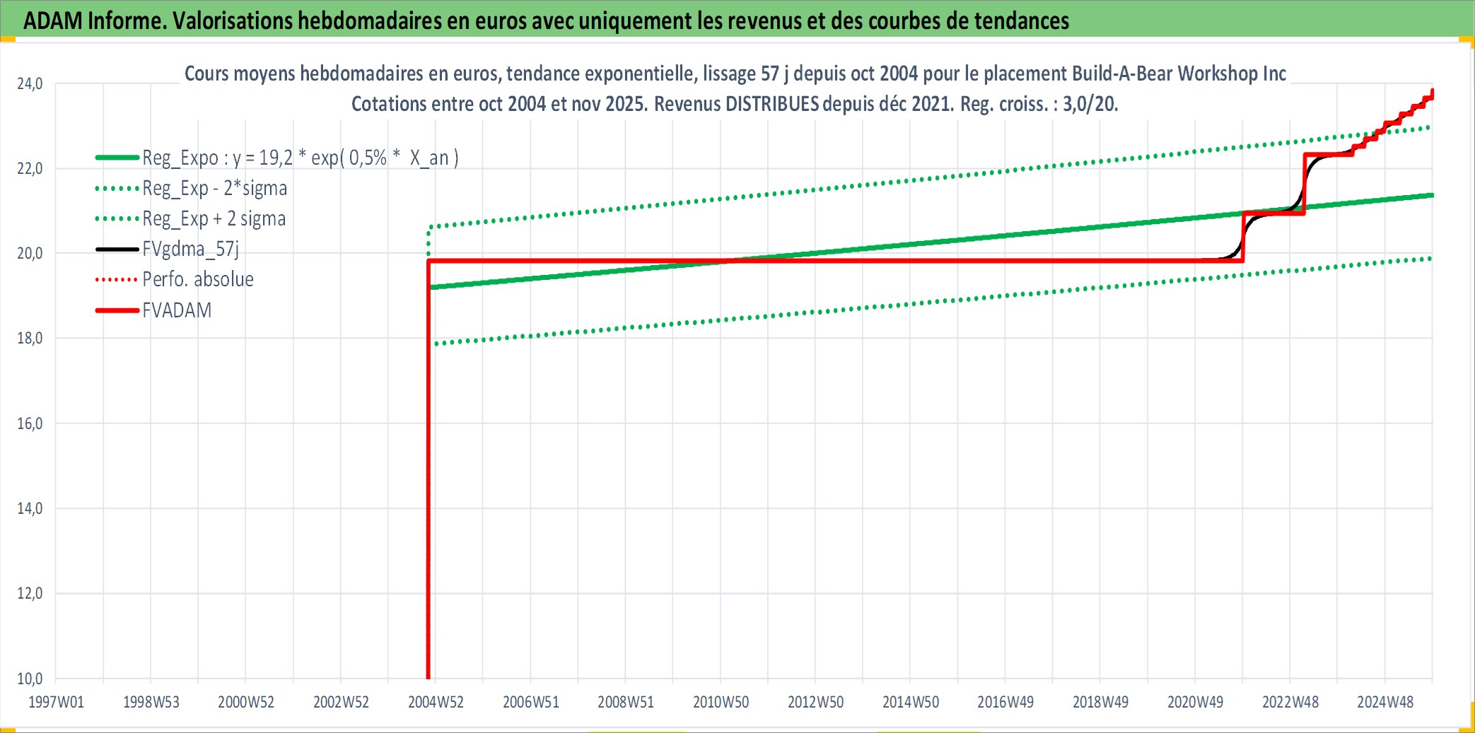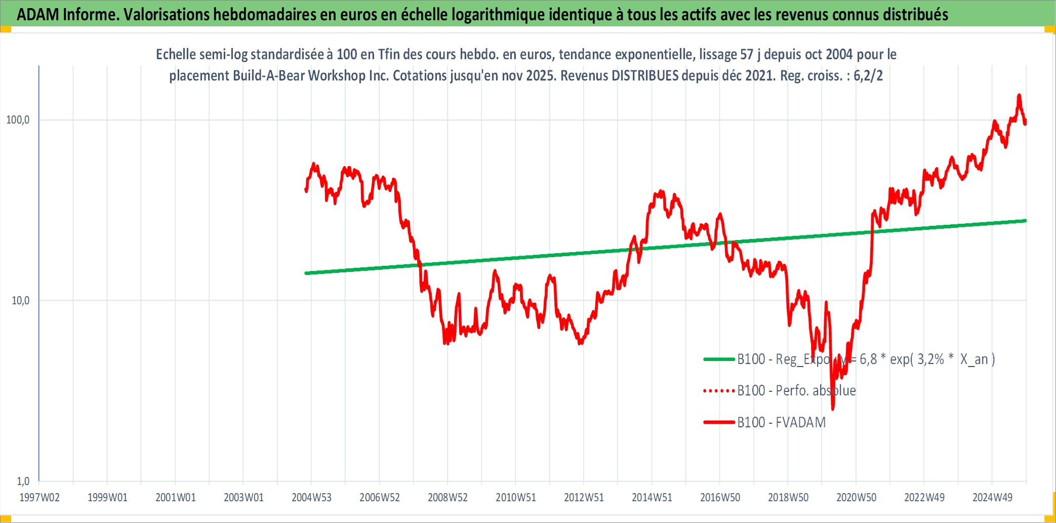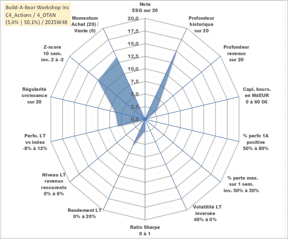 Site dédié aux investisseursPage dédiée sur site financeAnalyse des valorisations hebdomadaires de l'action Build-A-Bear Workshop Inc. Cet actif est cote en USD. Les valorisations sont en contrevaleur EURO et couvrent les semaines 2004W44 a 2025W48. Les revenus de cet actif financier sont pris en compte depuis la semaine 2021W49. La note ESG de cet actif n'est pas connue.