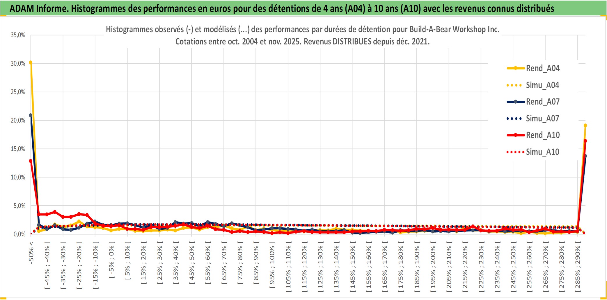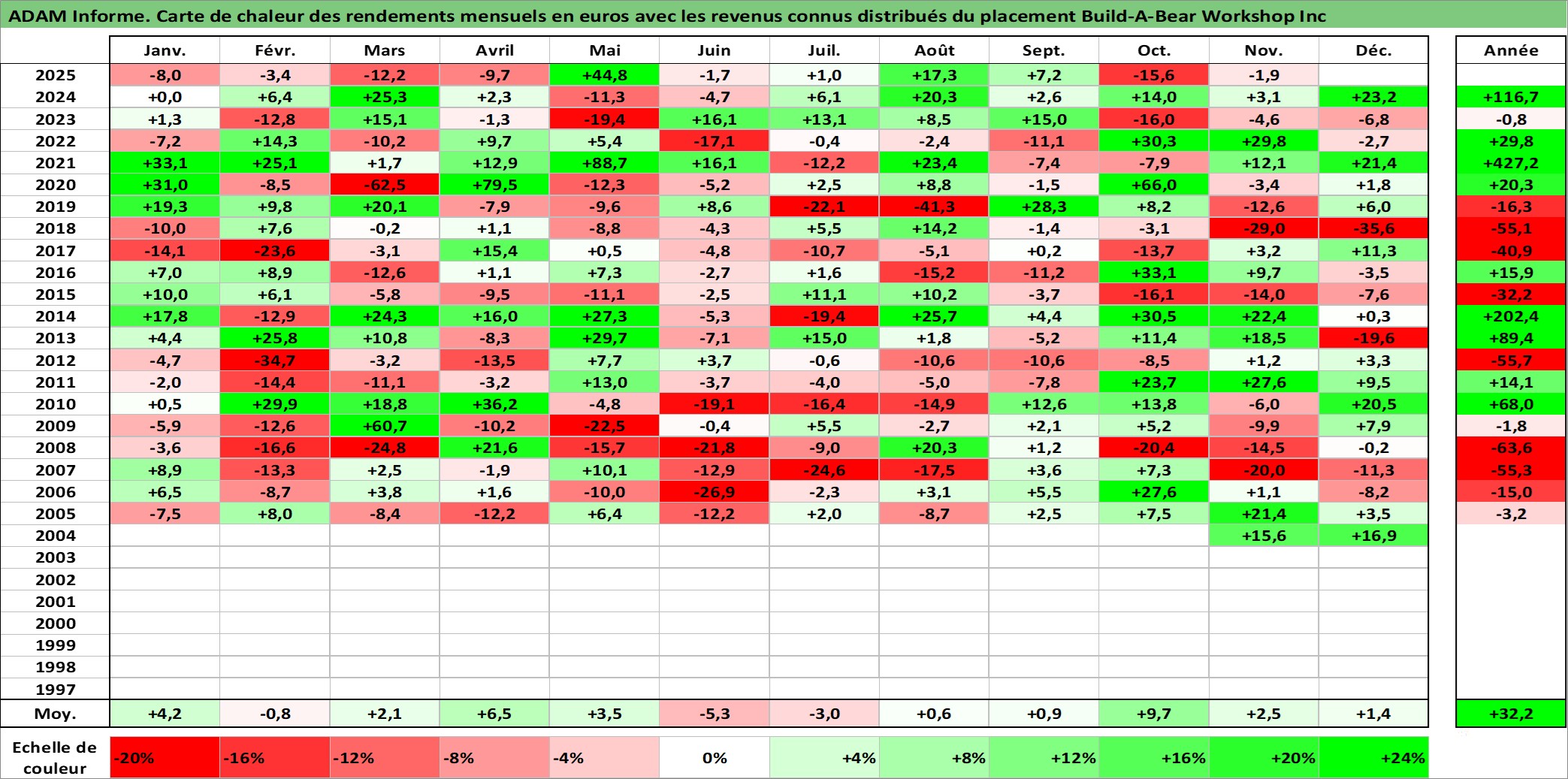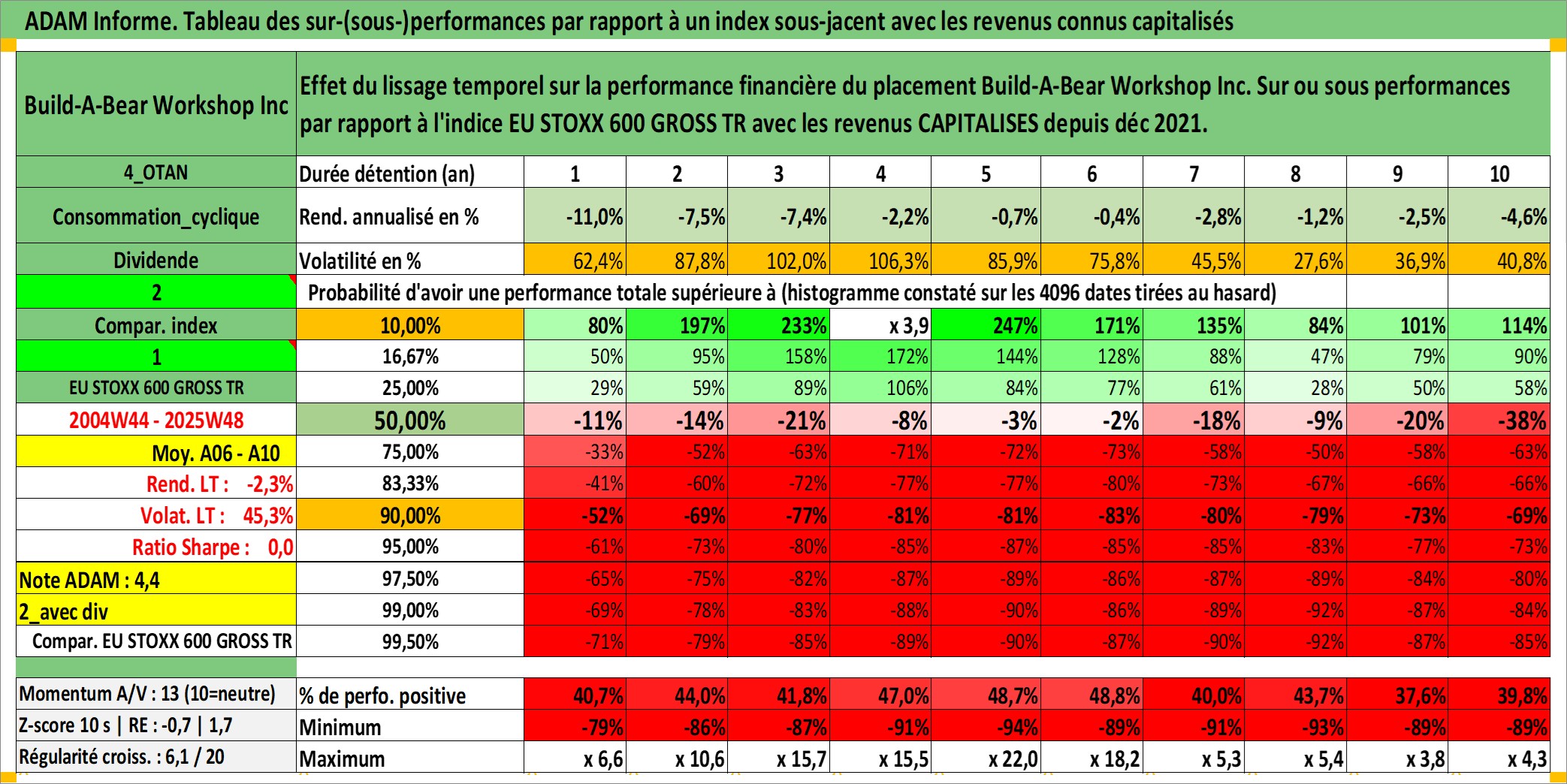 Site dédié aux investisseursPage dédiée sur site financeAnalyse des valorisations hebdomadaires de l'action Build-A-Bear Workshop Inc. Cet actif est cote en USD. Les valorisations sont en contrevaleur EURO et couvrent les semaines 2004W44 a 2025W48. Les revenus de cet actif financier sont pris en compte depuis la semaine 2021W49. La note ESG de cet actif n'est pas connue.