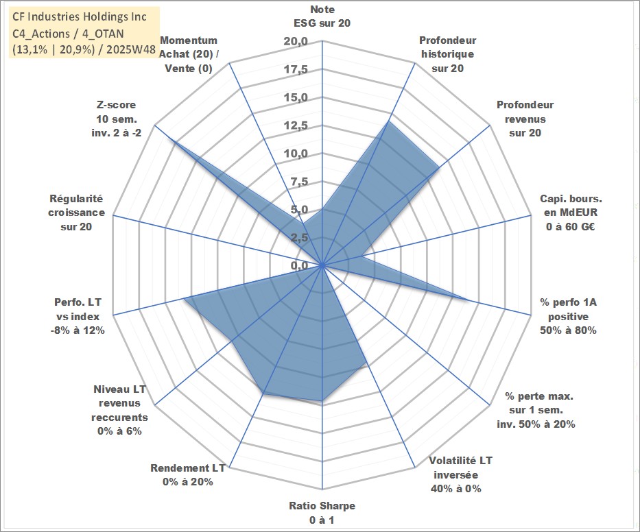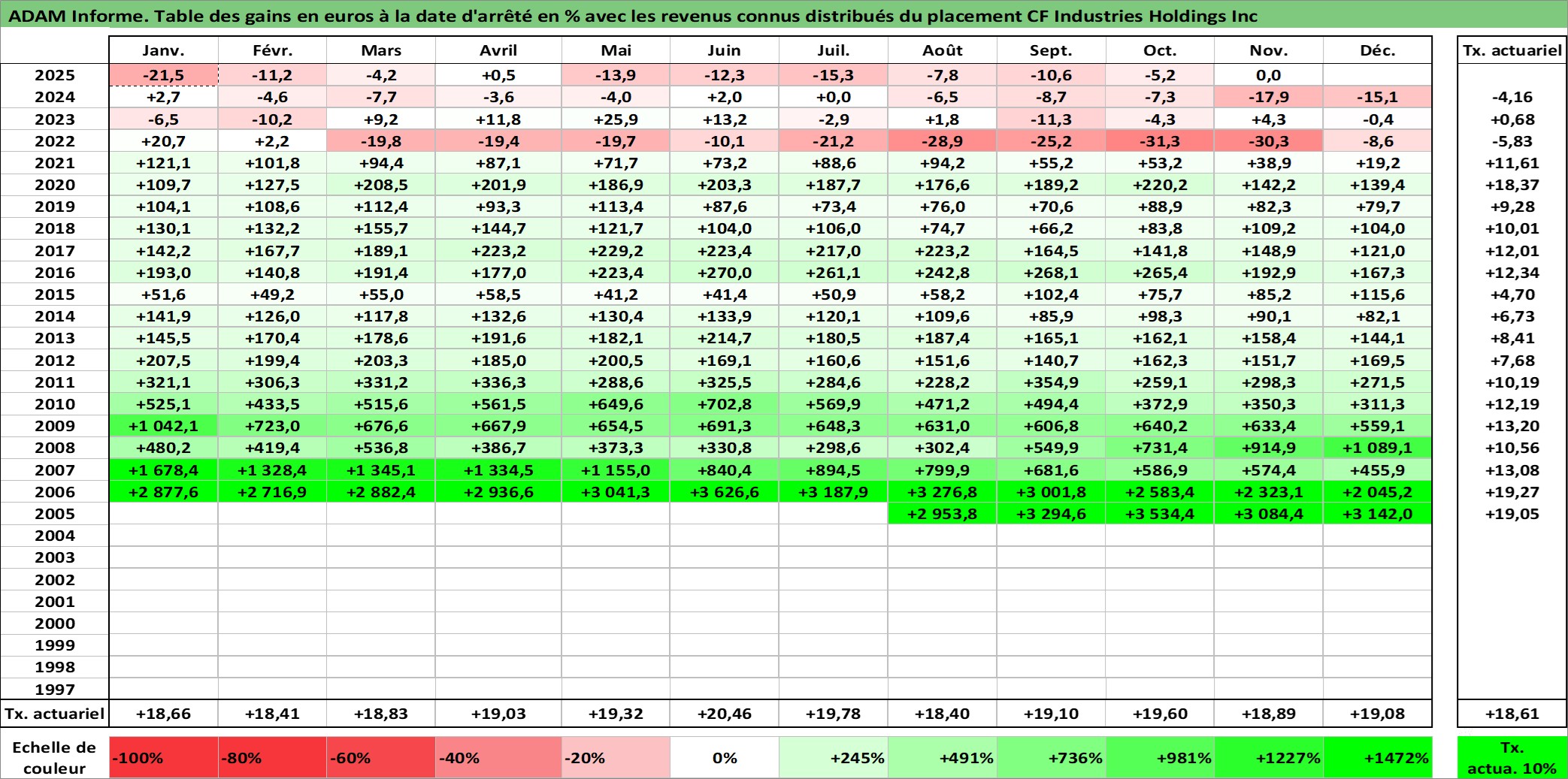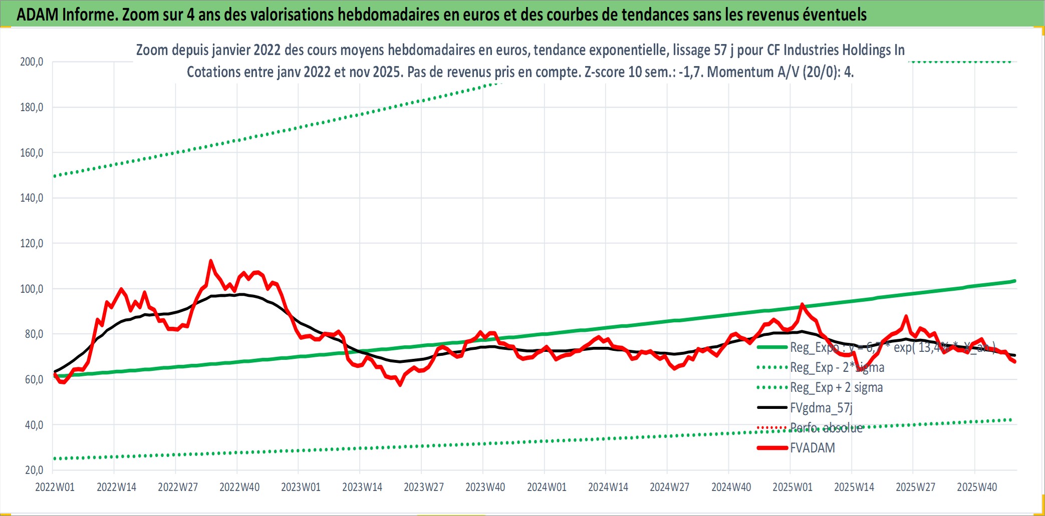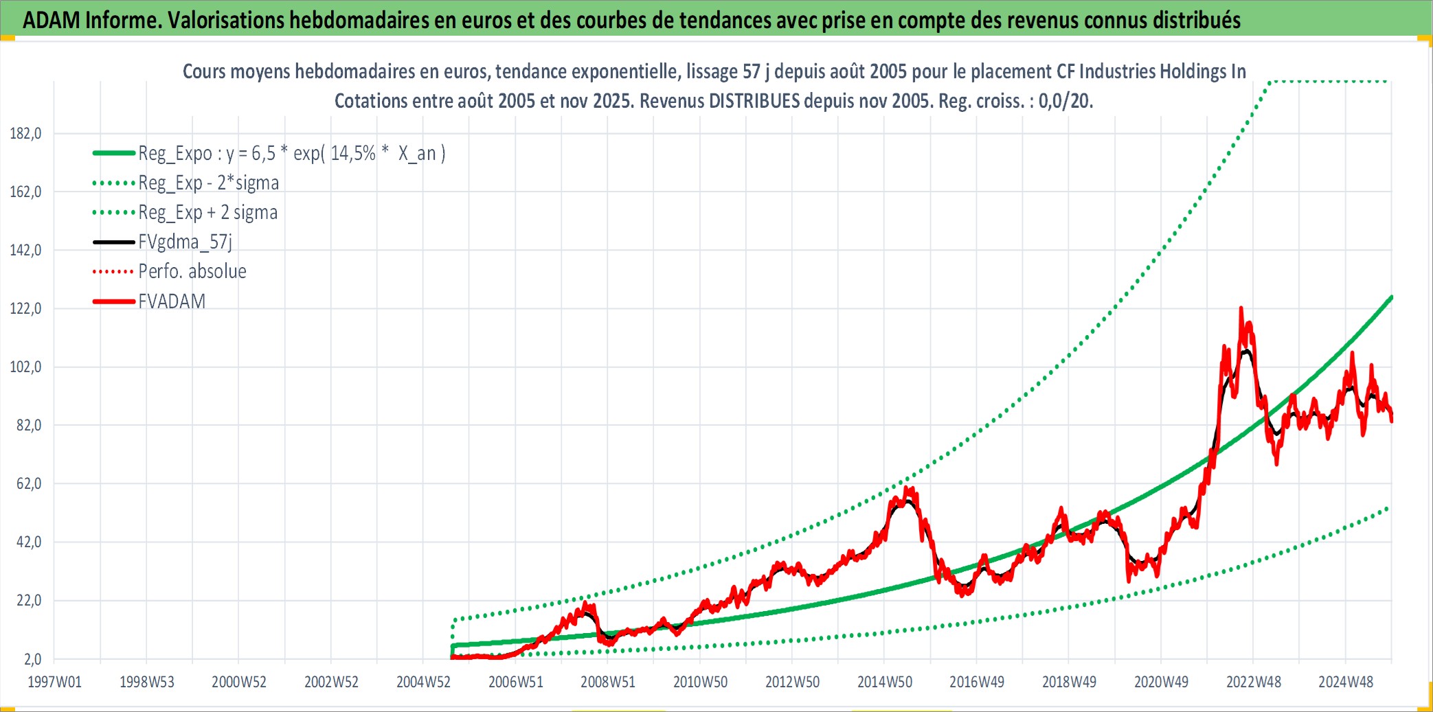 Site dédié aux investisseursPage dédiée sur site financeAnalyse des valorisations hebdomadaires de l'action CF Industries Holdings Inc. Cet actif est cote en USD. Les valorisations sont en contrevaleur EURO et couvrent les semaines 2005W32 a 2025W48. Les revenus de cet actif financier sont pris en compte depuis la semaine 2005W45. La note globale ESG de cet actif est estimee a 5.0 (apres rebasage entre 0 et 20).