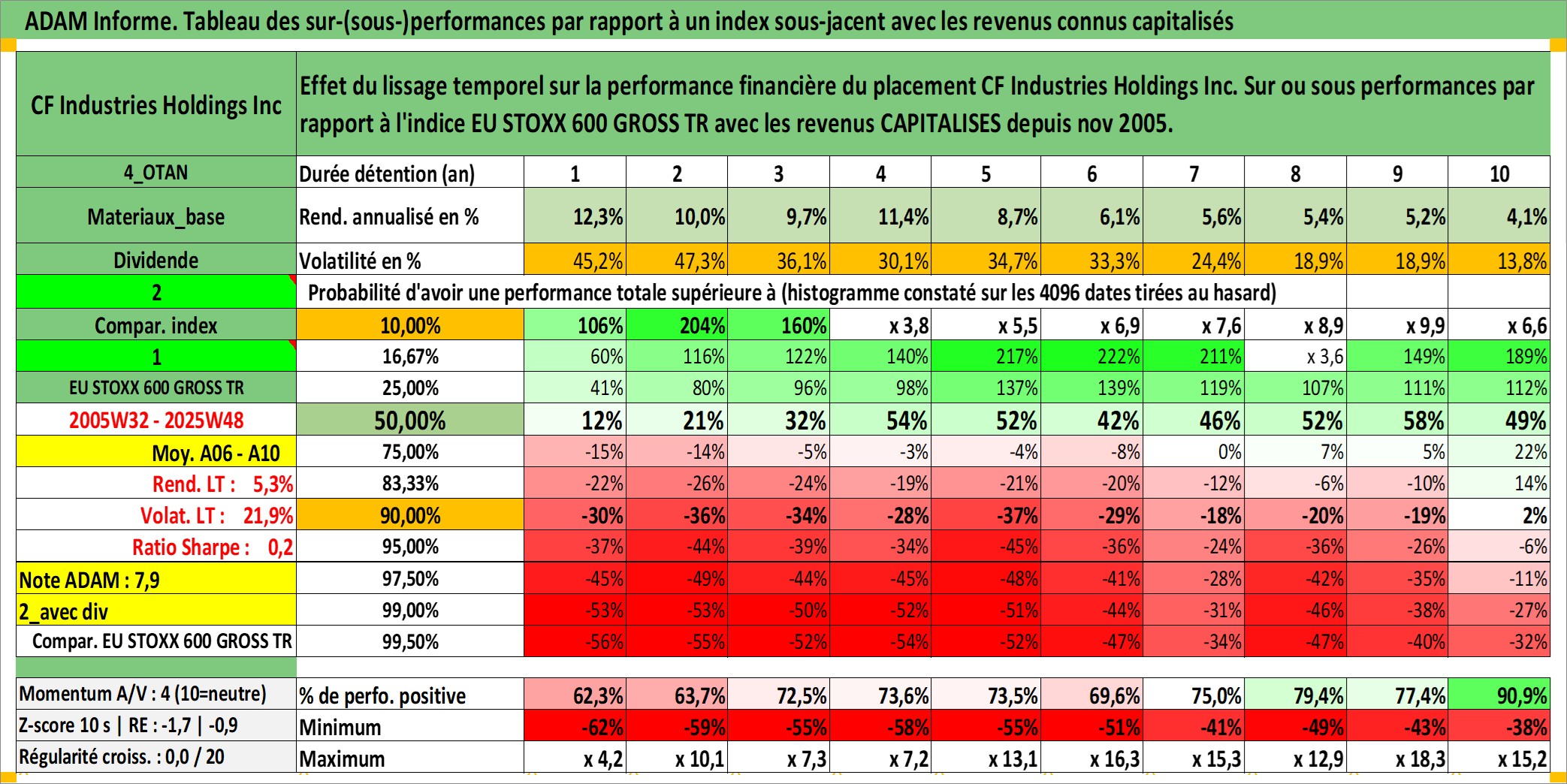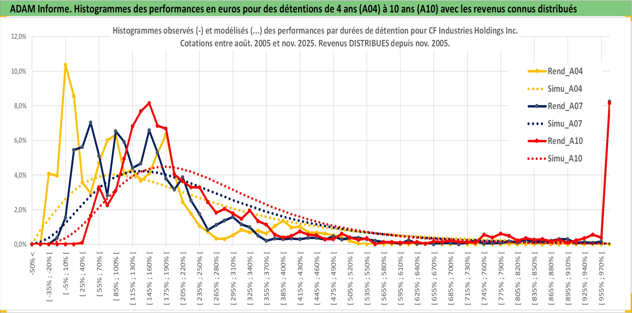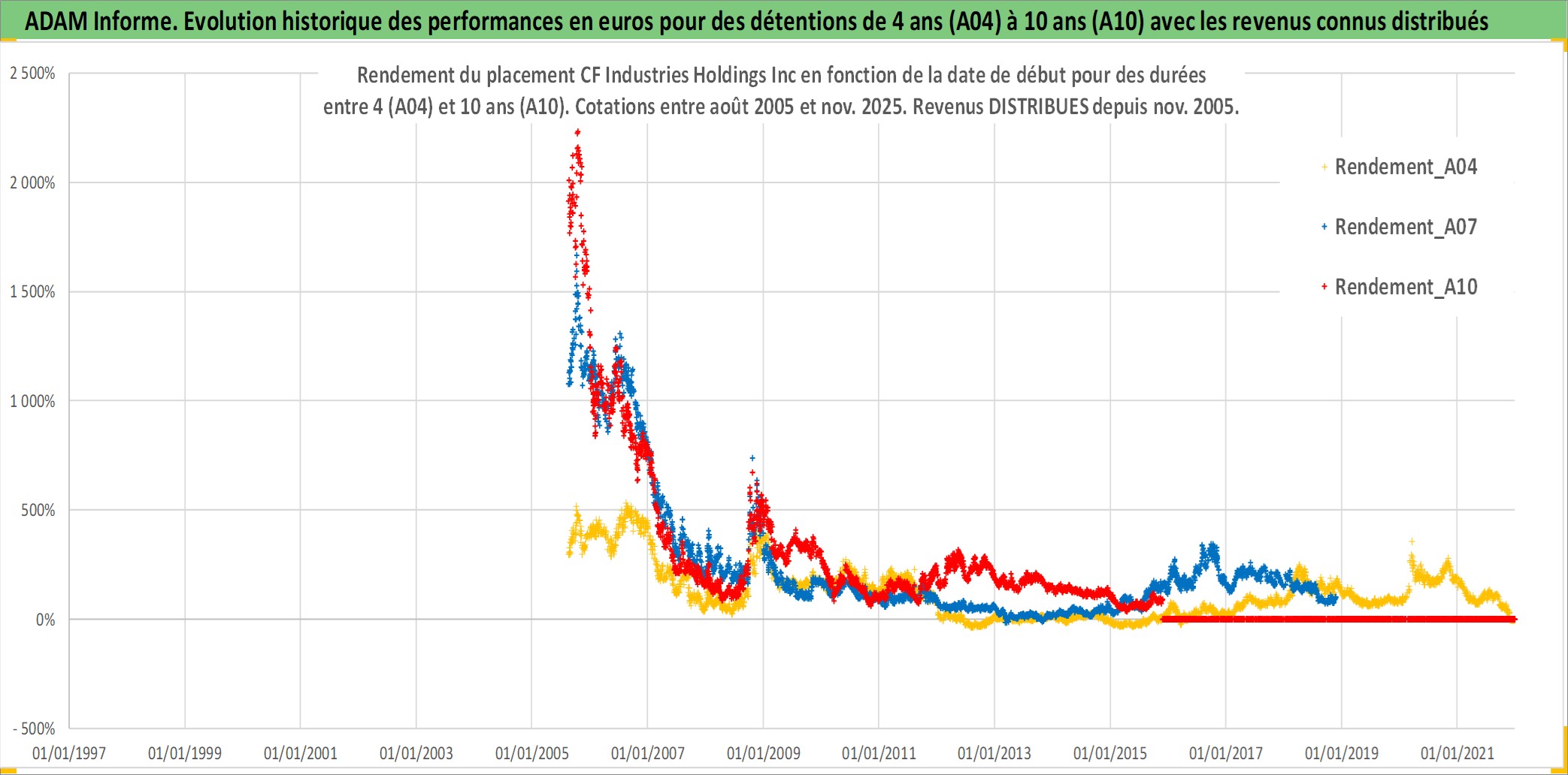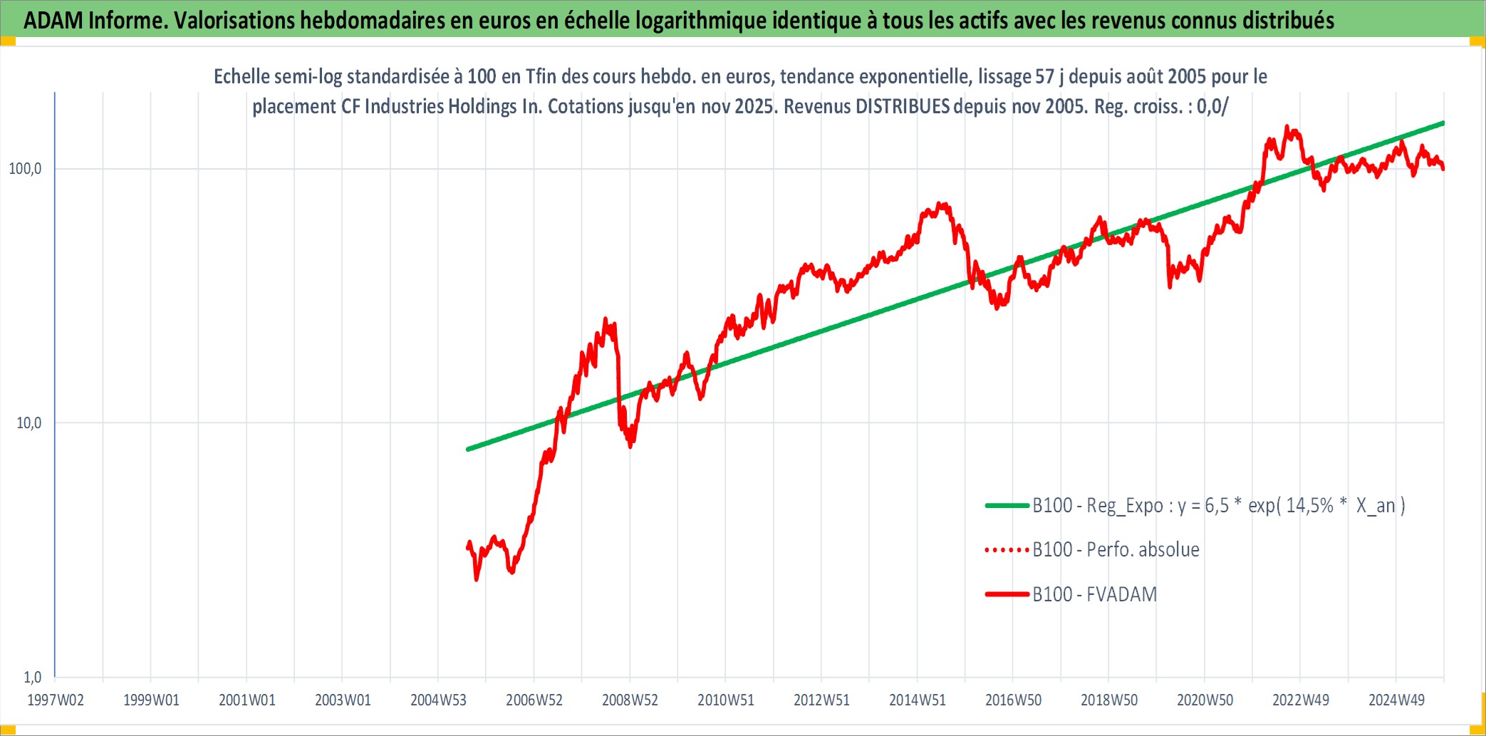 Site dédié aux investisseursPage dédiée sur site financeAnalyse des valorisations hebdomadaires de l'action CF Industries Holdings Inc. Cet actif est cote en USD. Les valorisations sont en contrevaleur EURO et couvrent les semaines 2005W32 a 2025W48. Les revenus de cet actif financier sont pris en compte depuis la semaine 2005W45. La note globale ESG de cet actif est estimee a 5.0 (apres rebasage entre 0 et 20).
