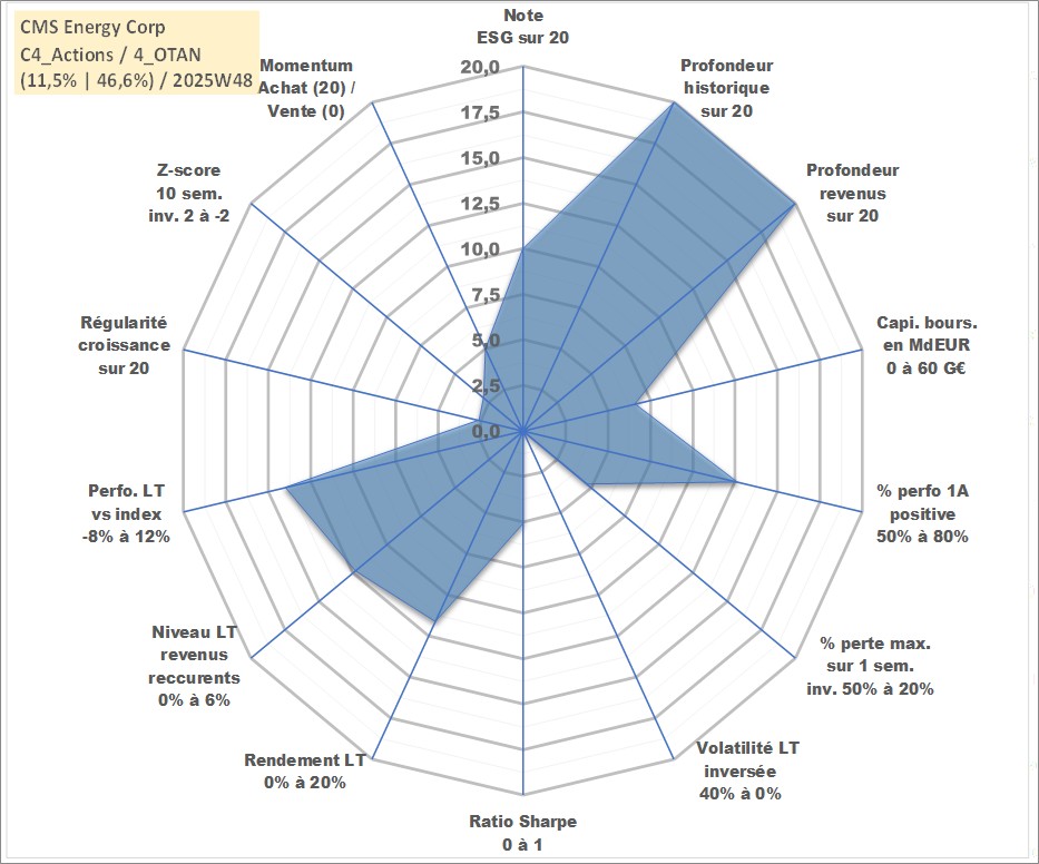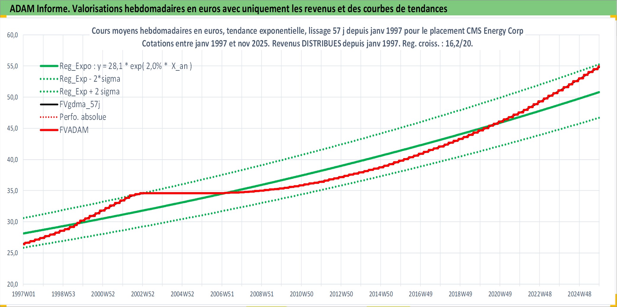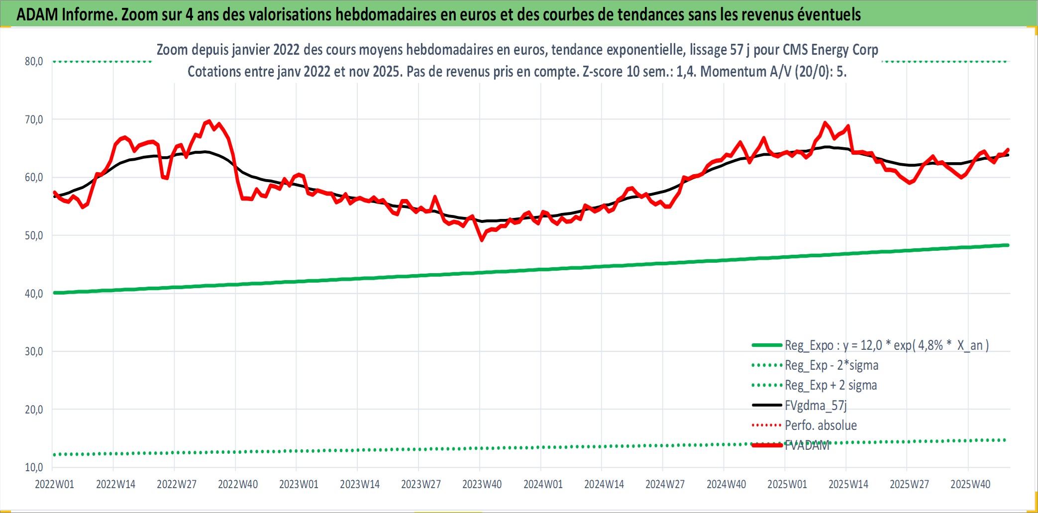 Site dédié aux investisseursPage dédiée sur site financeAnalyse des valorisations hebdomadaires de l'action CMS Energy Corp. Cet actif est cote en USD. Les valorisations sont en contrevaleur EURO et couvrent les semaines 1997W01 a 2025W48. Les revenus de cet actif financier sont pris en compte depuis la semaine 1997W05. La note globale ESG de cet actif est estimee a 10.0 (apres rebasage entre 0 et 20).