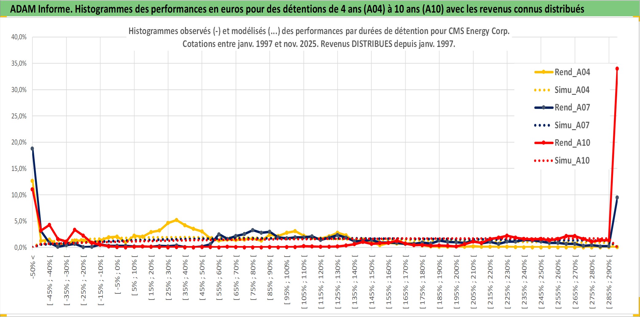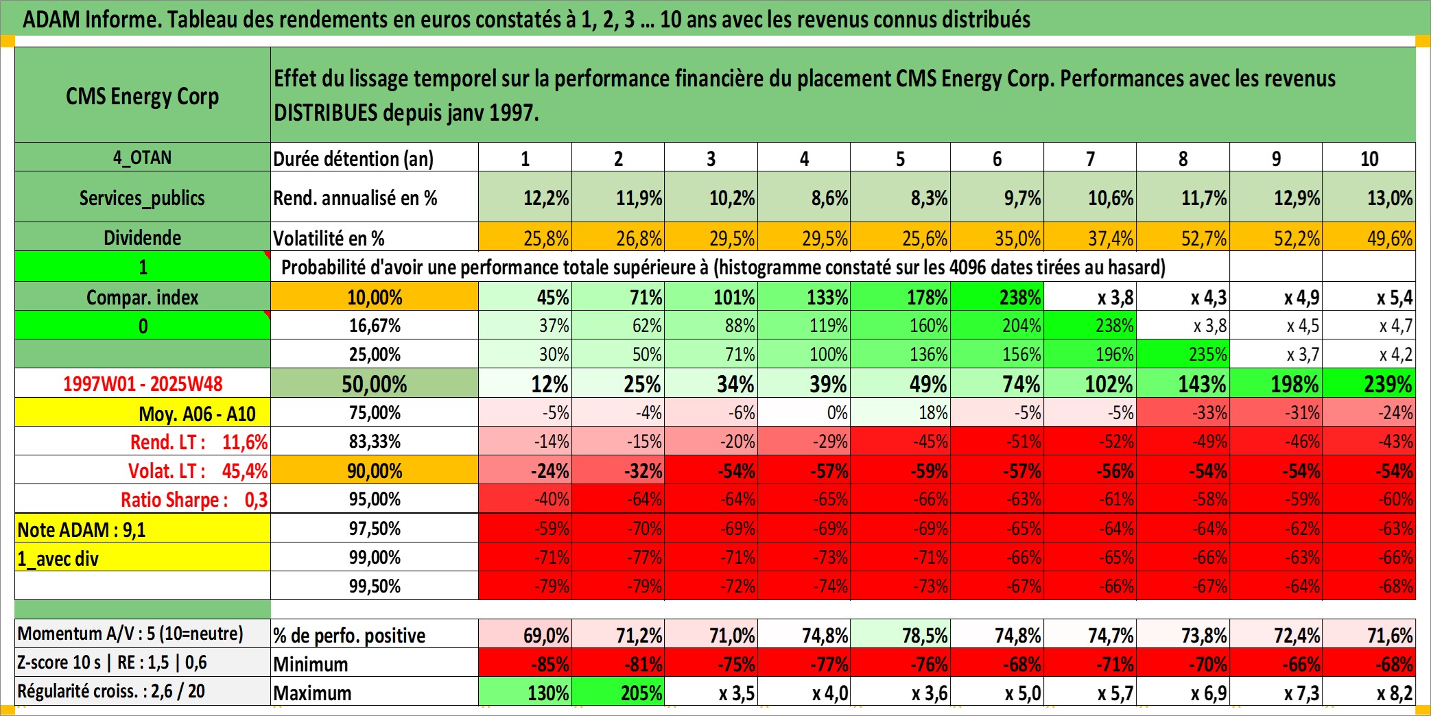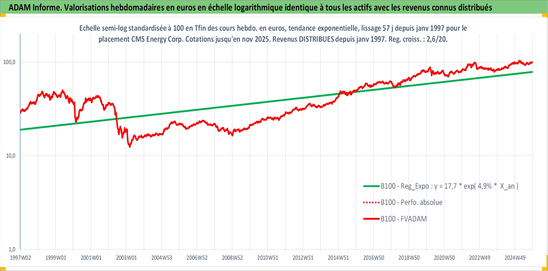 Site dédié aux investisseursPage dédiée sur site financeAnalyse des valorisations hebdomadaires de l'action CMS Energy Corp. Cet actif est cote en USD. Les valorisations sont en contrevaleur EURO et couvrent les semaines 1997W01 a 2025W48. Les revenus de cet actif financier sont pris en compte depuis la semaine 1997W05. La note globale ESG de cet actif est estimee a 10.0 (apres rebasage entre 0 et 20).