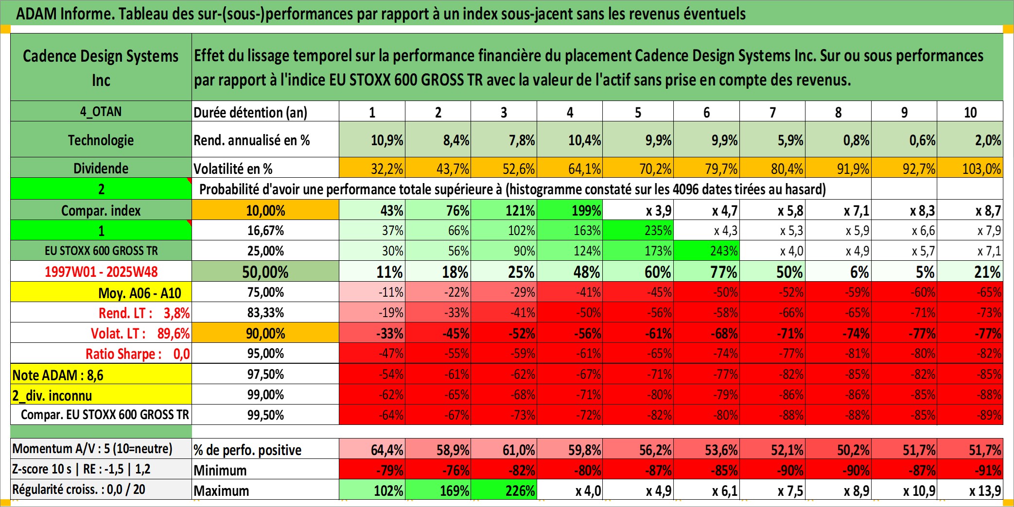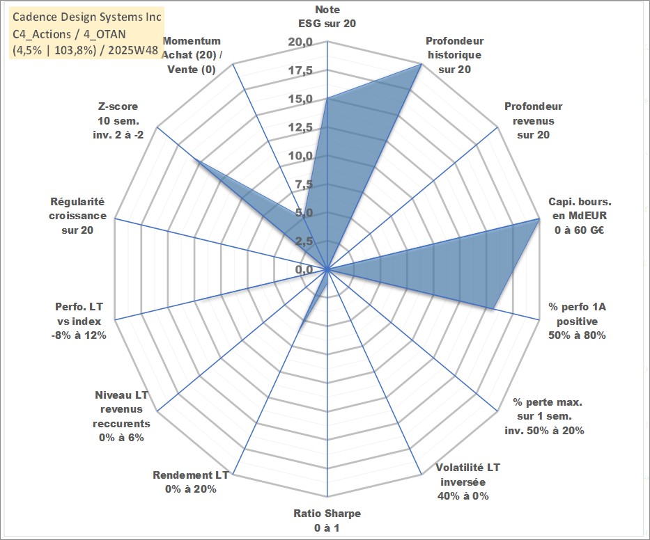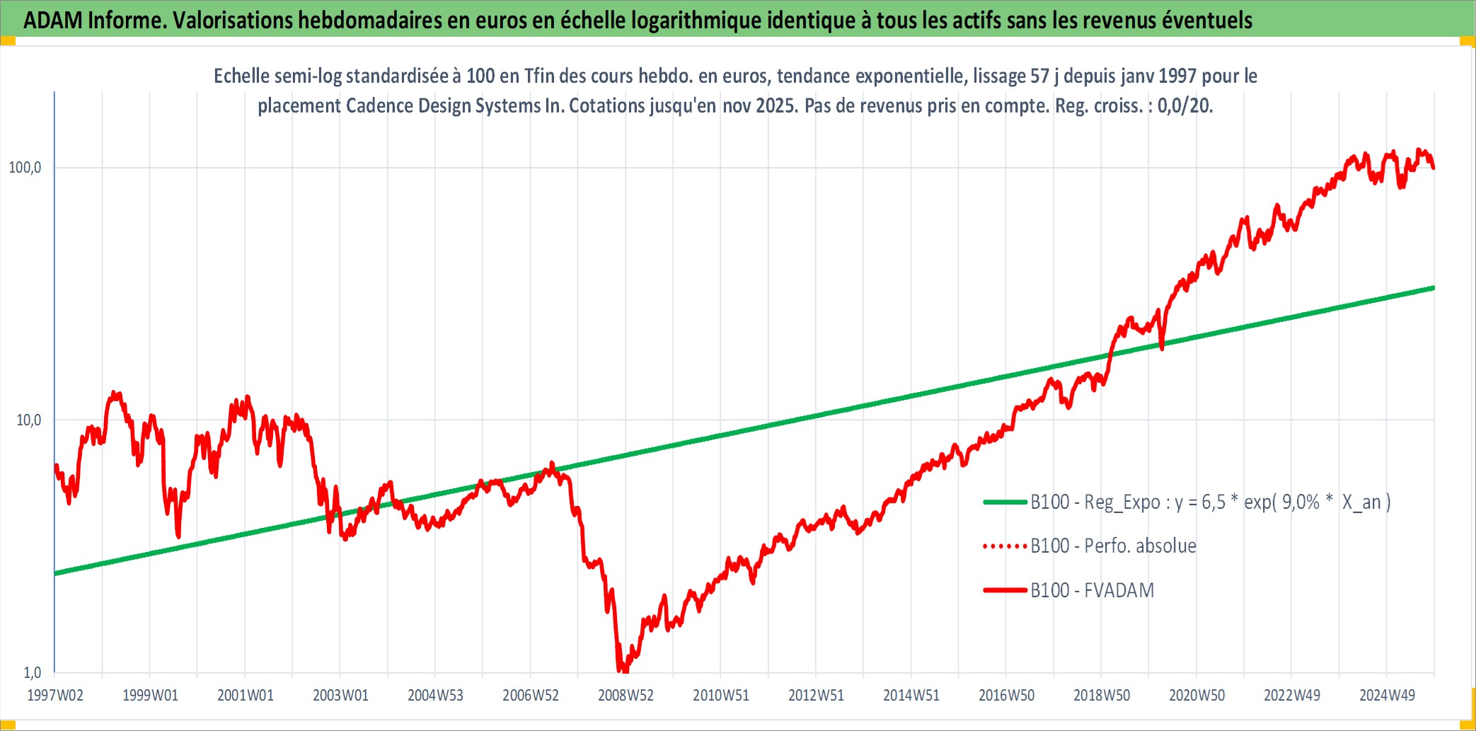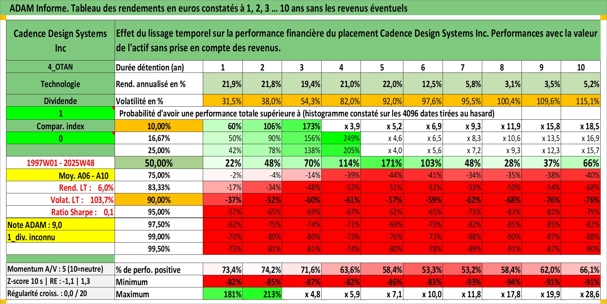 Site dédié aux investisseursPage dédiée sur site financeAnalyse des valorisations hebdomadaires de l'action Cadence Design Systems Inc. Cet actif est cote en USD. Les valorisations sont en contrevaleur EURO et couvrent les semaines 1997W01 a 2025W48. Les revenus de cet actif financier ne sont pas connus car non existants ou non disponibles sur le site Yahoo Finance. La note globale ESG de cet actif est estimee a 15.0 (apres rebasage entre 0 et 20).