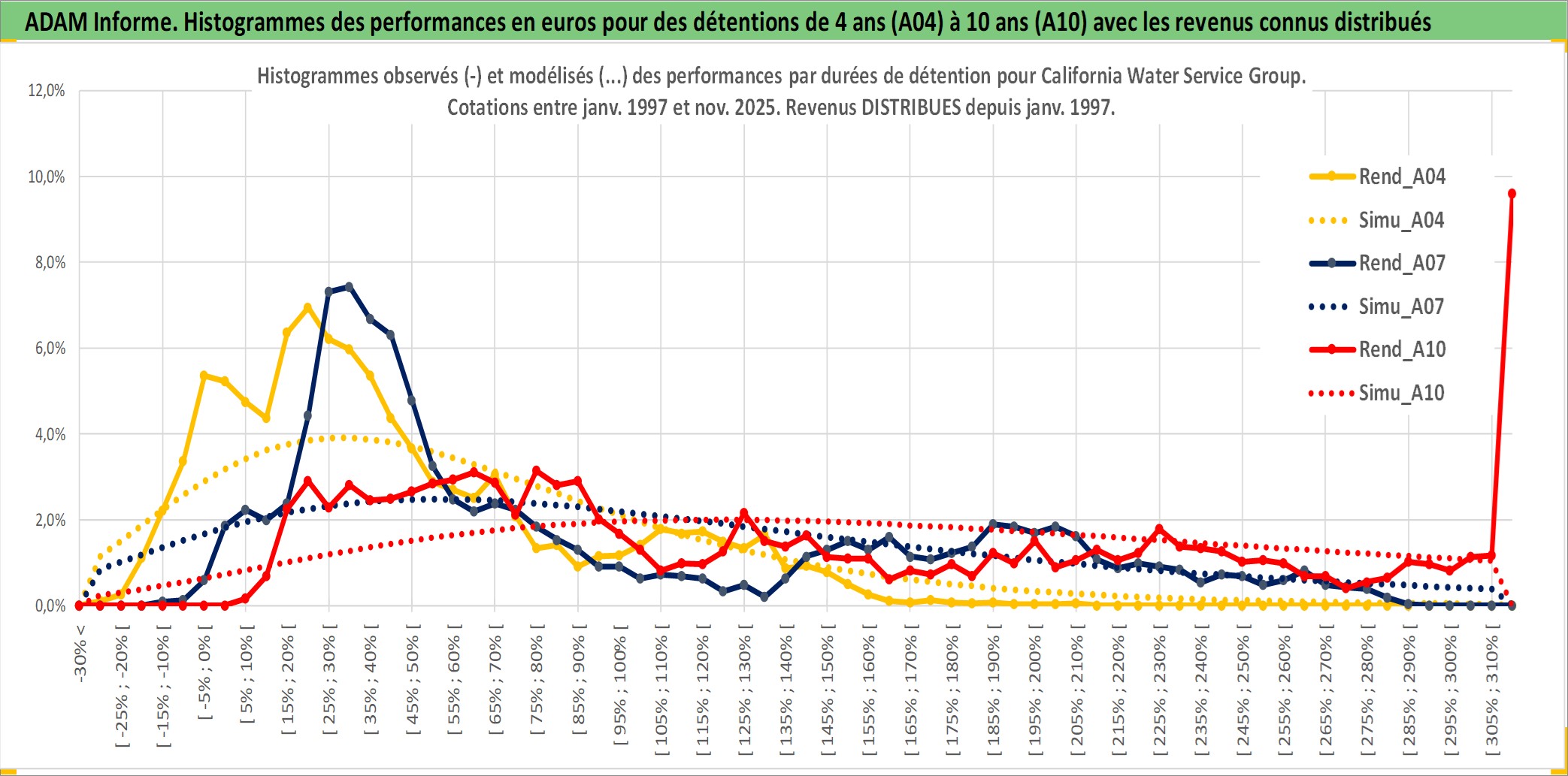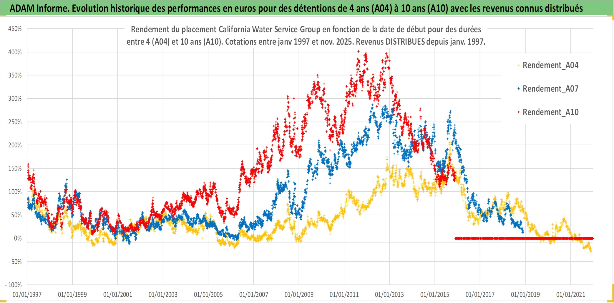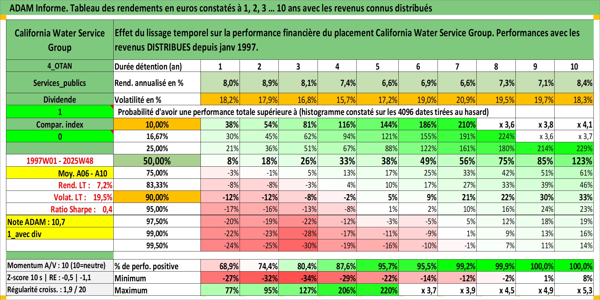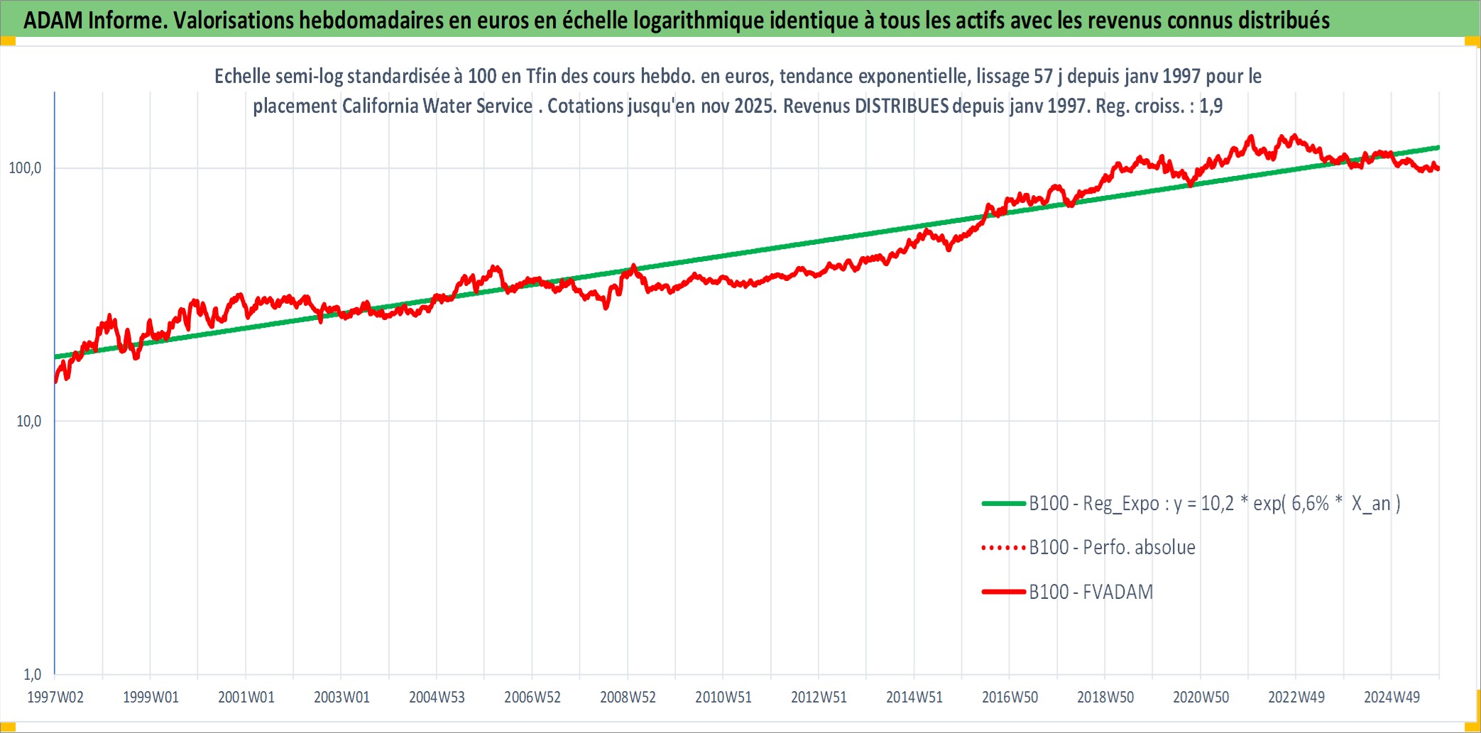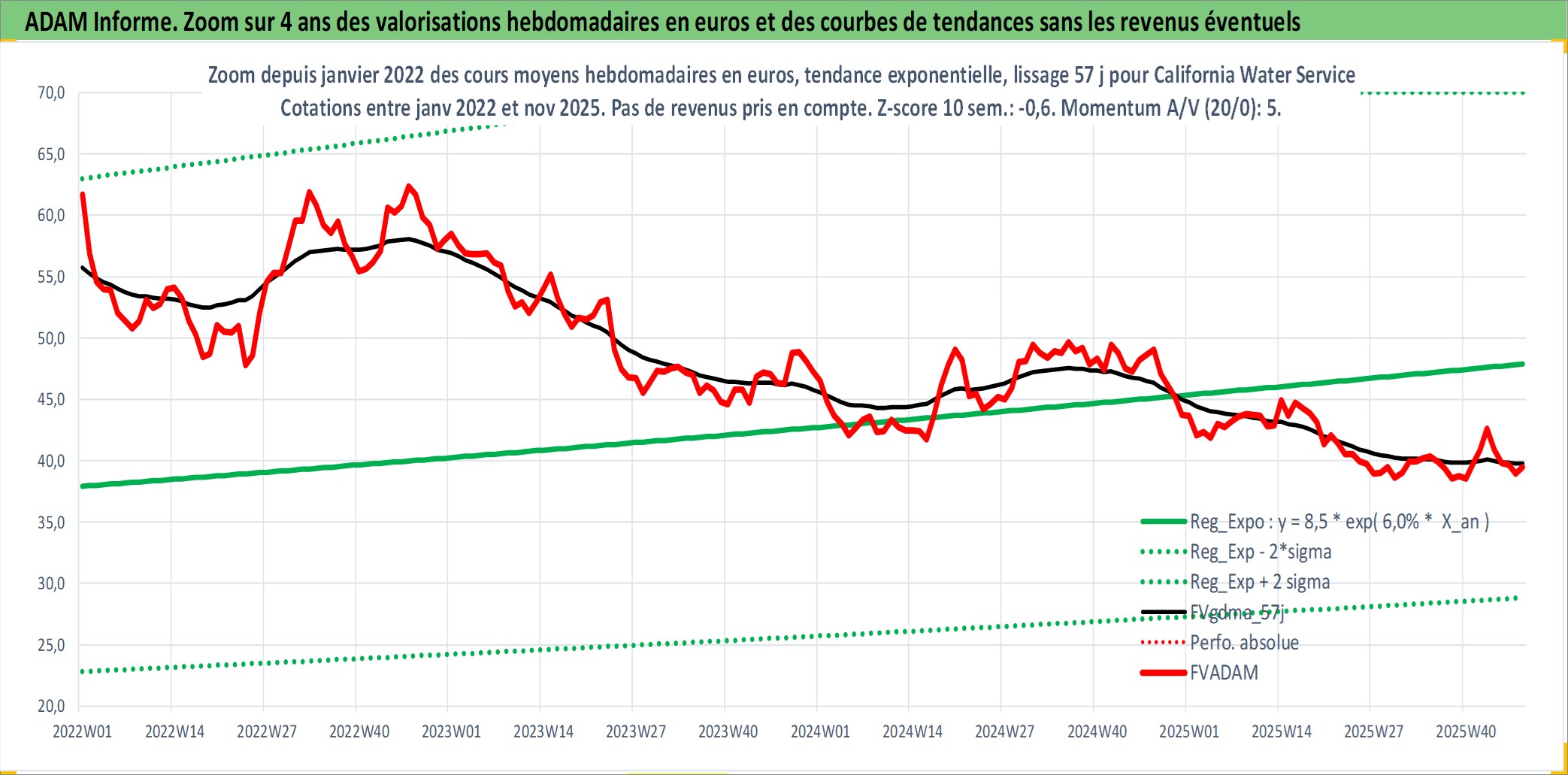 Site dédié aux investisseursPage dédiée sur site financeAnalyse des valorisations hebdomadaires de l'action California Water Service Group. Cet actif est cote en USD. Les valorisations sont en contrevaleur EURO et couvrent les semaines 1997W01 a 2025W48. Les revenus de cet actif financier sont pris en compte depuis la semaine 1997W05. La note ESG de cet actif n'est pas connue.