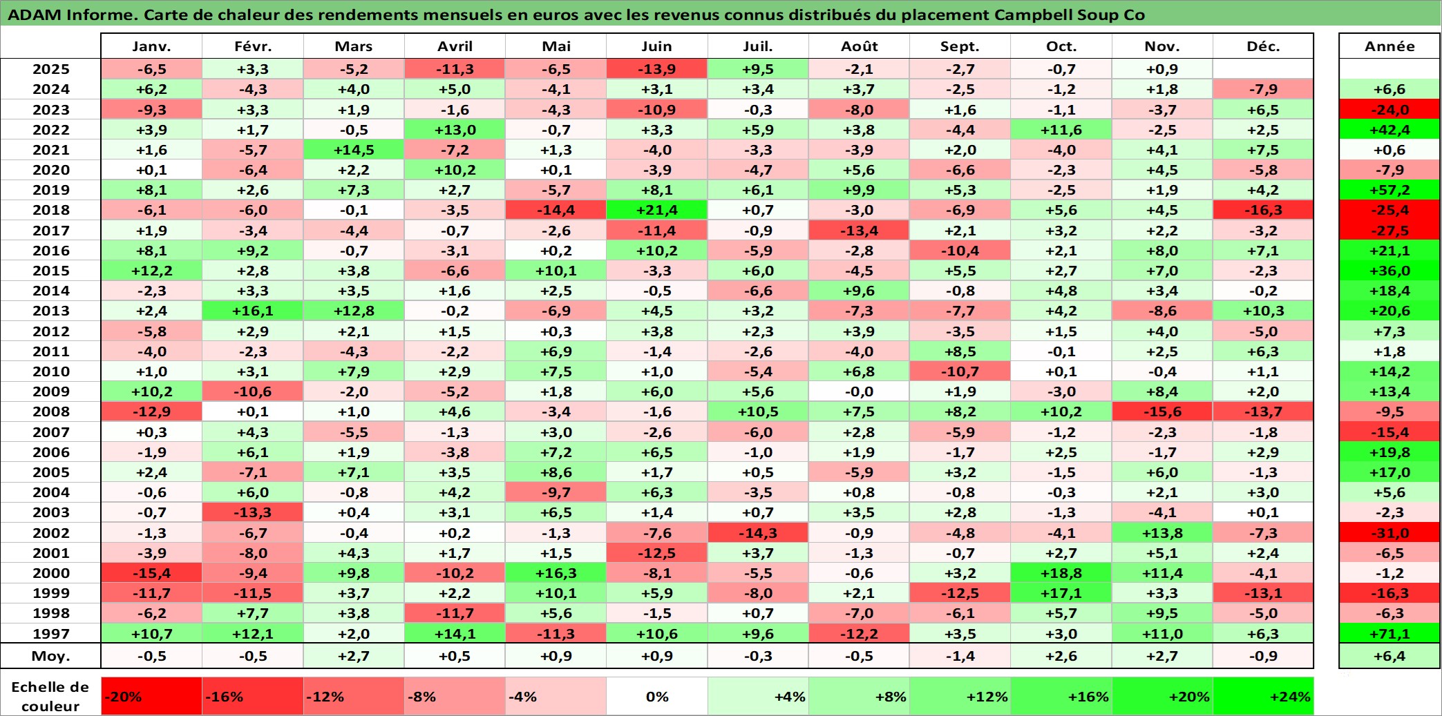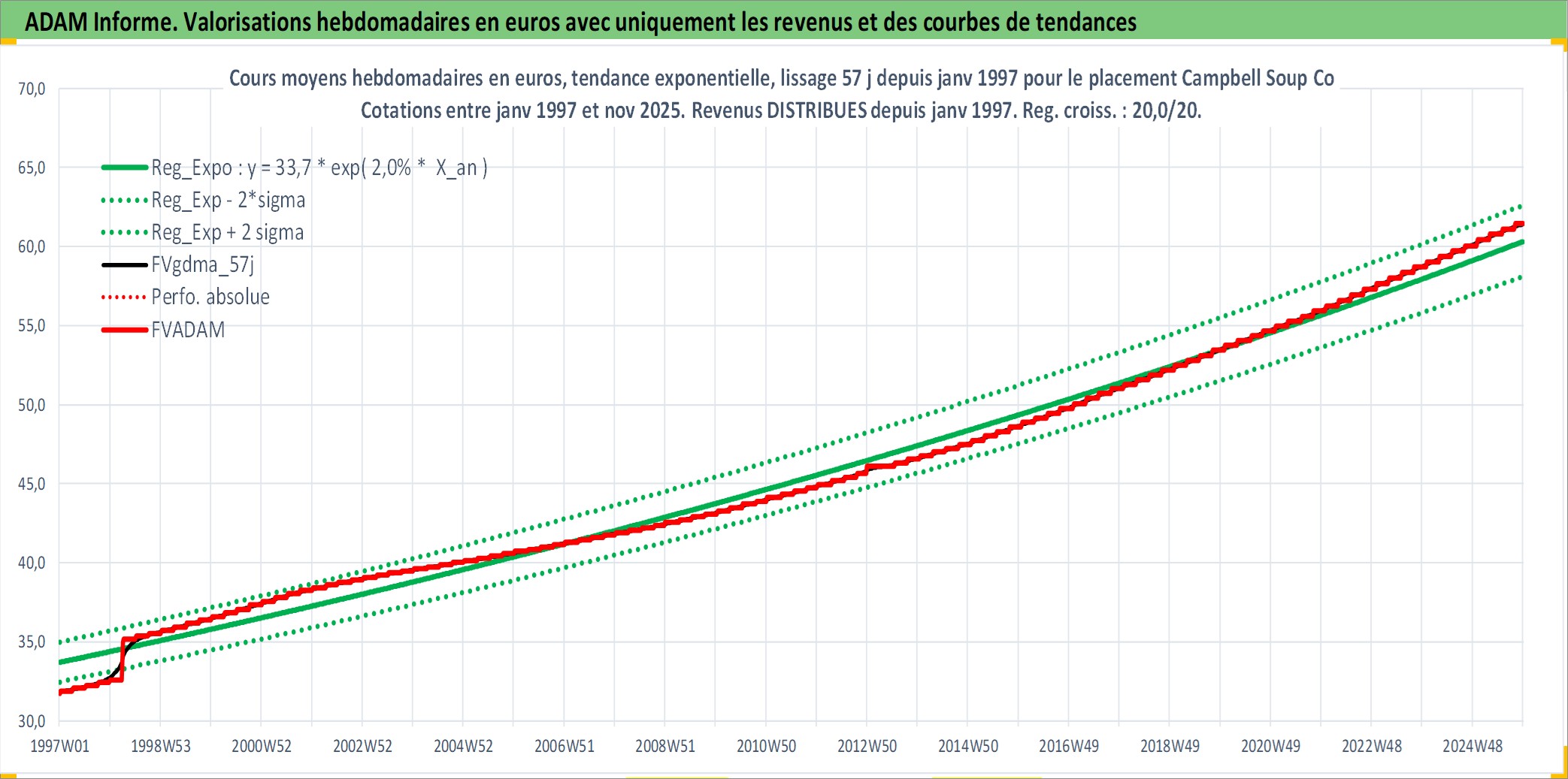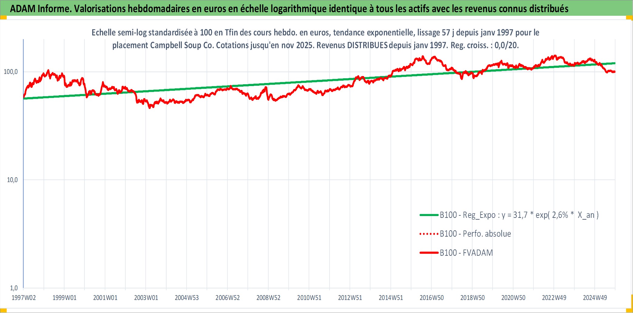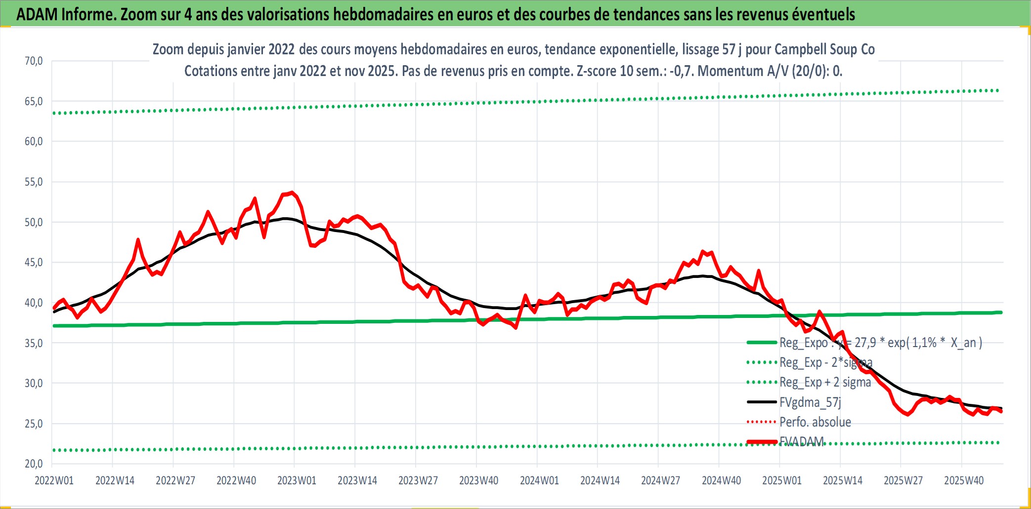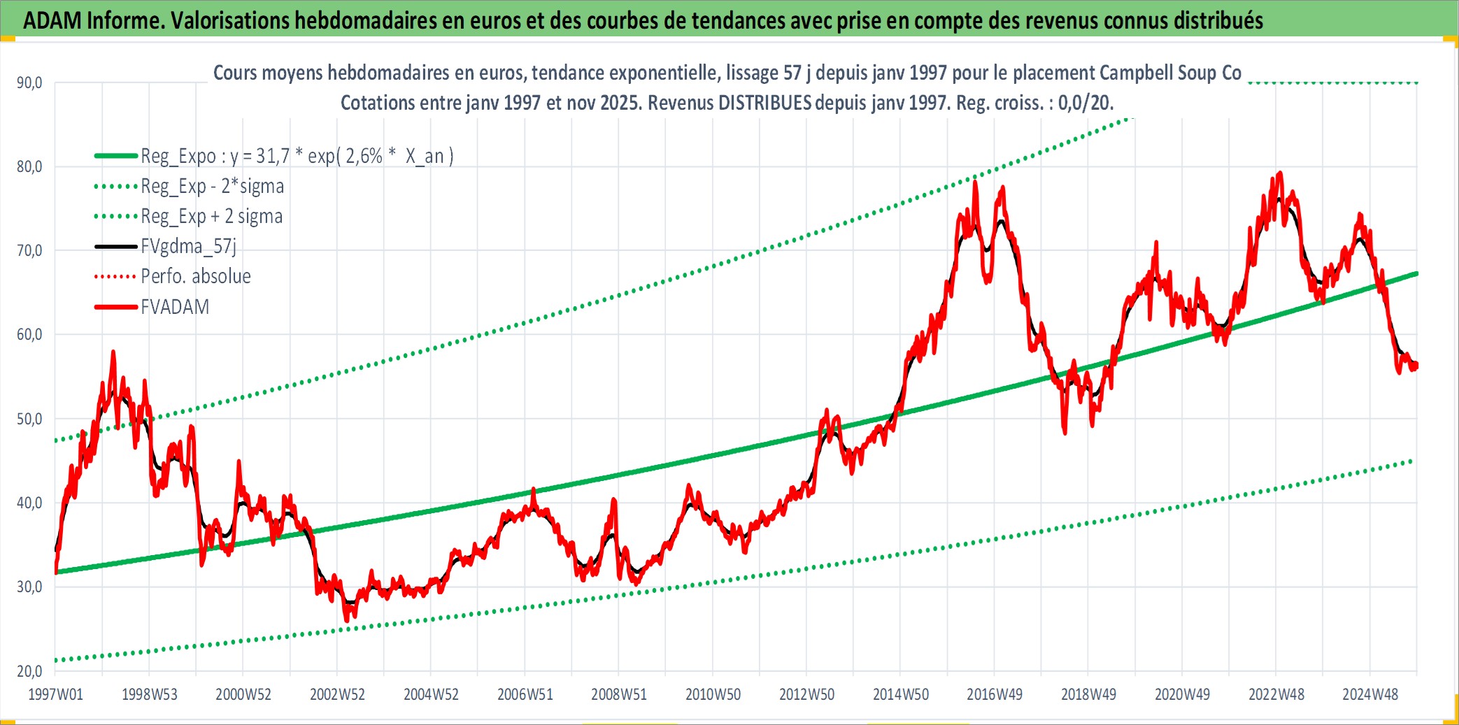 Site dédié aux investisseursPage dédiée sur site financeAnalyse des valorisations hebdomadaires de l'action Campbell Soup Co. Cet actif est cote en USD. Les valorisations sont en contrevaleur EURO et couvrent les semaines 1997W01 a 2025W48. Les revenus de cet actif financier sont pris en compte depuis la semaine 1997W02. La note globale ESG de cet actif est estimee a 8.0 (apres rebasage entre 0 et 20).