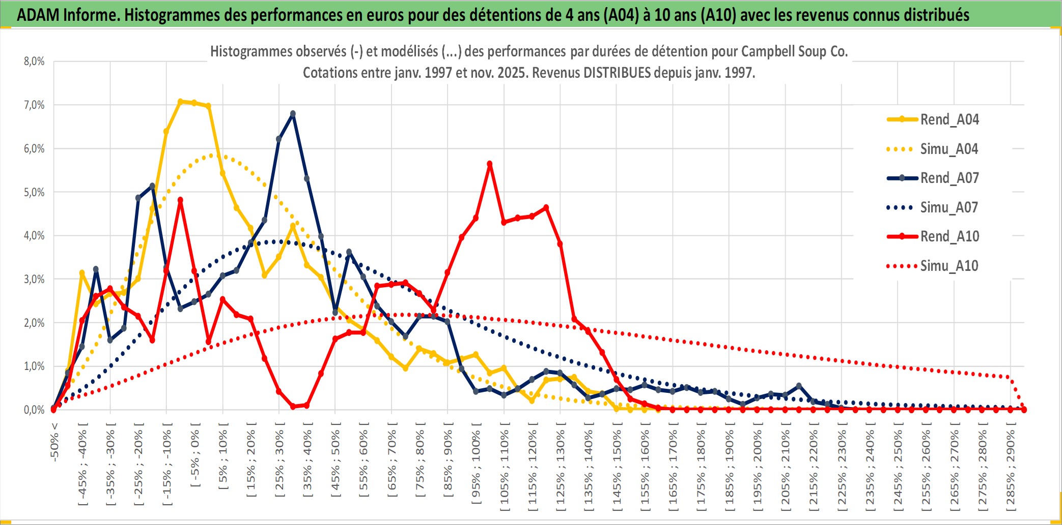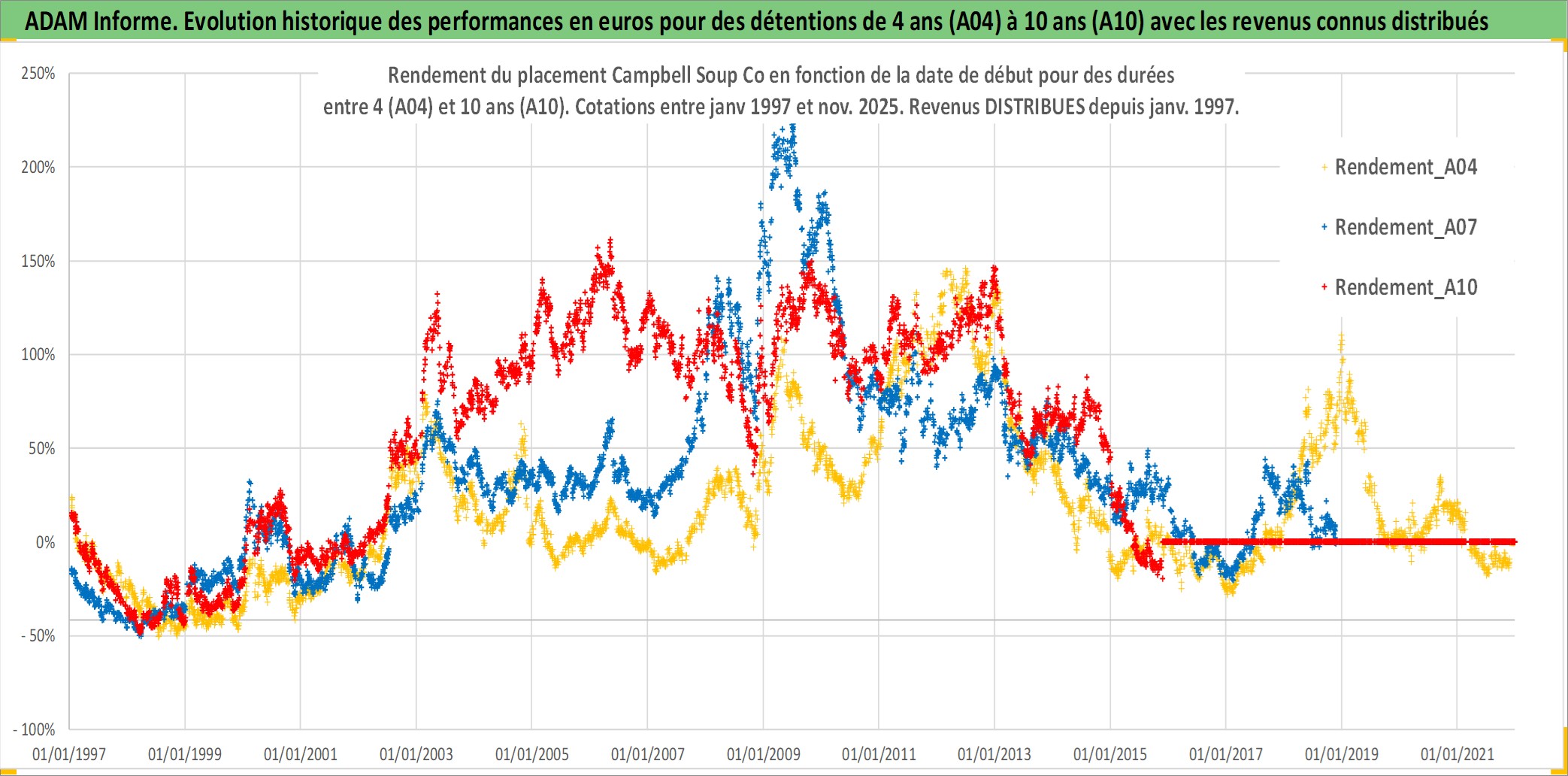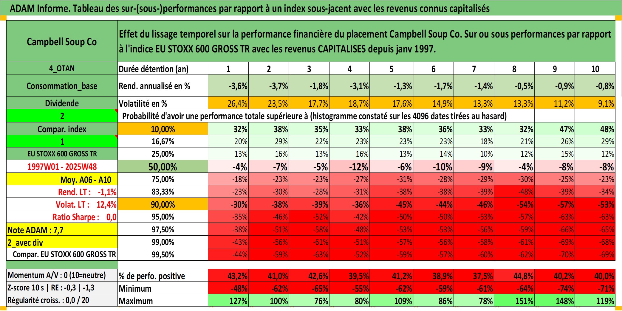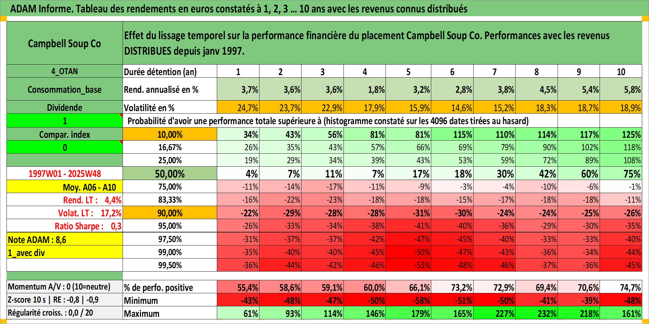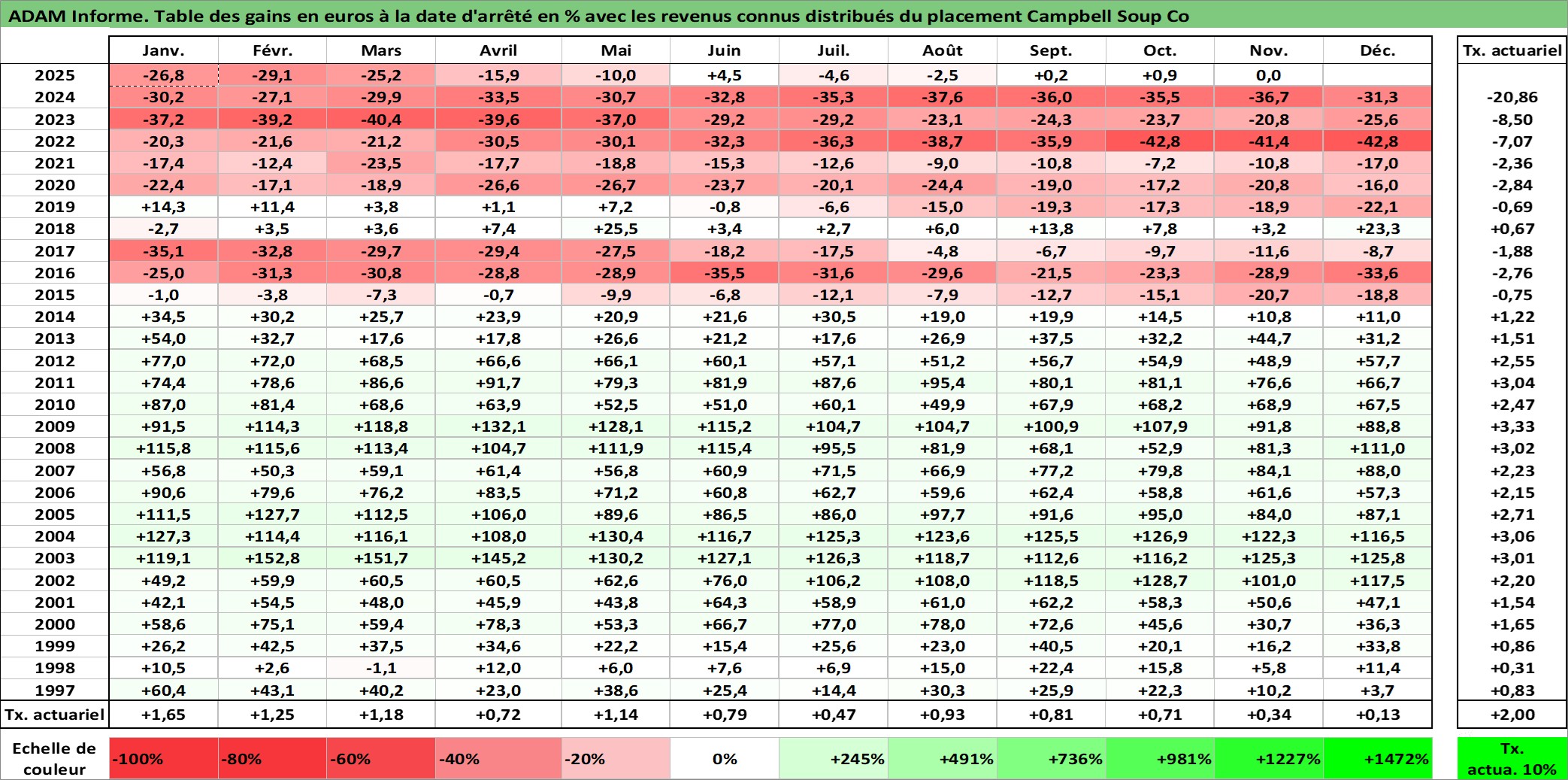 Site dédié aux investisseursPage dédiée sur site financeAnalyse des valorisations hebdomadaires de l'action Campbell Soup Co. Cet actif est cote en USD. Les valorisations sont en contrevaleur EURO et couvrent les semaines 1997W01 a 2025W48. Les revenus de cet actif financier sont pris en compte depuis la semaine 1997W02. La note globale ESG de cet actif est estimee a 8.0 (apres rebasage entre 0 et 20).