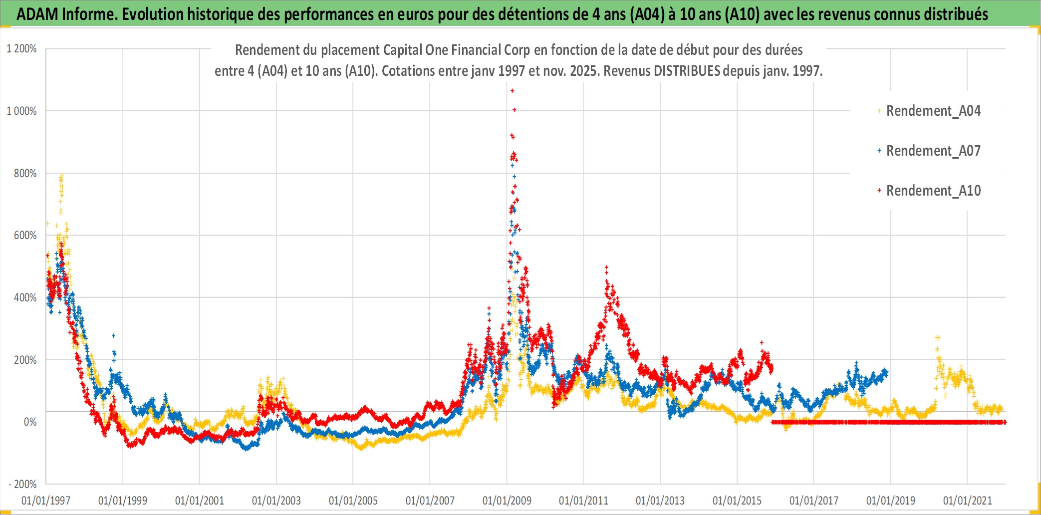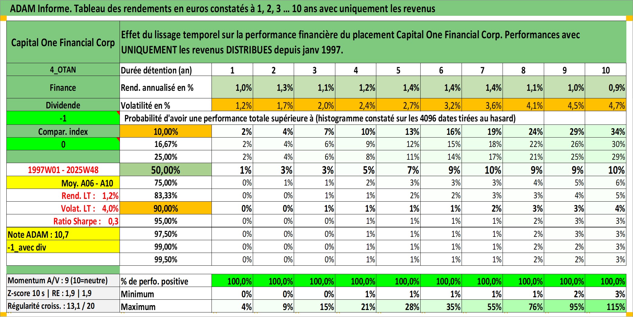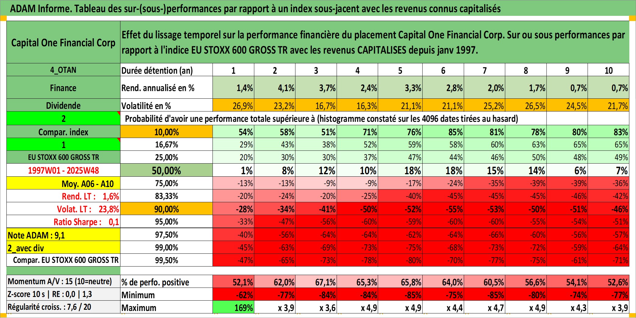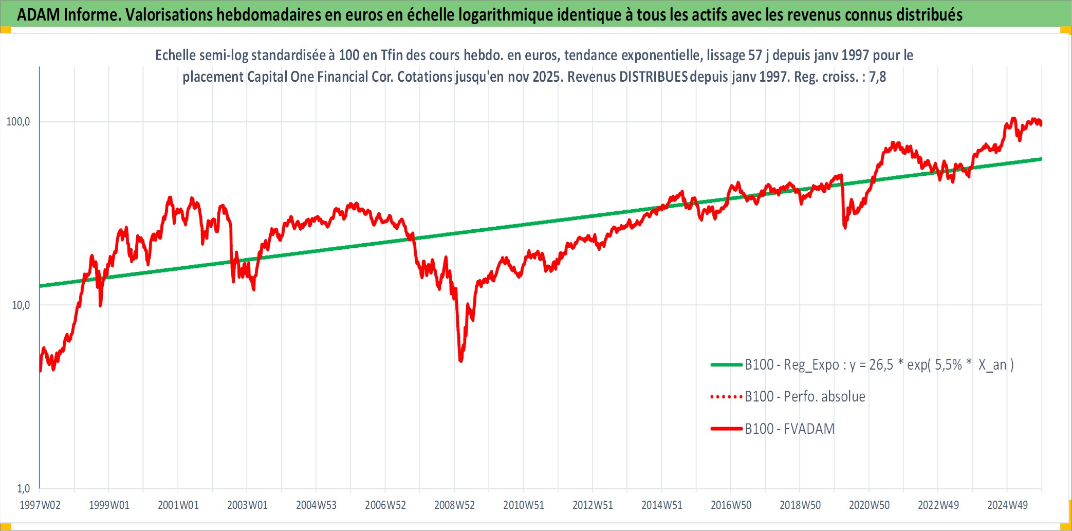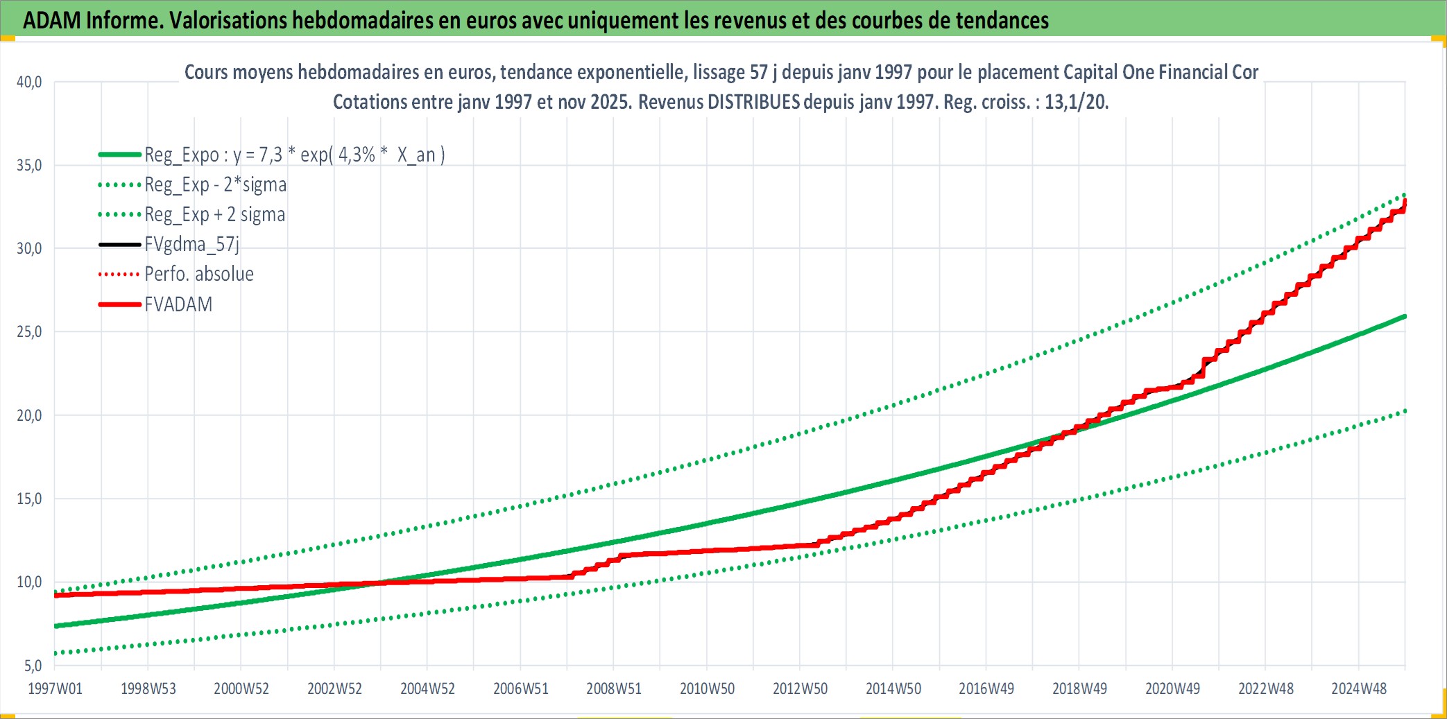 Site dédié aux investisseursPage dédiée sur site financeAnalyse des valorisations hebdomadaires de l'action Capital One Financial Corp. Cet actif est cote en USD. Les valorisations sont en contrevaleur EURO et couvrent les semaines 1997W01 a 2025W48. Les revenus de cet actif financier sont pris en compte depuis la semaine 1997W05. La note globale ESG de cet actif est estimee a 9.0 (apres rebasage entre 0 et 20).