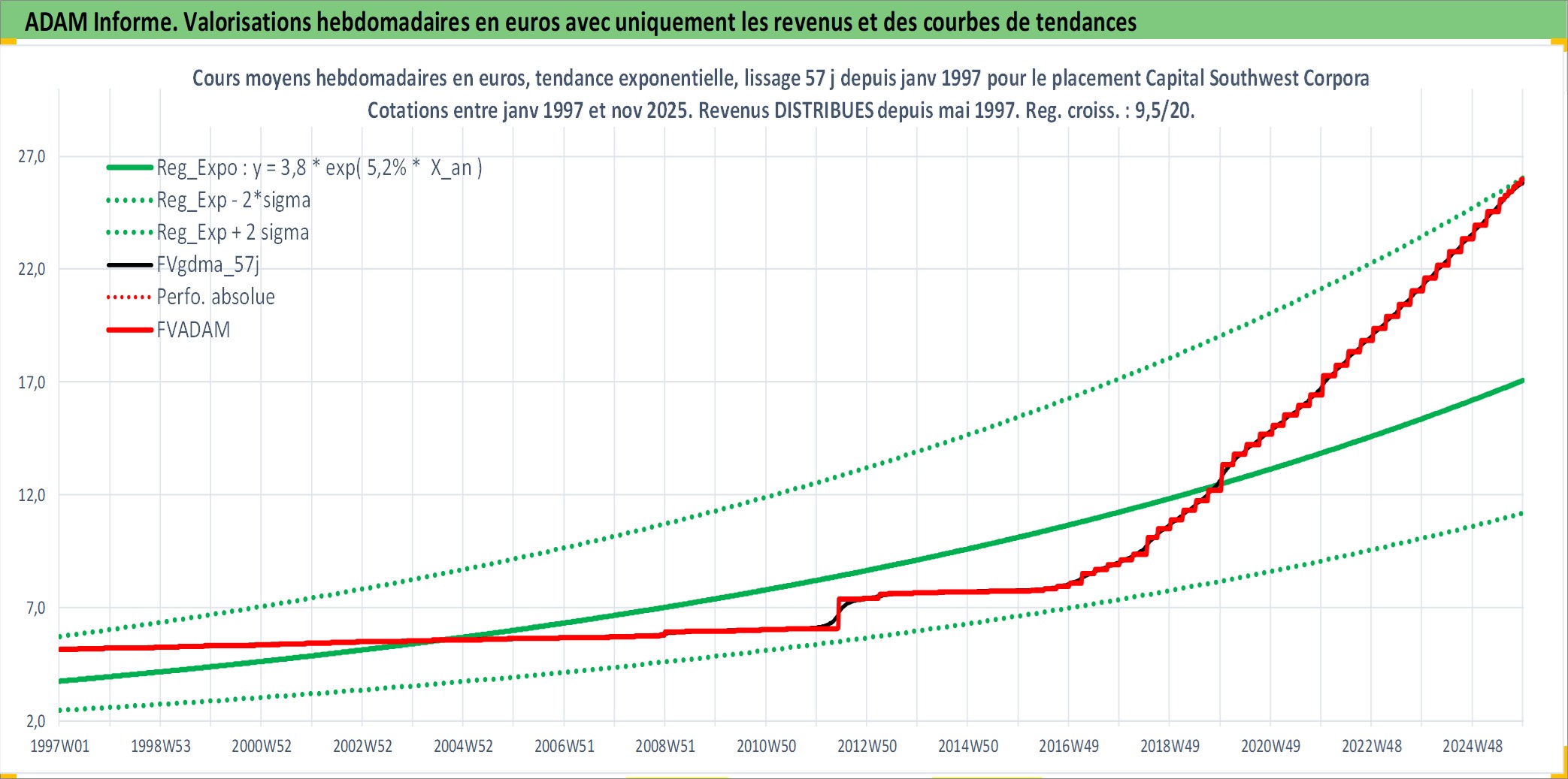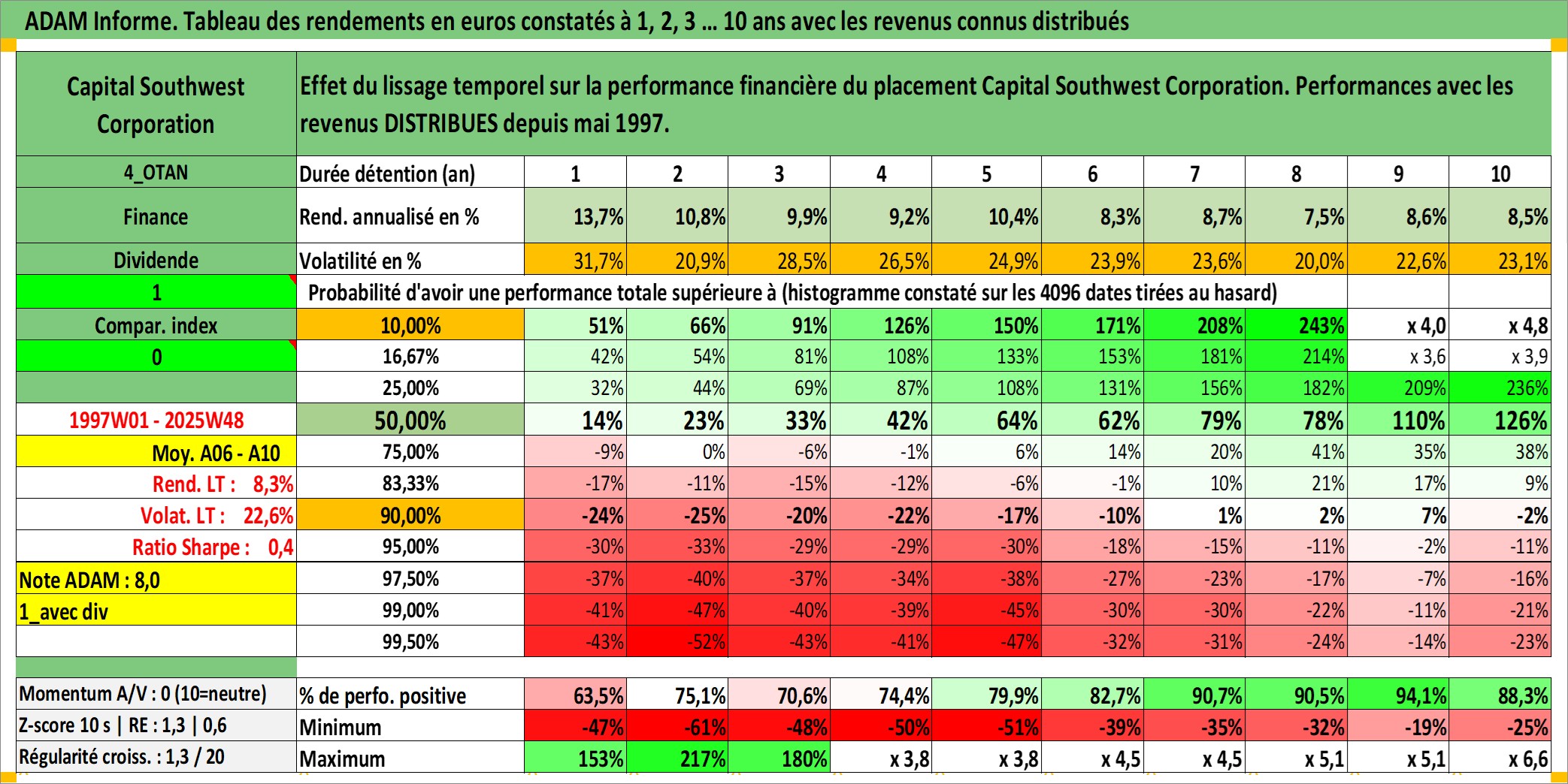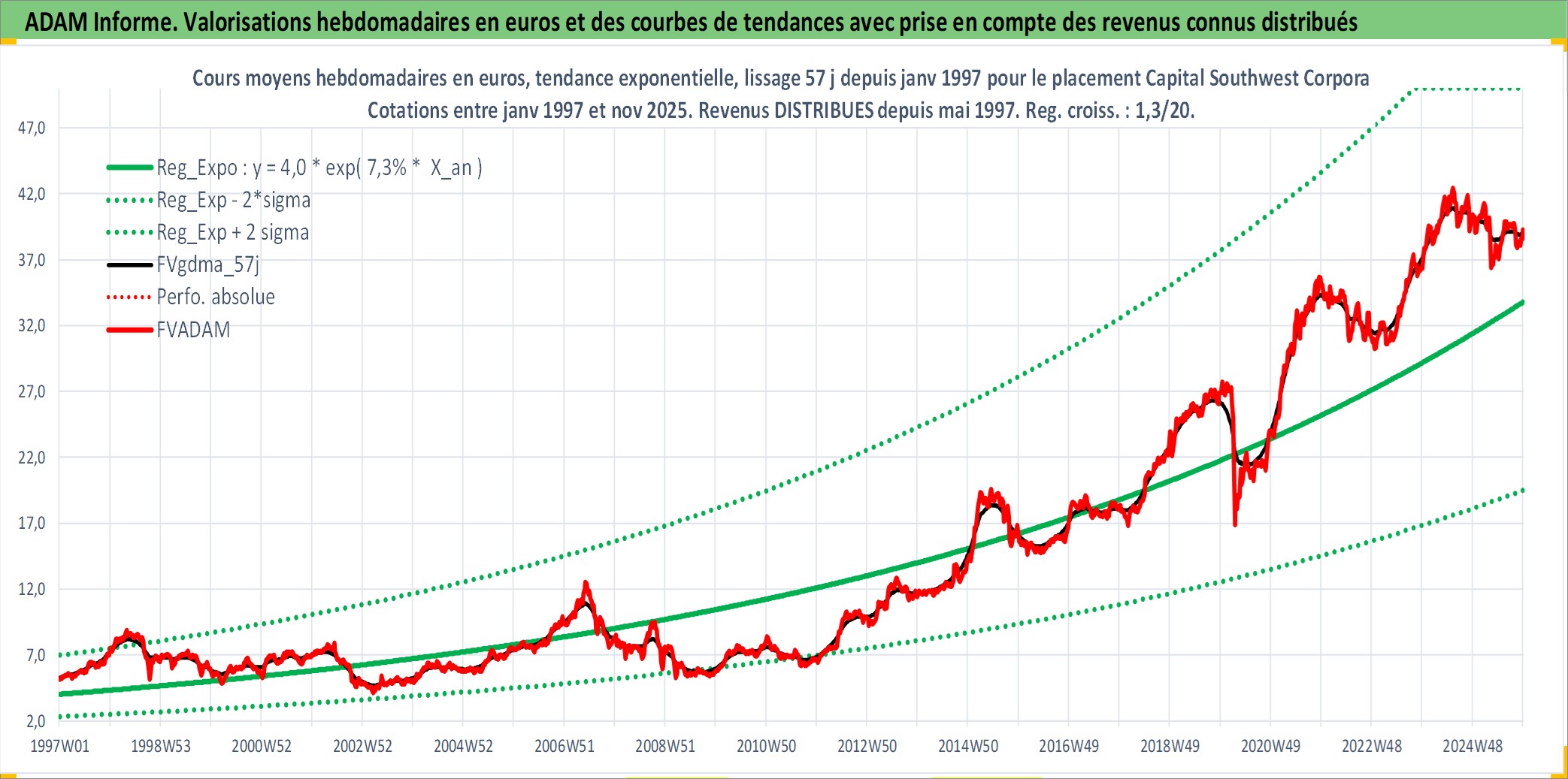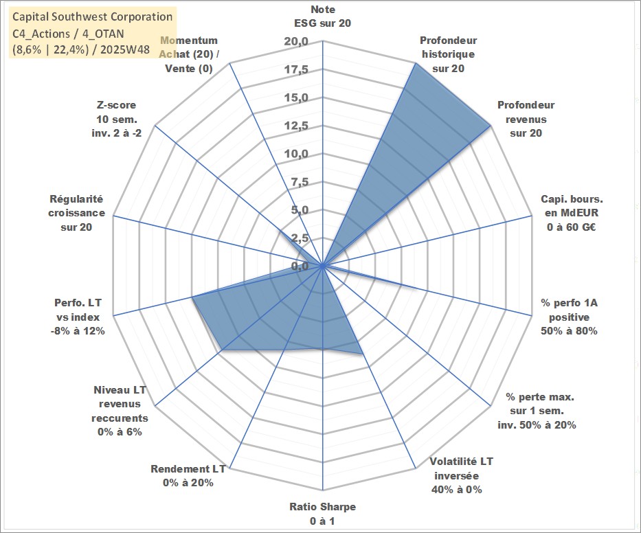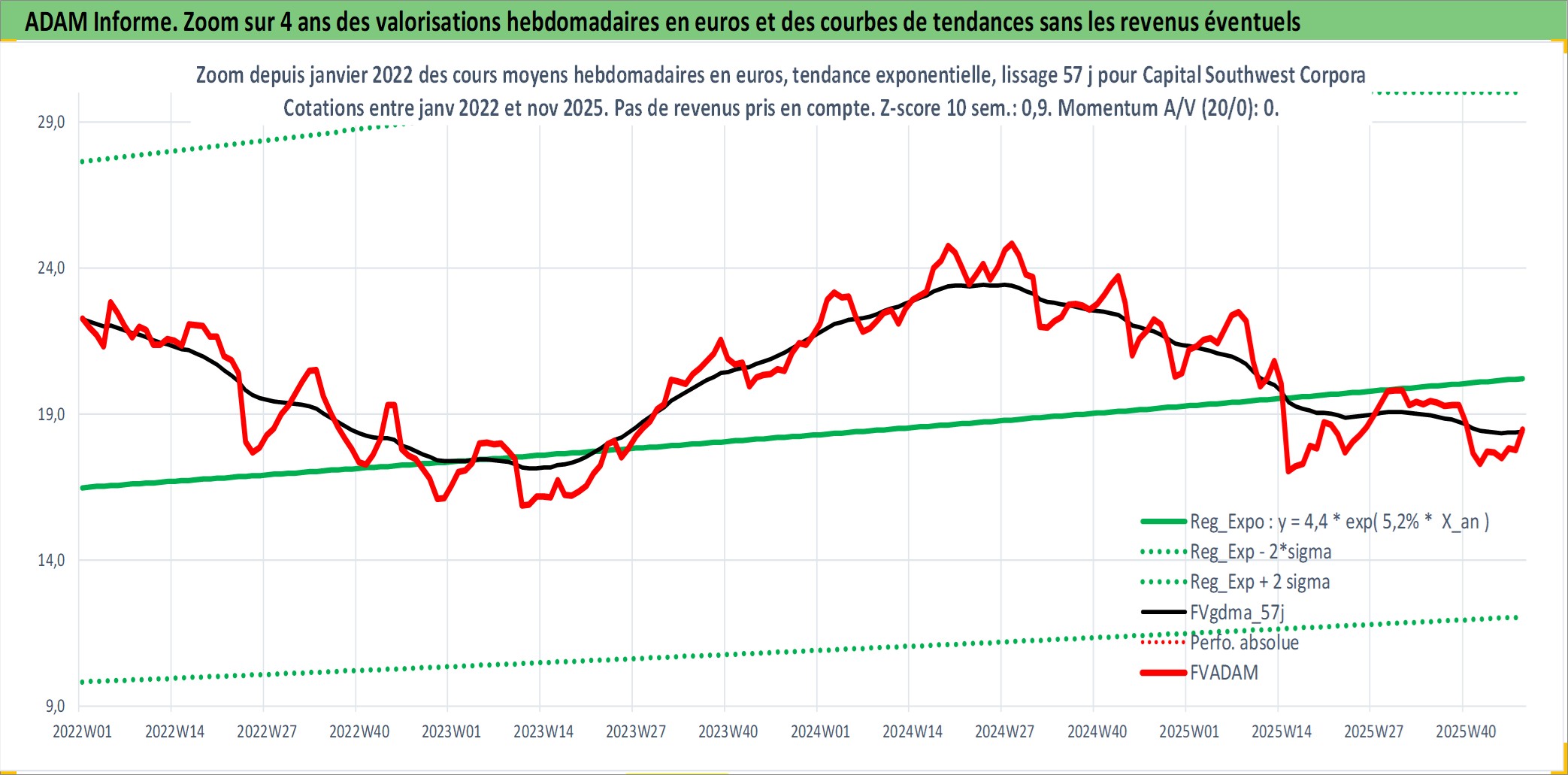 Site dédié aux investisseursPage dédiée sur site financeAnalyse des valorisations hebdomadaires de l'action Capital Southwest Corporation. Cet actif est cote en USD. Les valorisations sont en contrevaleur EURO et couvrent les semaines 1997W01 a 2025W48. Les revenus de cet actif financier sont pris en compte depuis la semaine 1997W20. La note ESG de cet actif n'est pas connue.