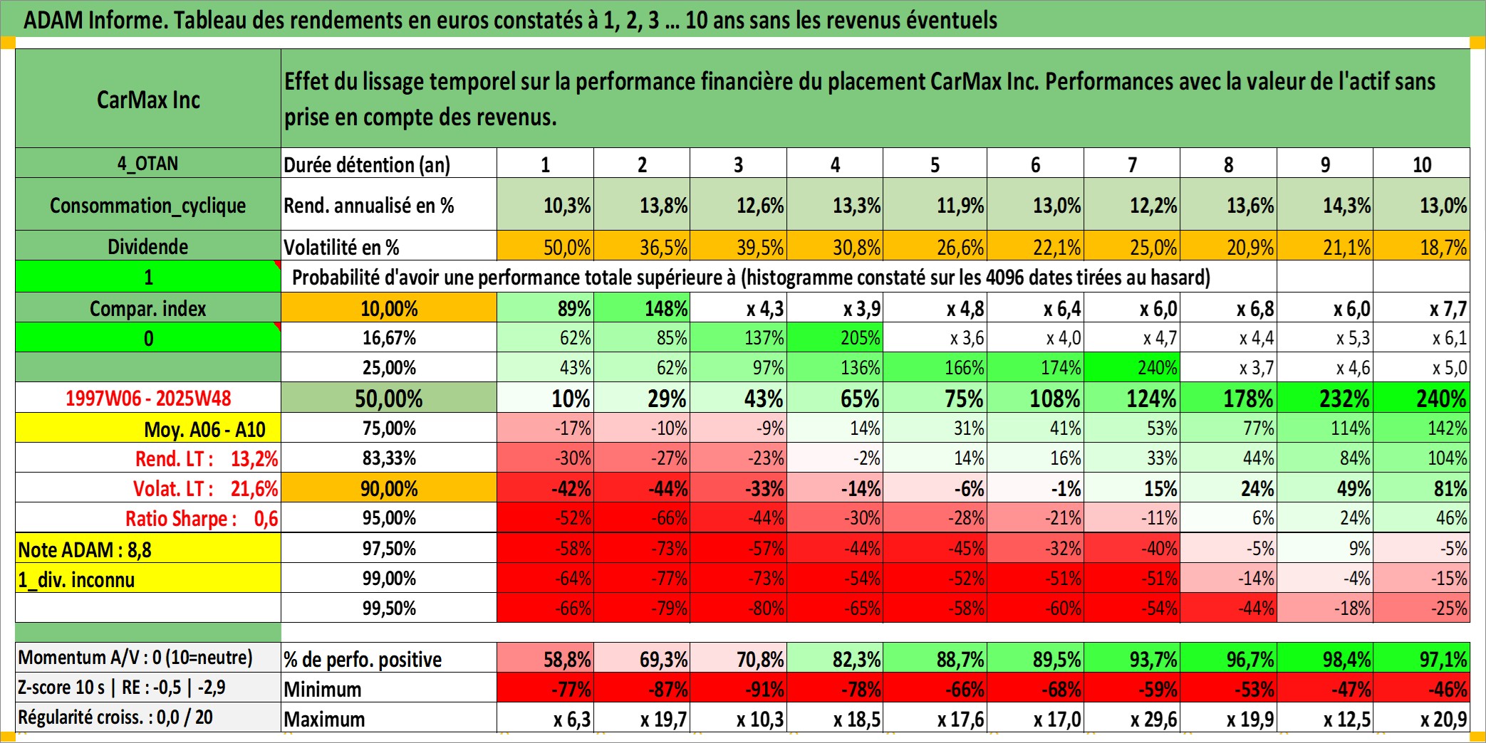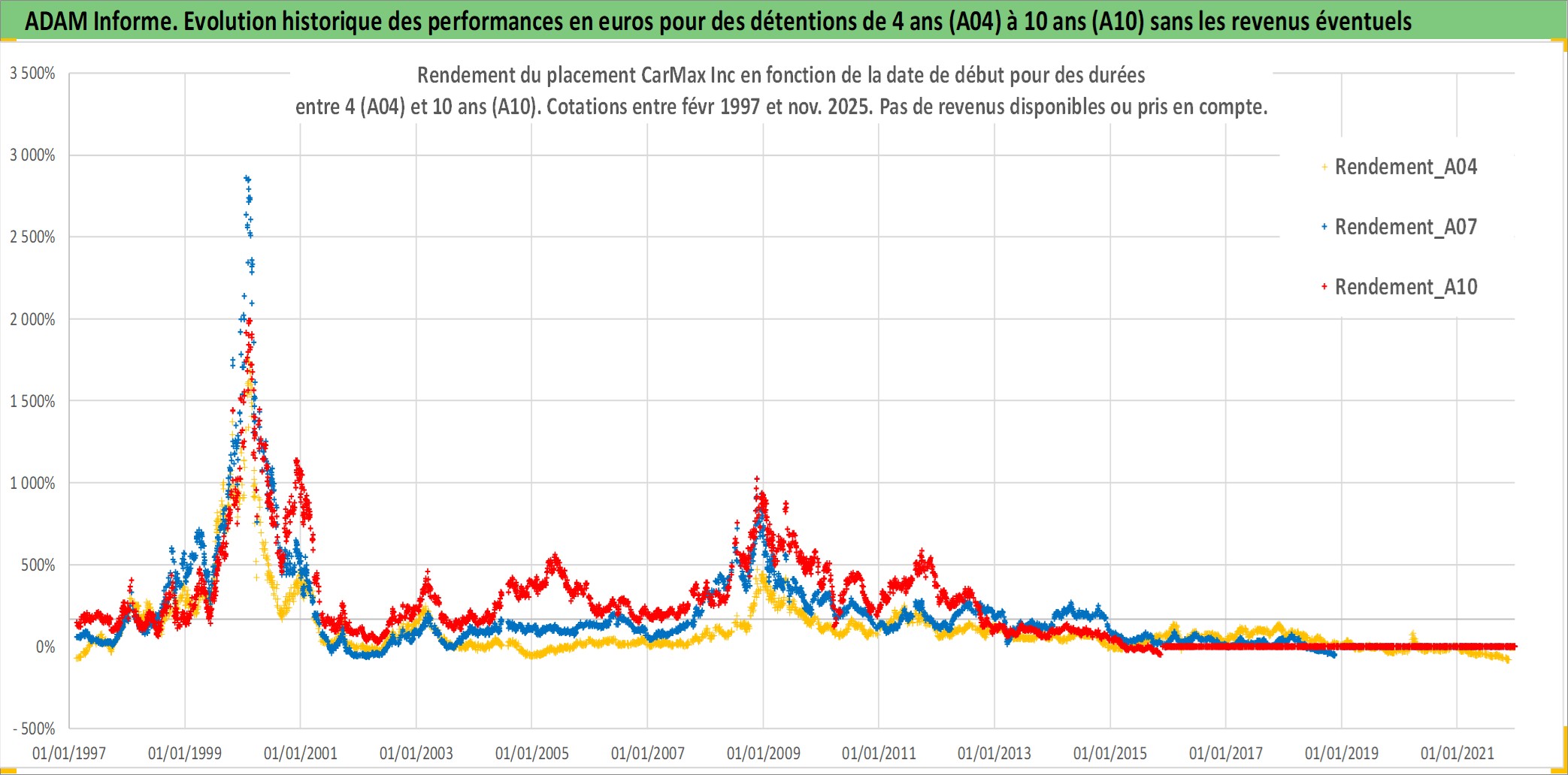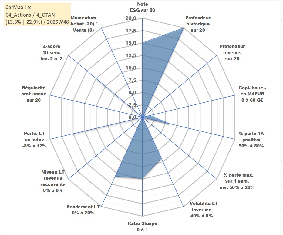 Site dédié aux investisseursPage dédiée sur site financeAnalyse des valorisations hebdomadaires de l'action CarMax Inc. Cet actif est cote en USD. Les valorisations sont en contrevaleur EURO et couvrent les semaines 1997W06 a 2025W48. Les revenus de cet actif financier ne sont pas connus car non existants ou non disponibles sur le site Yahoo Finance. La note globale ESG de cet actif est estimee a 15.0 (apres rebasage entre 0 et 20).