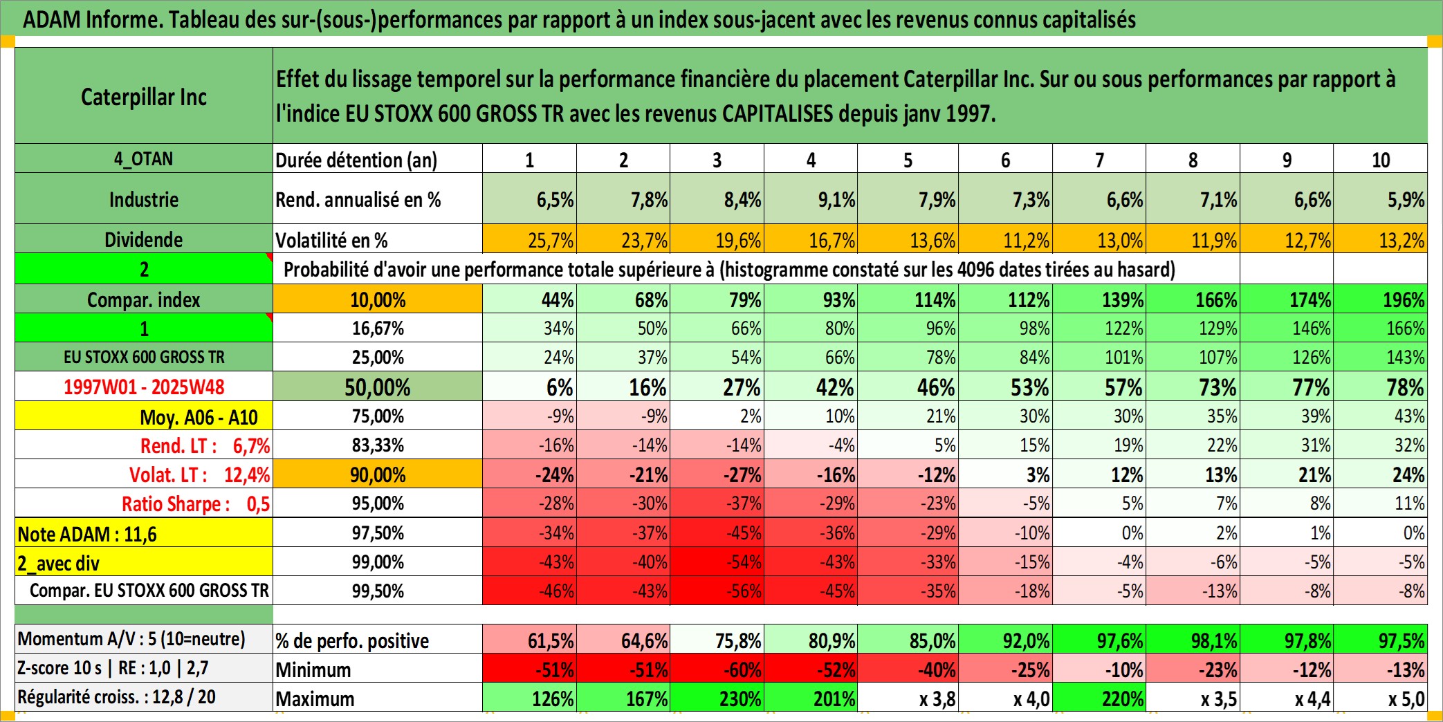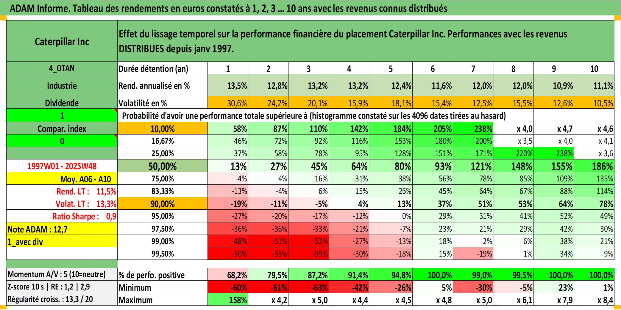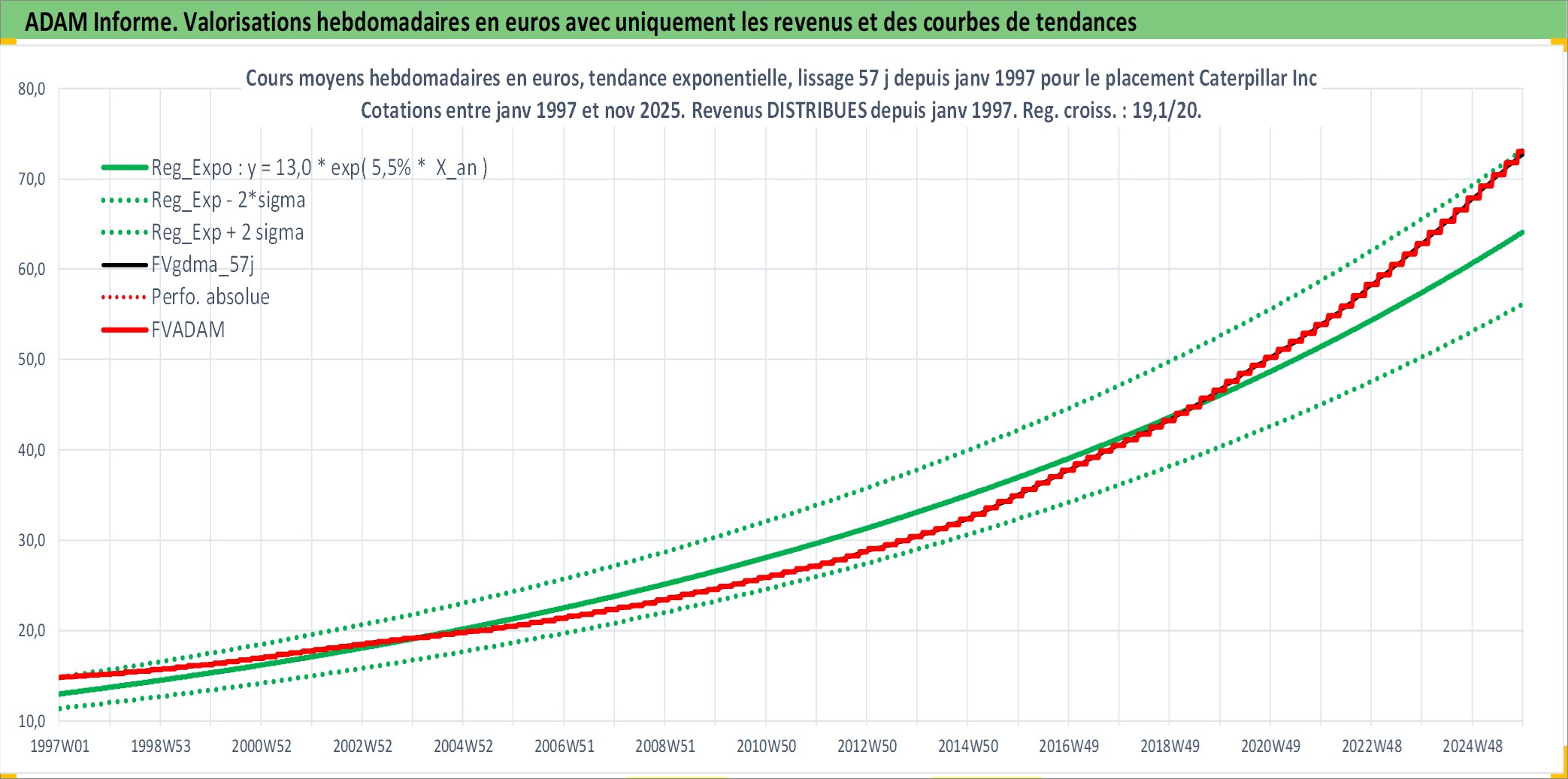 Site dédié aux investisseursPage dédiée sur site financeAnalyse des valorisations hebdomadaires de l'action Caterpillar Inc. Cet actif est cote en USD. Les valorisations sont en contrevaleur EURO et couvrent les semaines 1997W01 a 2025W48. Les revenus de cet actif financier sont pris en compte depuis la semaine 1997W03. La note globale ESG de cet actif est estimee a 4.0 (apres rebasage entre 0 et 20).