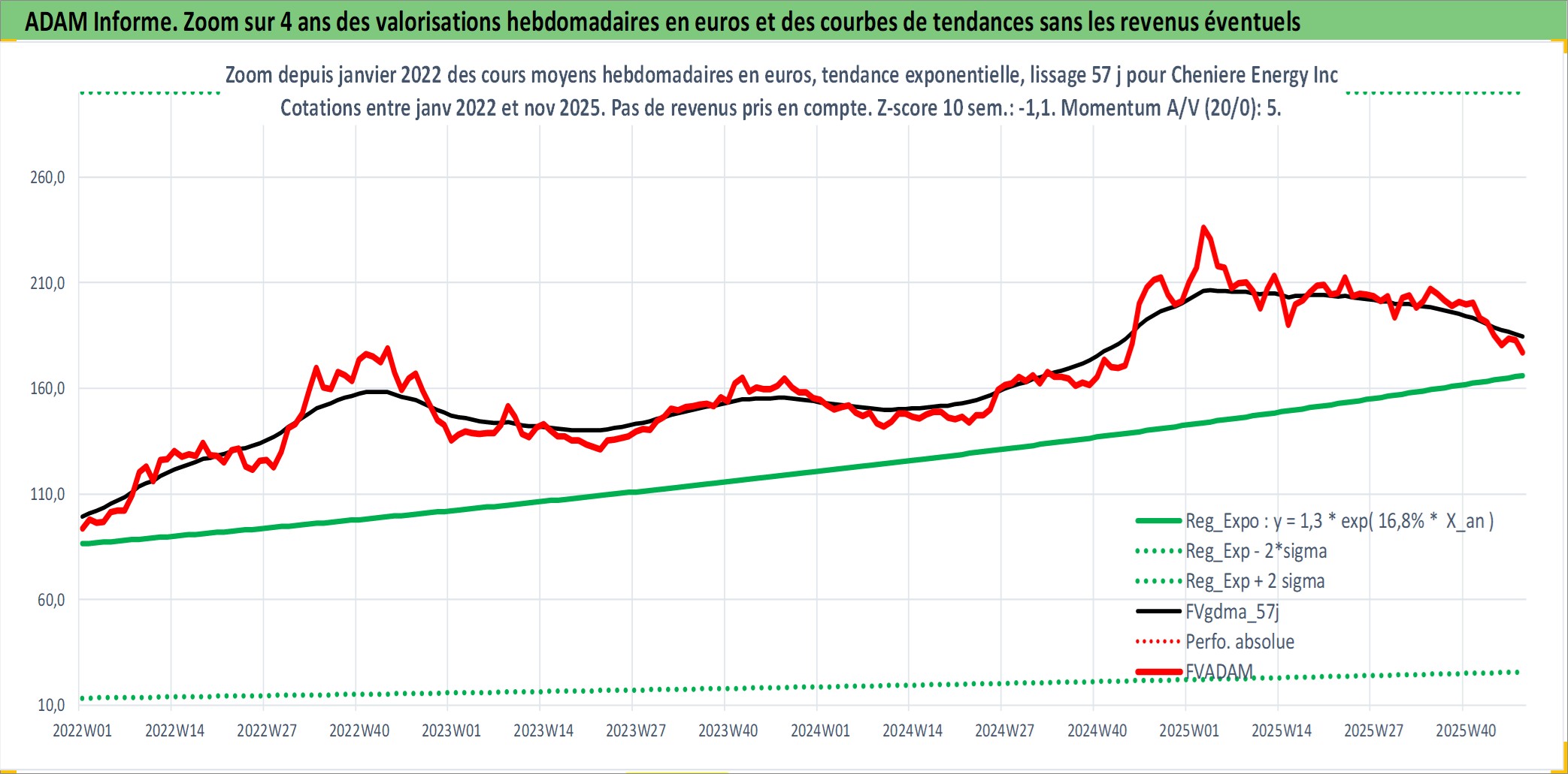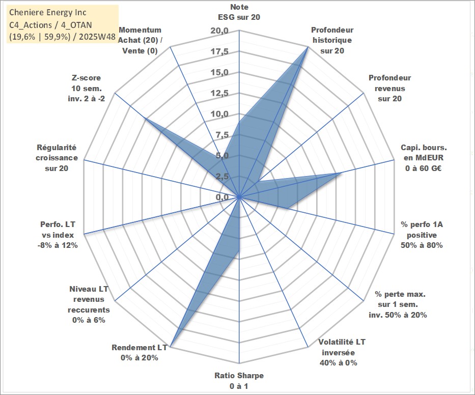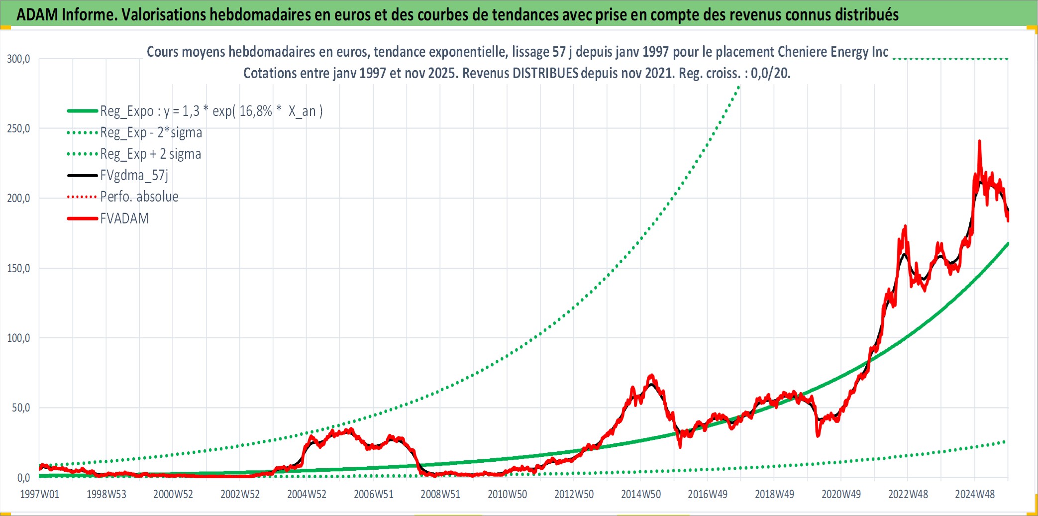 Site dédié aux investisseursPage dédiée sur site financeAnalyse des valorisations hebdomadaires de l'action Cheniere Energy Inc. Cet actif est cote en USD. Les valorisations sont en contrevaleur EURO et couvrent les semaines 1997W01 a 2025W48. Les revenus de cet actif financier sont pris en compte depuis la semaine 2021W44. La note globale ESG de cet actif est estimee a 9.0 (apres rebasage entre 0 et 20).