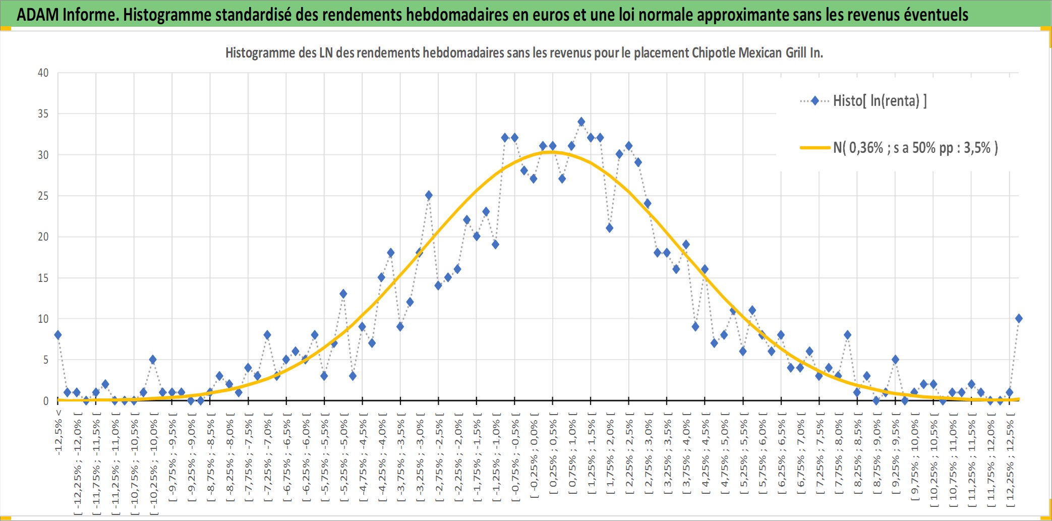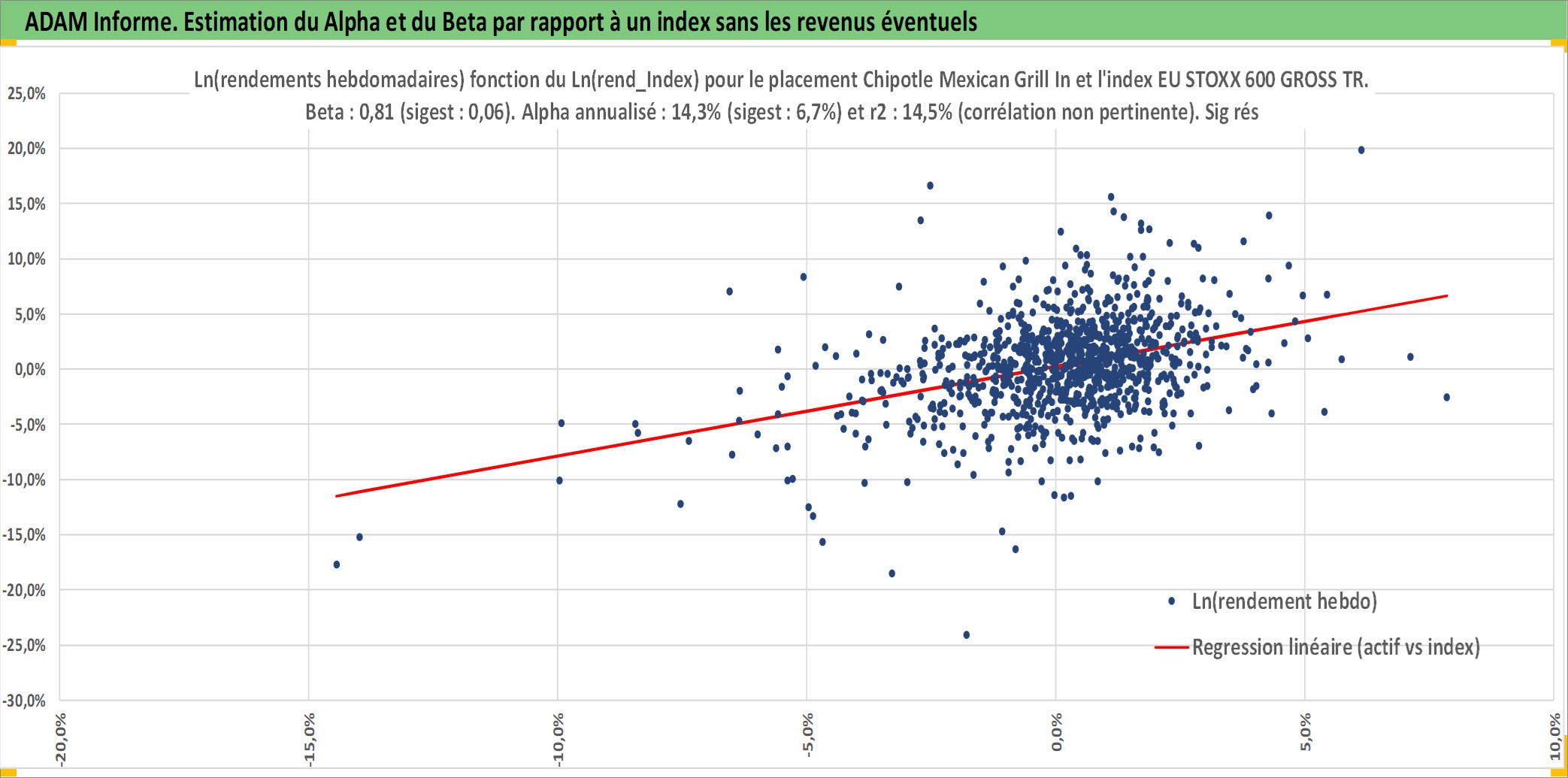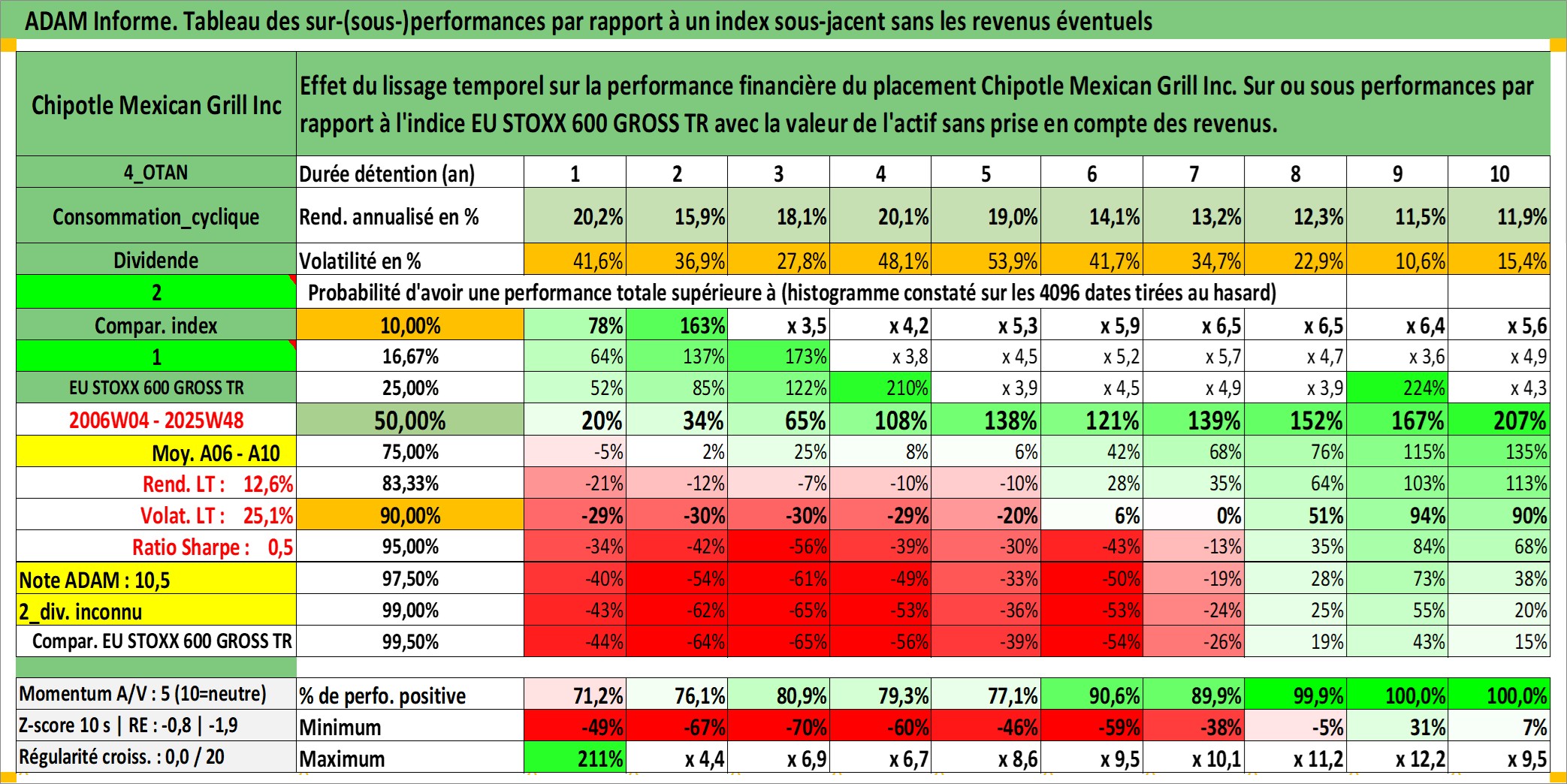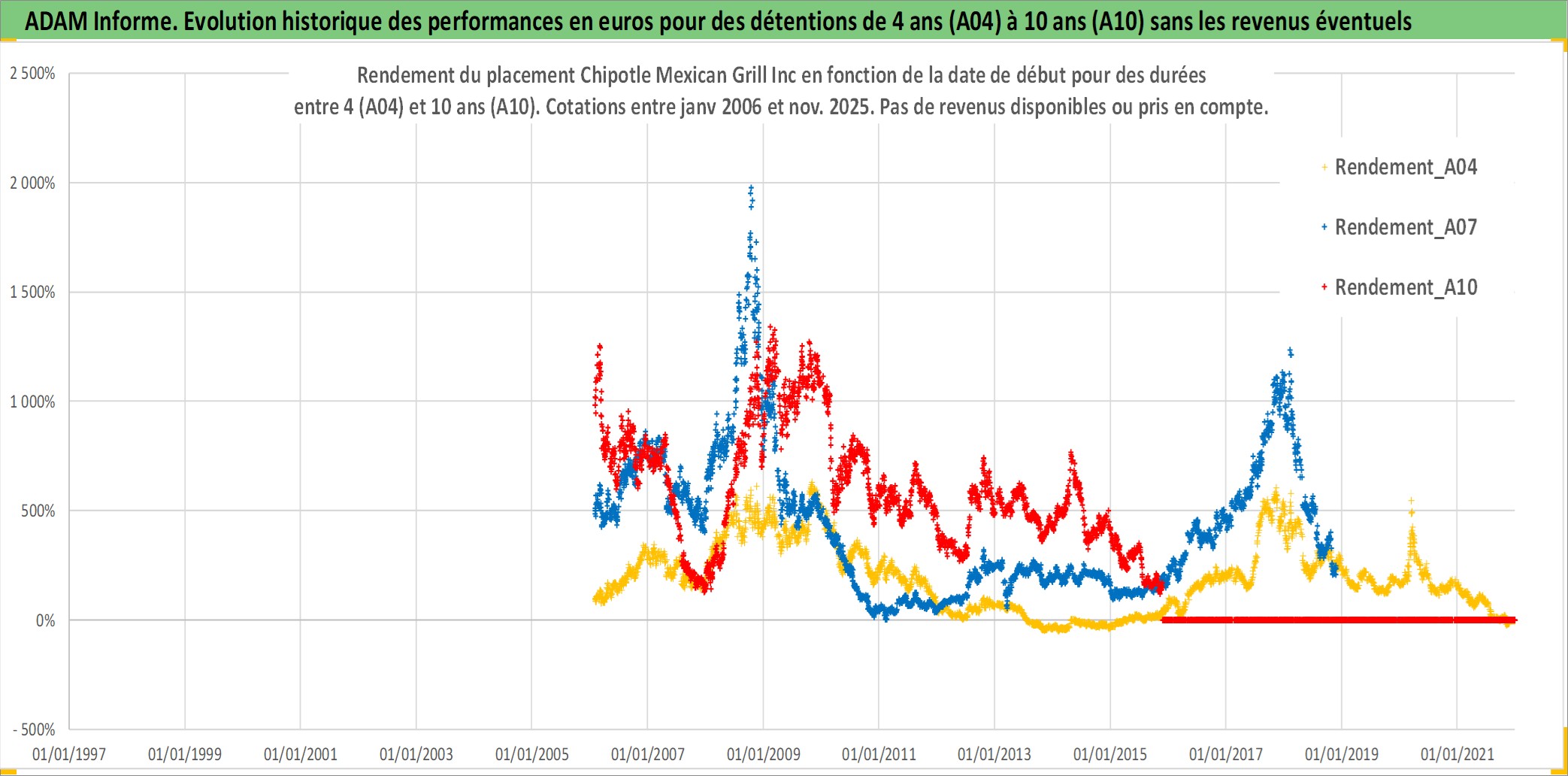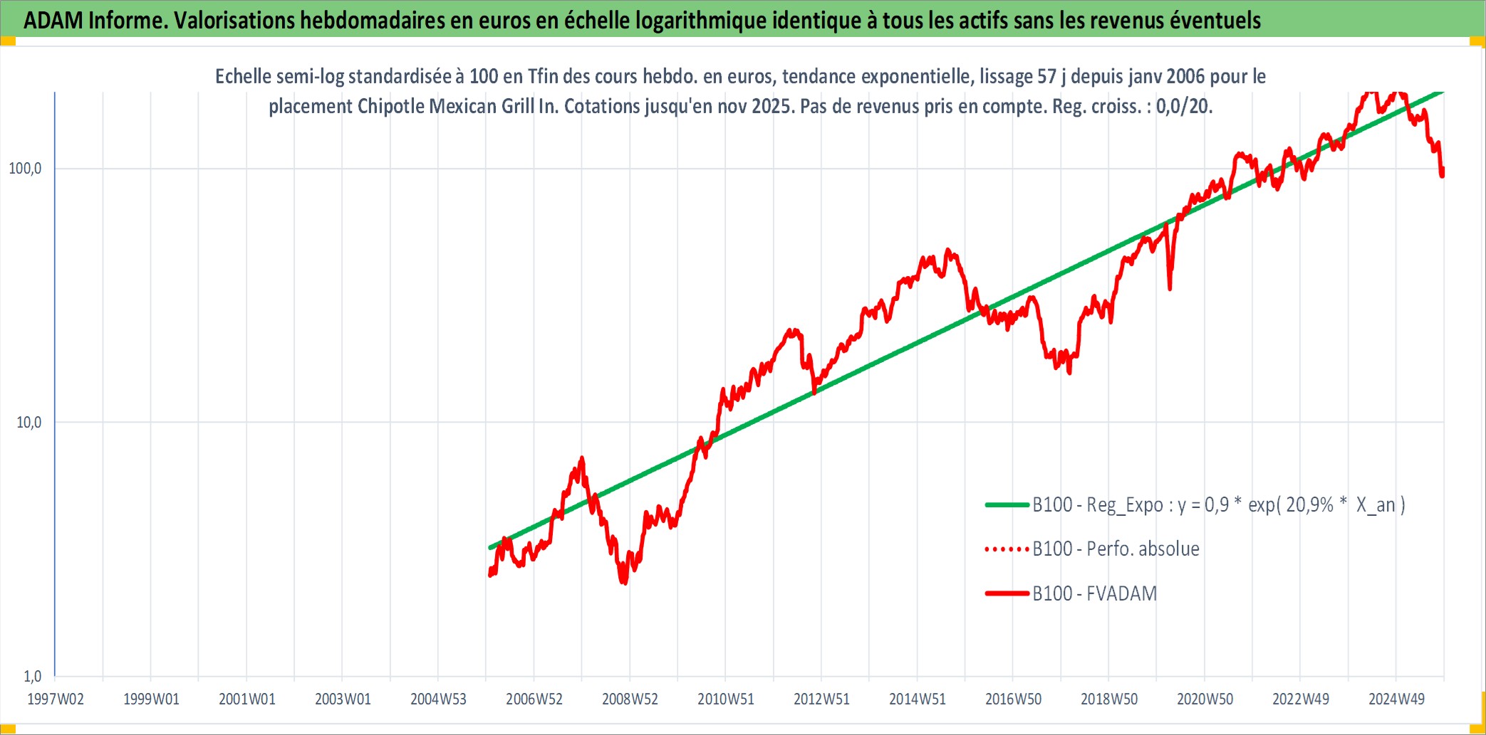 Site dédié aux investisseursPage dédiée sur site financeAnalyse des valorisations hebdomadaires de l'action Chipotle Mexican Grill Inc. Cet actif est cote en USD. Les valorisations sont en contrevaleur EURO et couvrent les semaines 2006W04 a 2025W48. Les revenus de cet actif financier ne sont pas connus car non existants ou non disponibles sur le site Yahoo Finance. La note globale ESG de cet actif est estimee a 8.0 (apres rebasage entre 0 et 20).