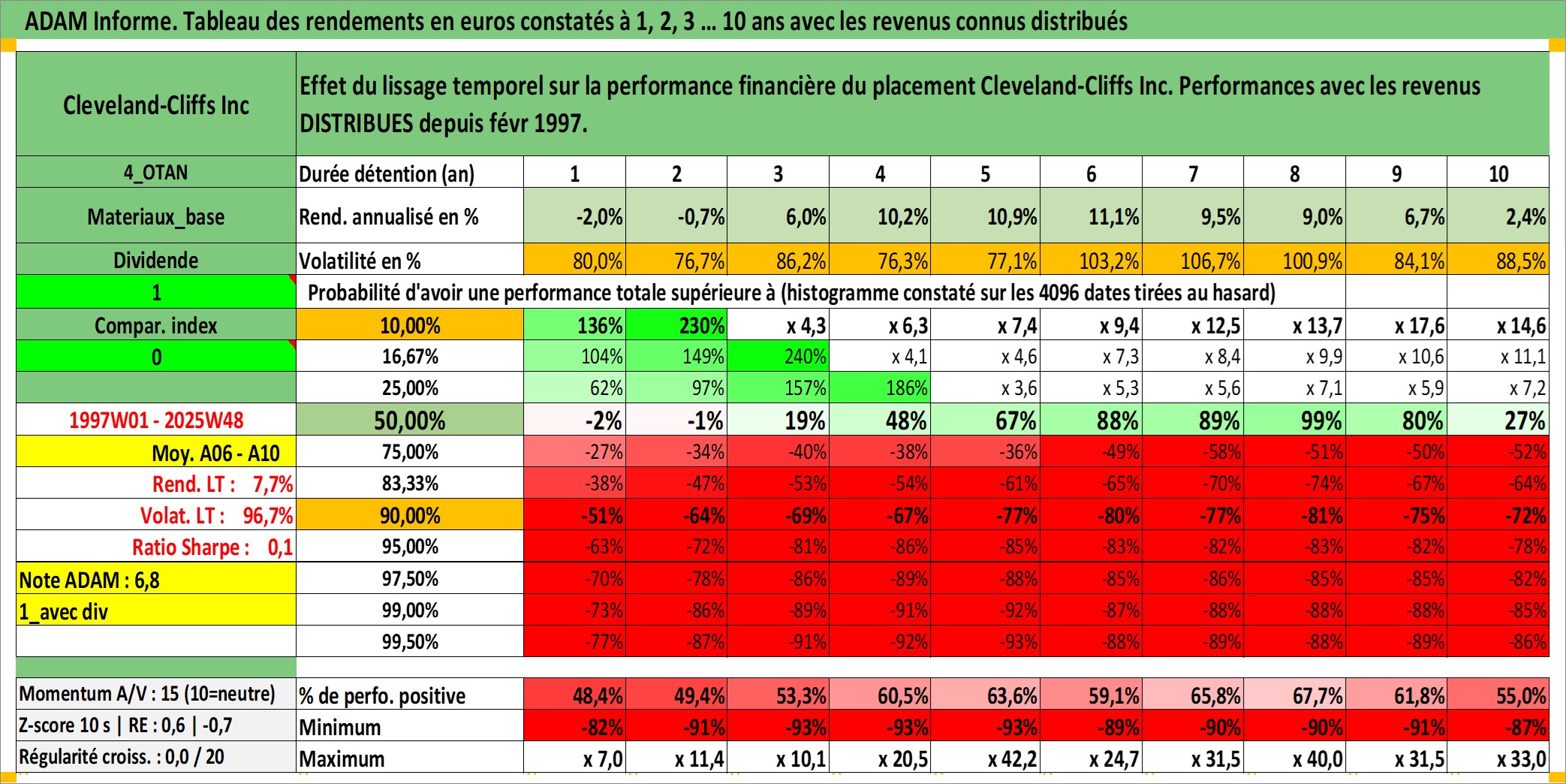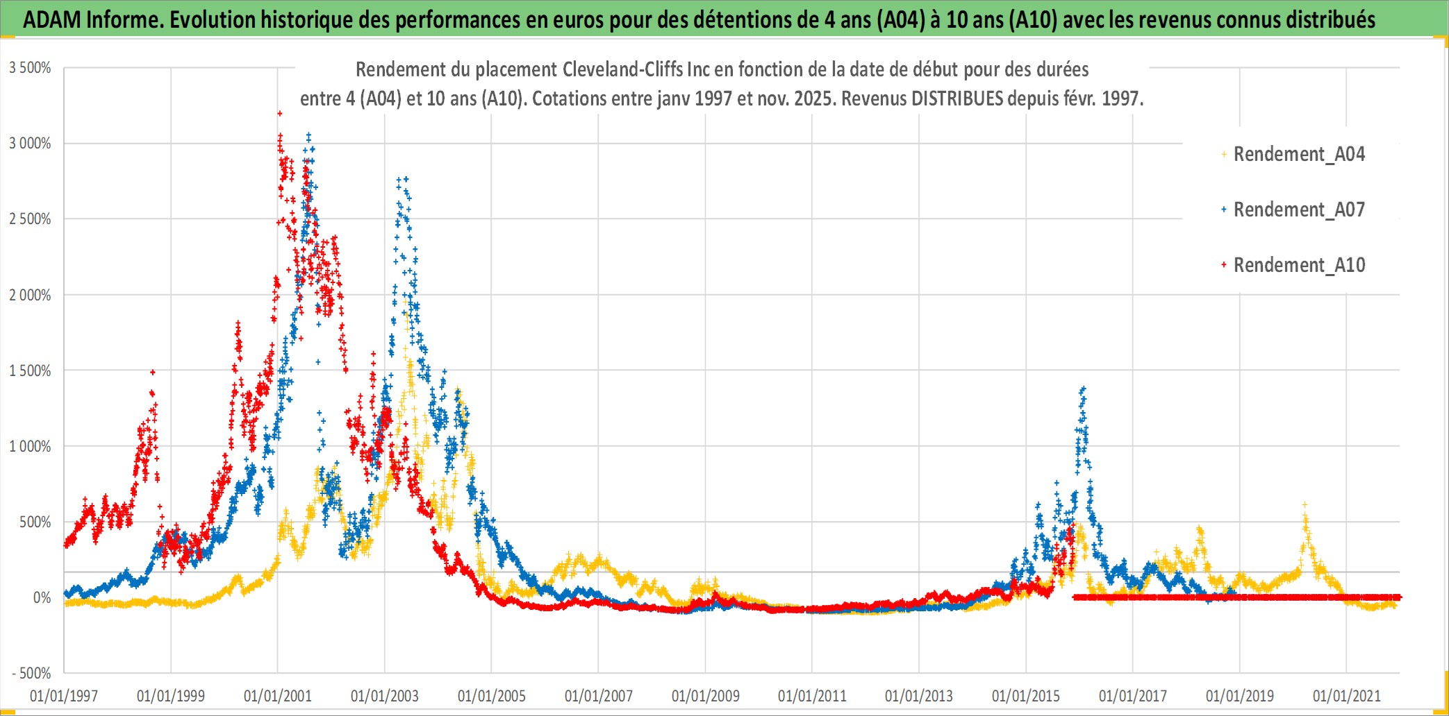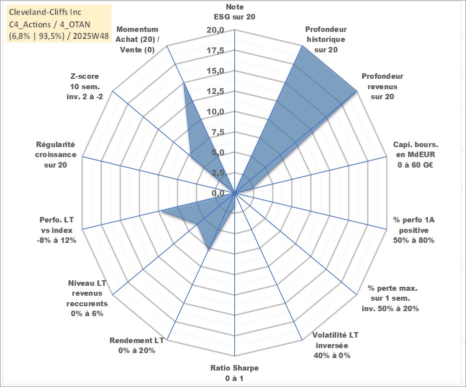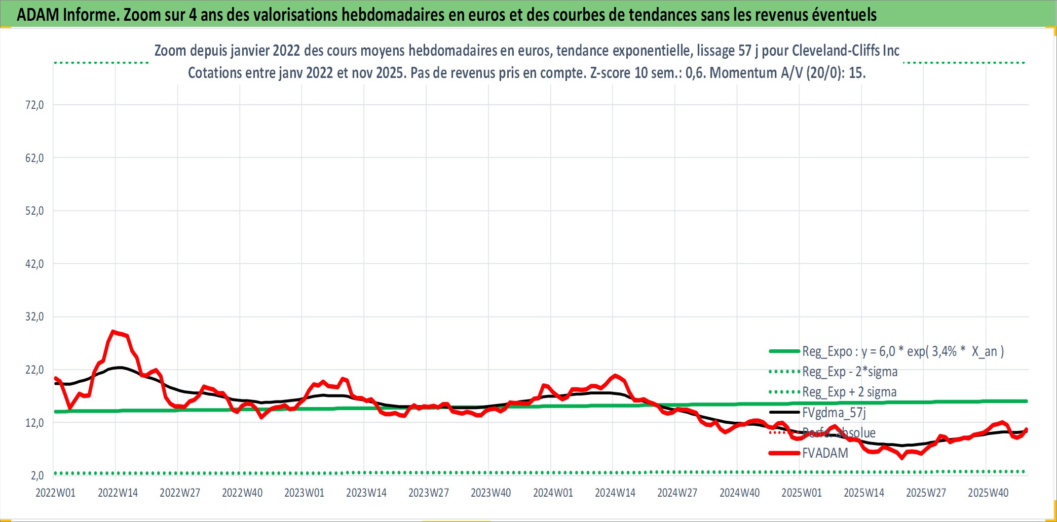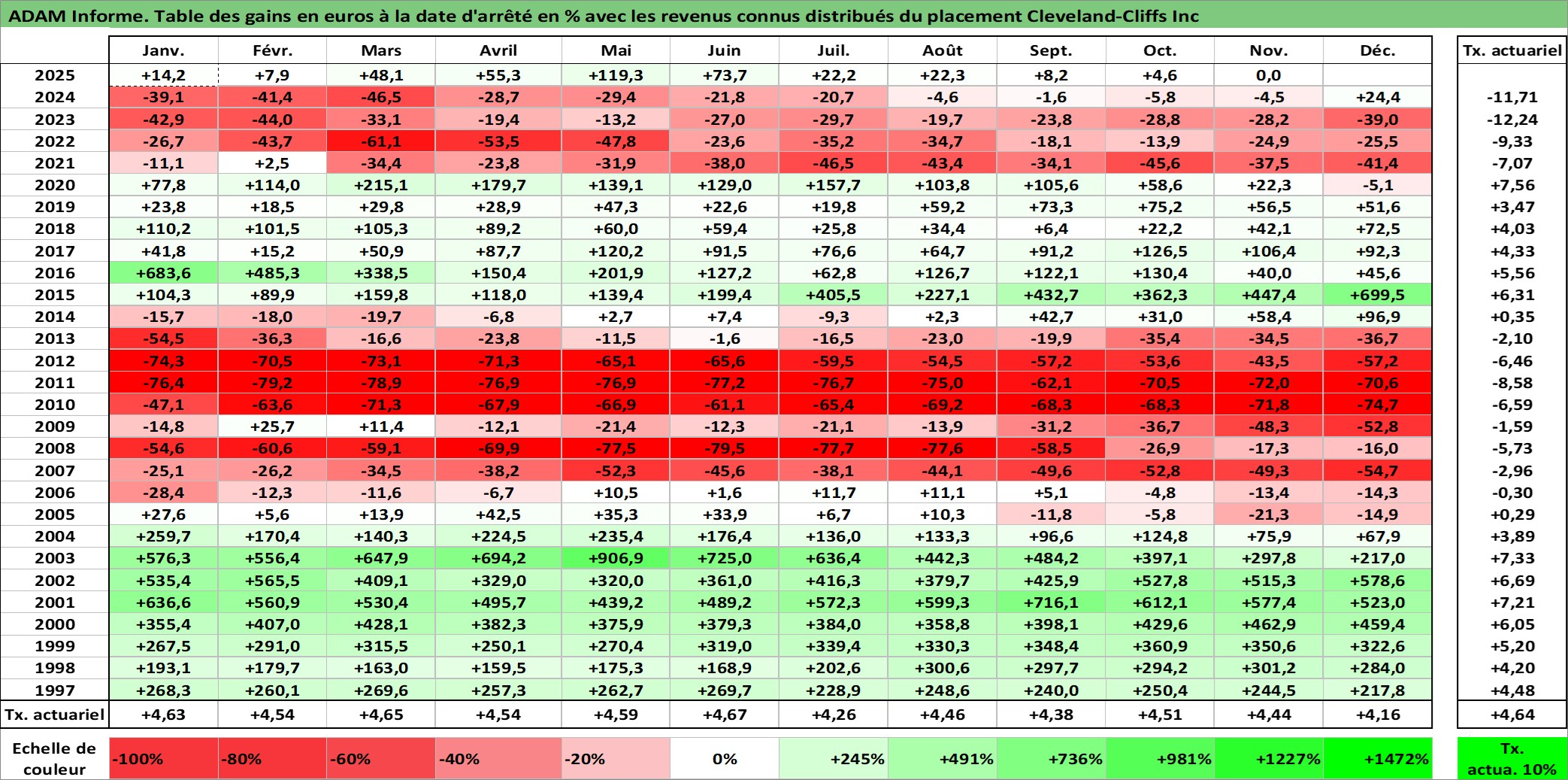 Site dédié aux investisseursPage dédiée sur site financeAnalyse des valorisations hebdomadaires de l'action Cleveland-Cliffs Inc. Cet actif est cote en USD. Les valorisations sont en contrevaleur EURO et couvrent les semaines 1997W01 a 2025W48. Les revenus de cet actif financier sont pris en compte depuis la semaine 1997W08. La note ESG de cet actif n'est pas connue.