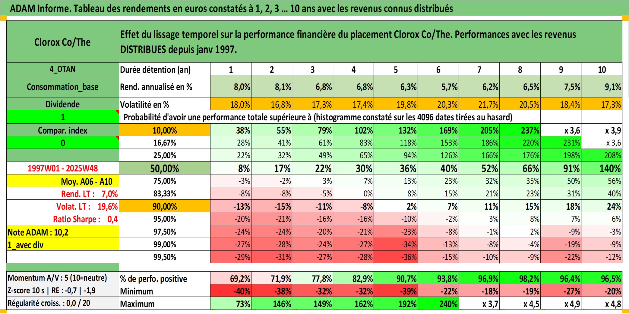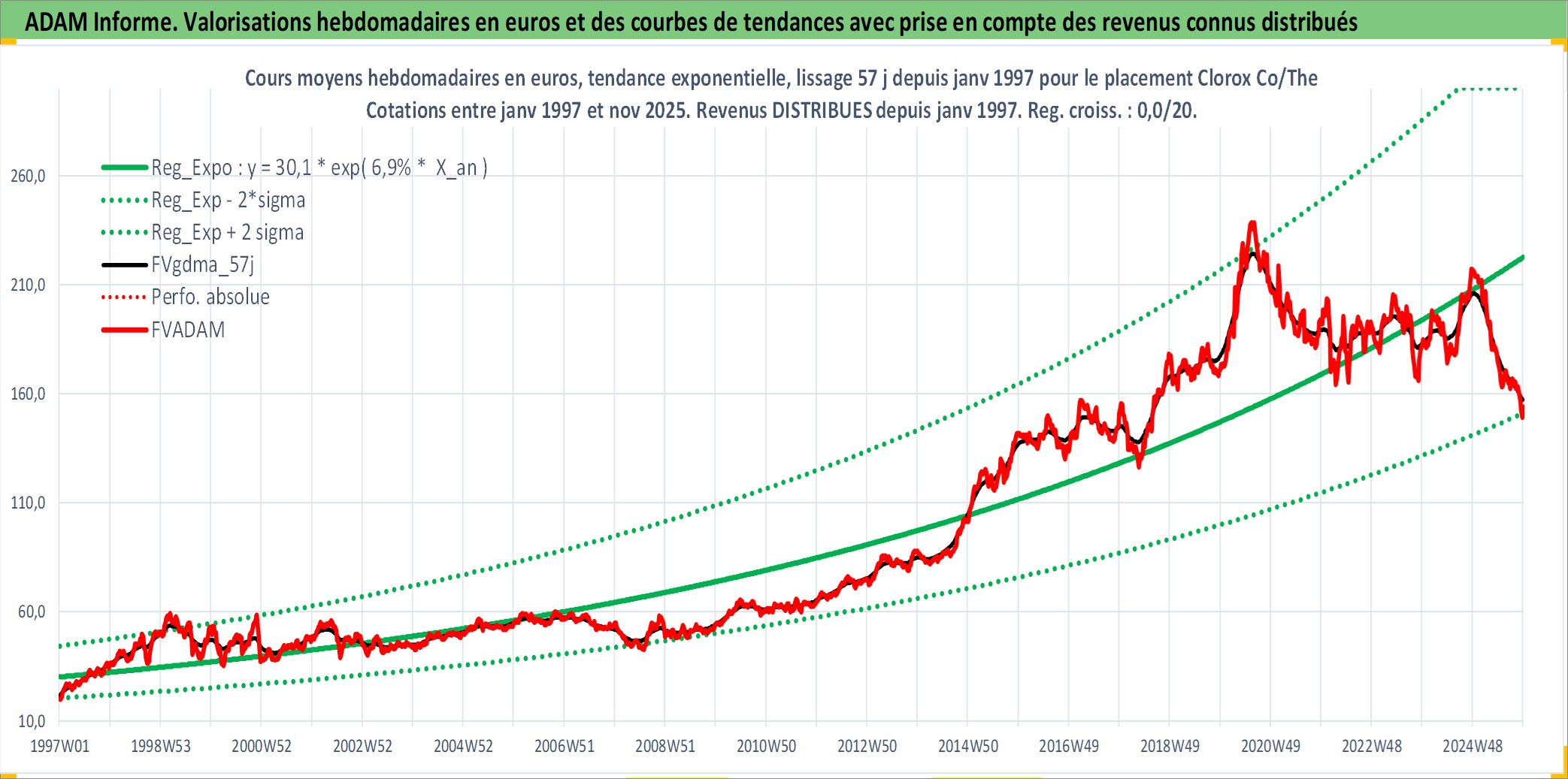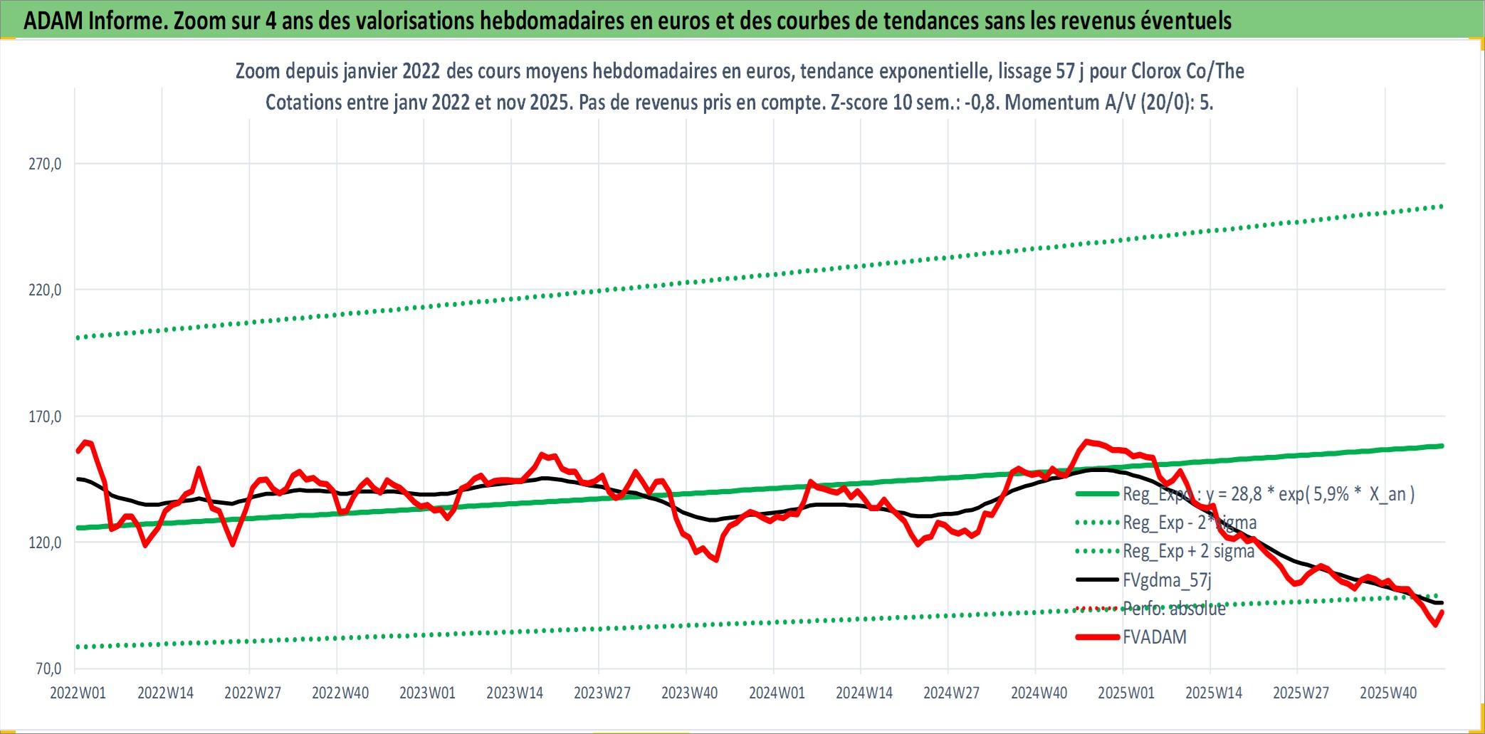 Site dédié aux investisseursPage dédiée sur site financeAnalyse des valorisations hebdomadaires de l'action Clorox Co/The. Cet actif est cote en USD. Les valorisations sont en contrevaleur EURO et couvrent les semaines 1997W01 a 2025W48. Les revenus de cet actif financier sont pris en compte depuis la semaine 1997W05. La note globale ESG de cet actif est estimee a 10.0 (apres rebasage entre 0 et 20).