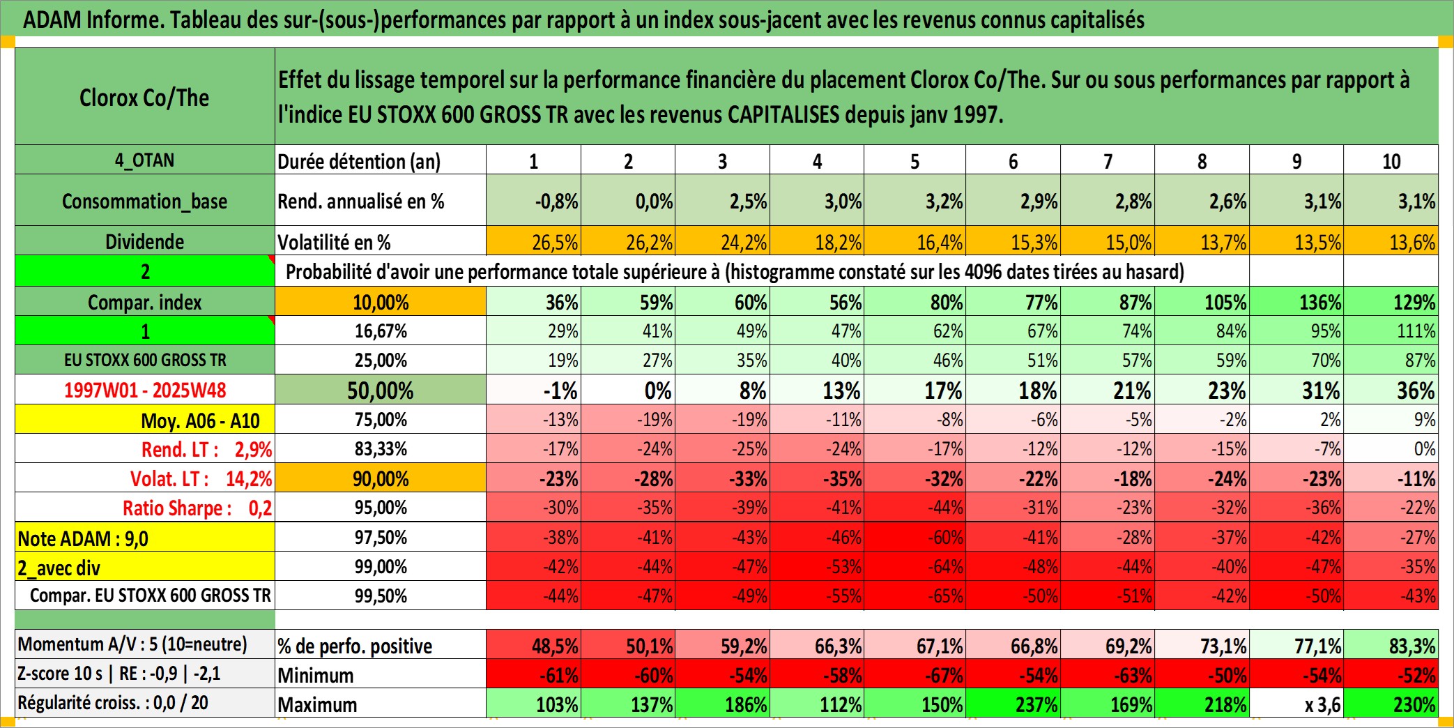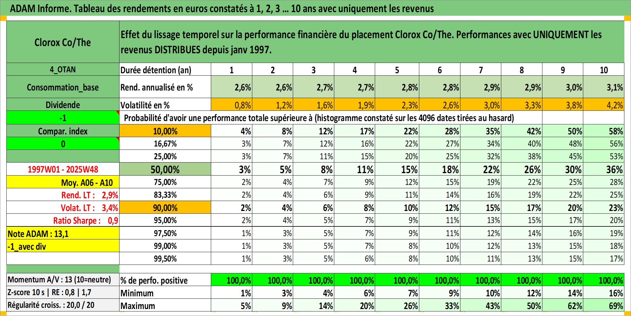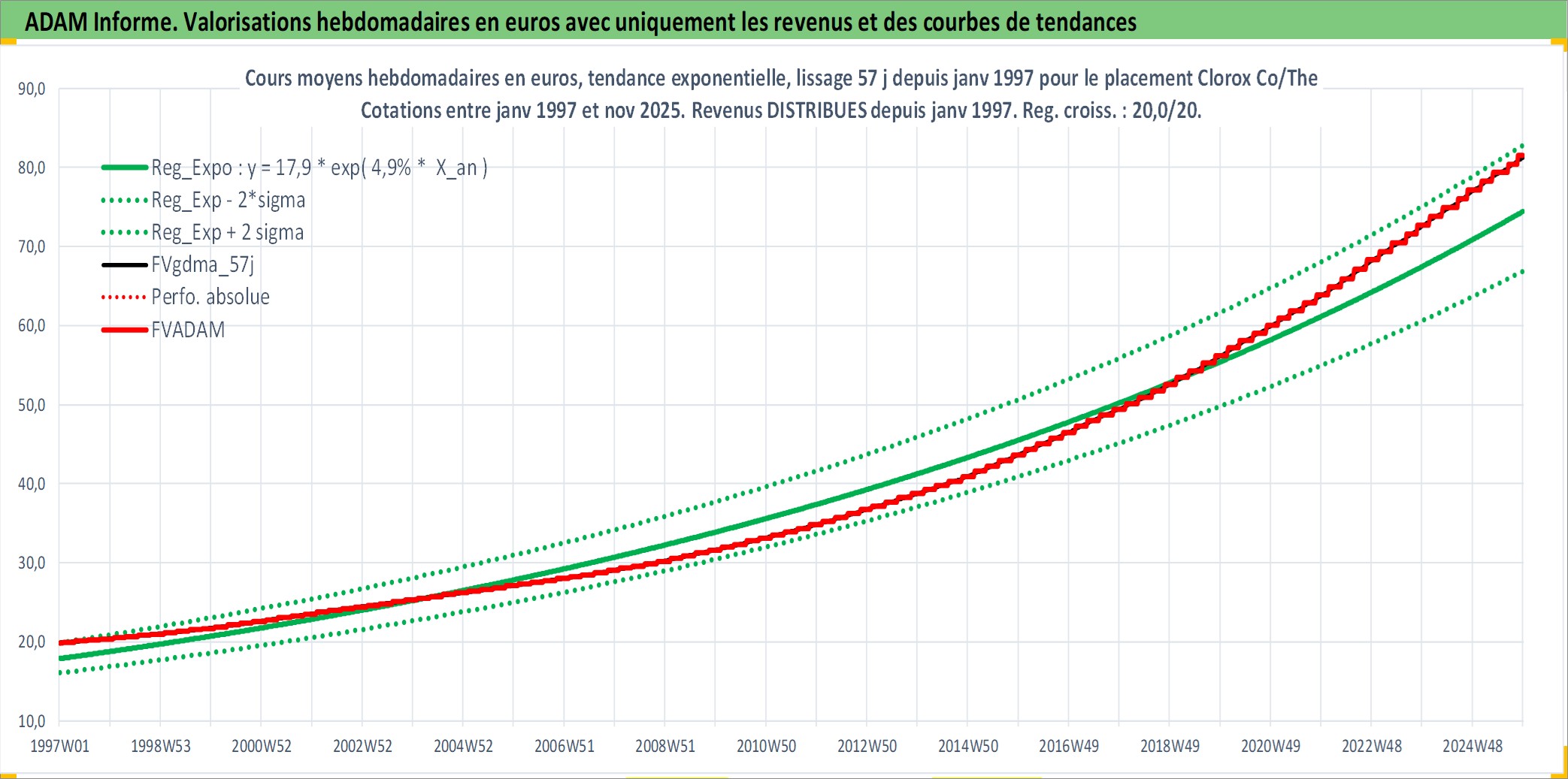 Site dédié aux investisseursPage dédiée sur site financeAnalyse des valorisations hebdomadaires de l'action Clorox Co/The. Cet actif est cote en USD. Les valorisations sont en contrevaleur EURO et couvrent les semaines 1997W01 a 2025W48. Les revenus de cet actif financier sont pris en compte depuis la semaine 1997W05. La note globale ESG de cet actif est estimee a 10.0 (apres rebasage entre 0 et 20).
