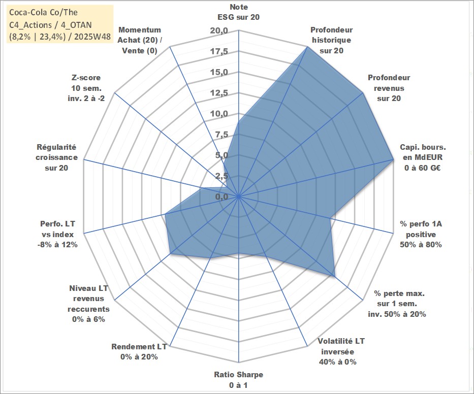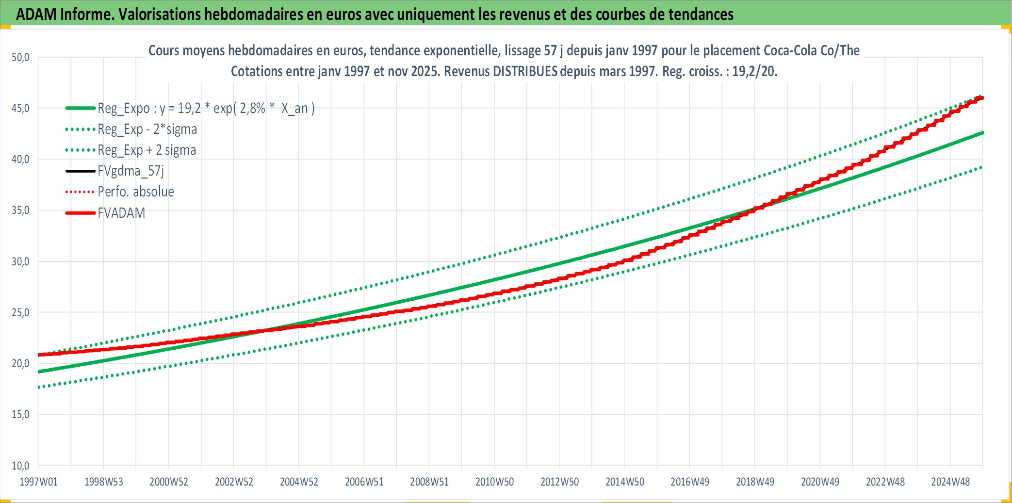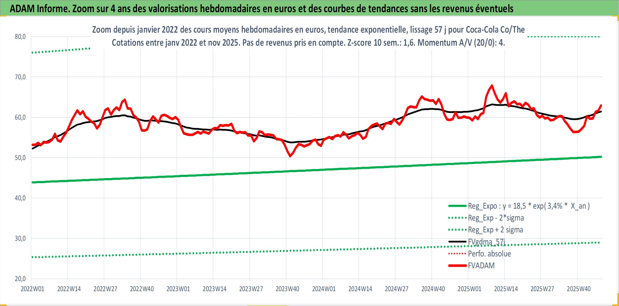 Site dédié aux investisseursPage dédiée sur site financeAnalyse des valorisations hebdomadaires de l'action Coca-Cola Co/The. Cet actif est cote en USD. Les valorisations sont en contrevaleur EURO et couvrent les semaines 1997W01 a 2025W48. Les revenus de cet actif financier sont pris en compte depuis la semaine 1997W11. La note globale ESG de cet actif est estimee a 9.0 (apres rebasage entre 0 et 20).